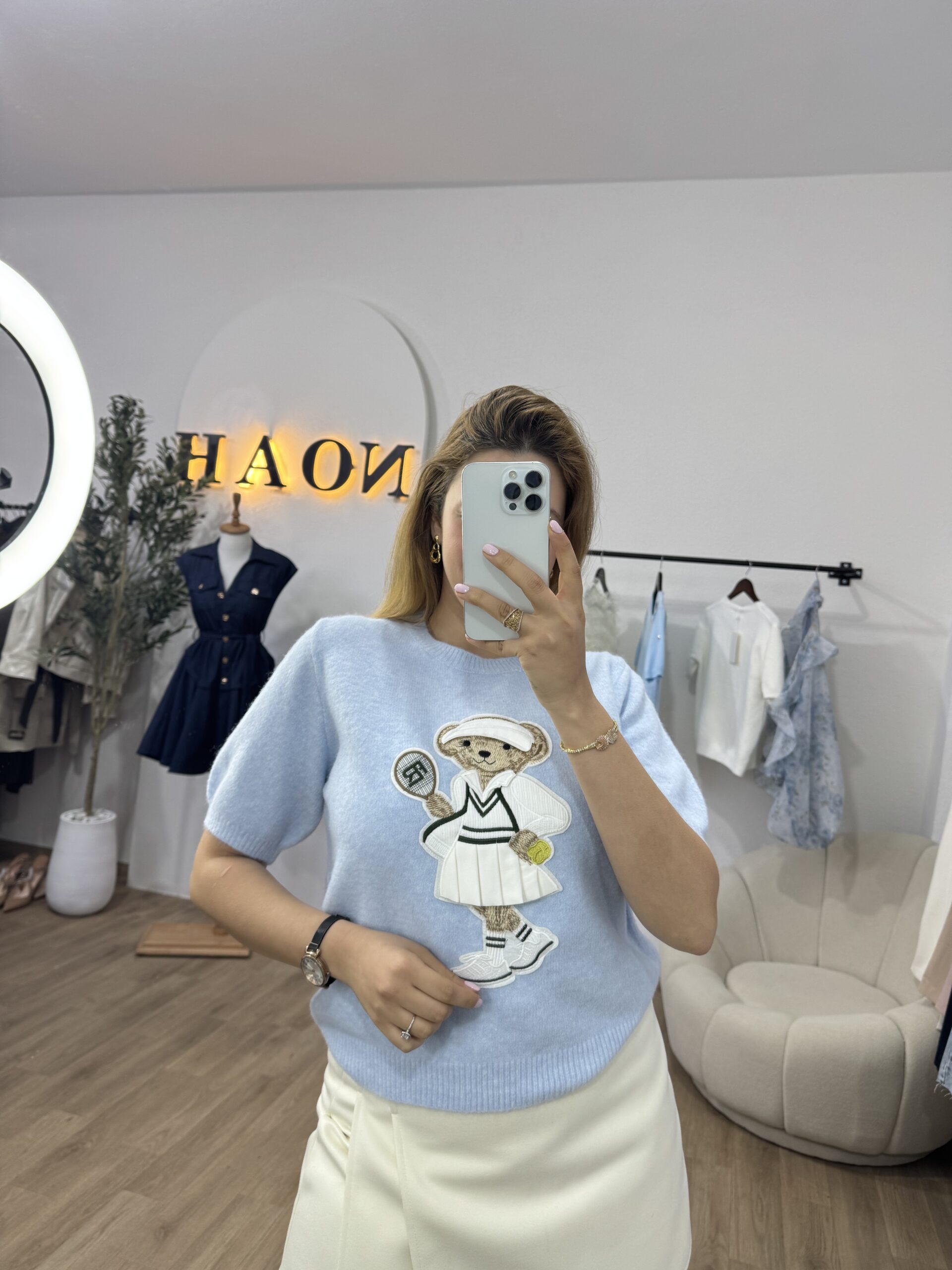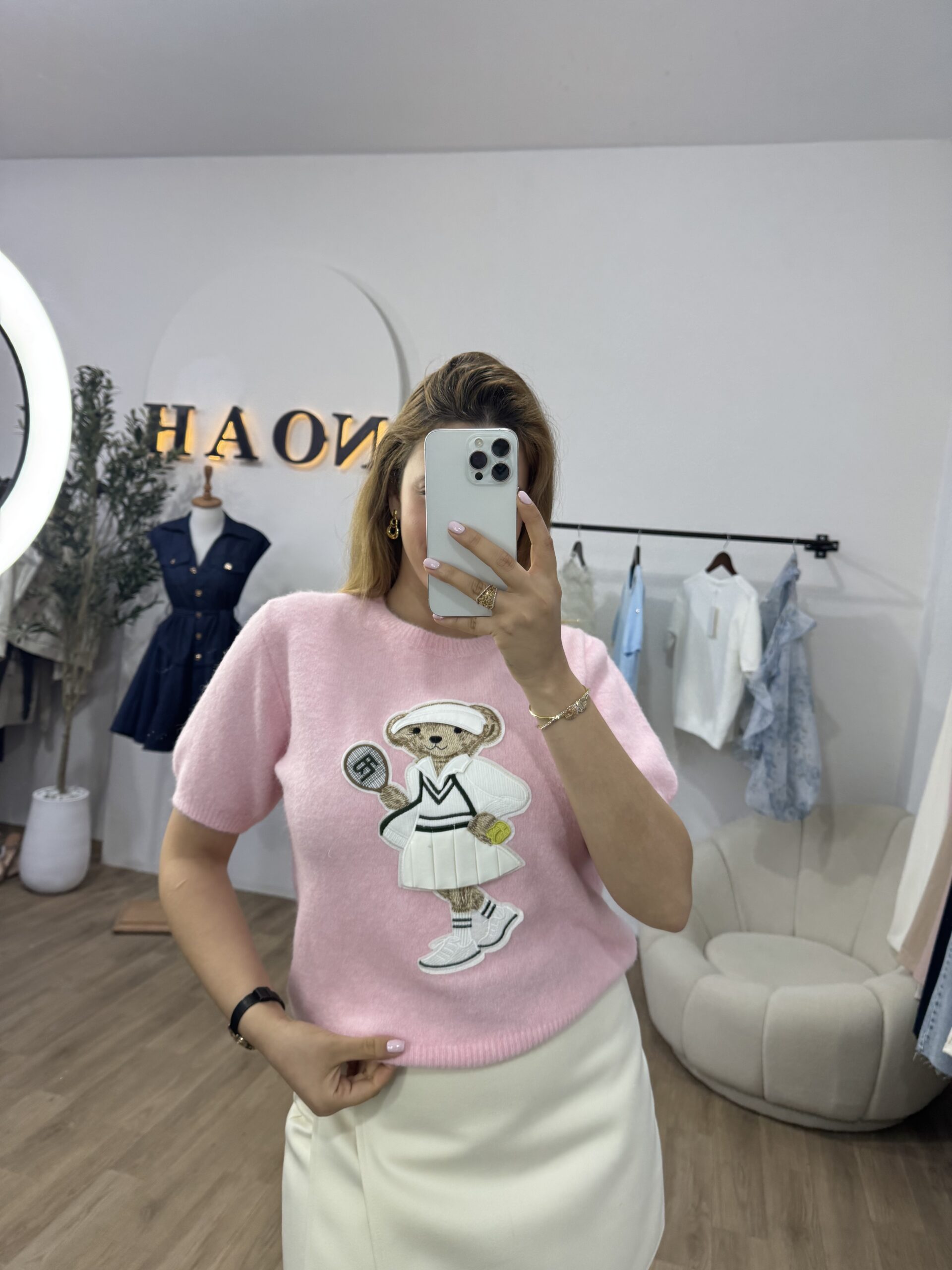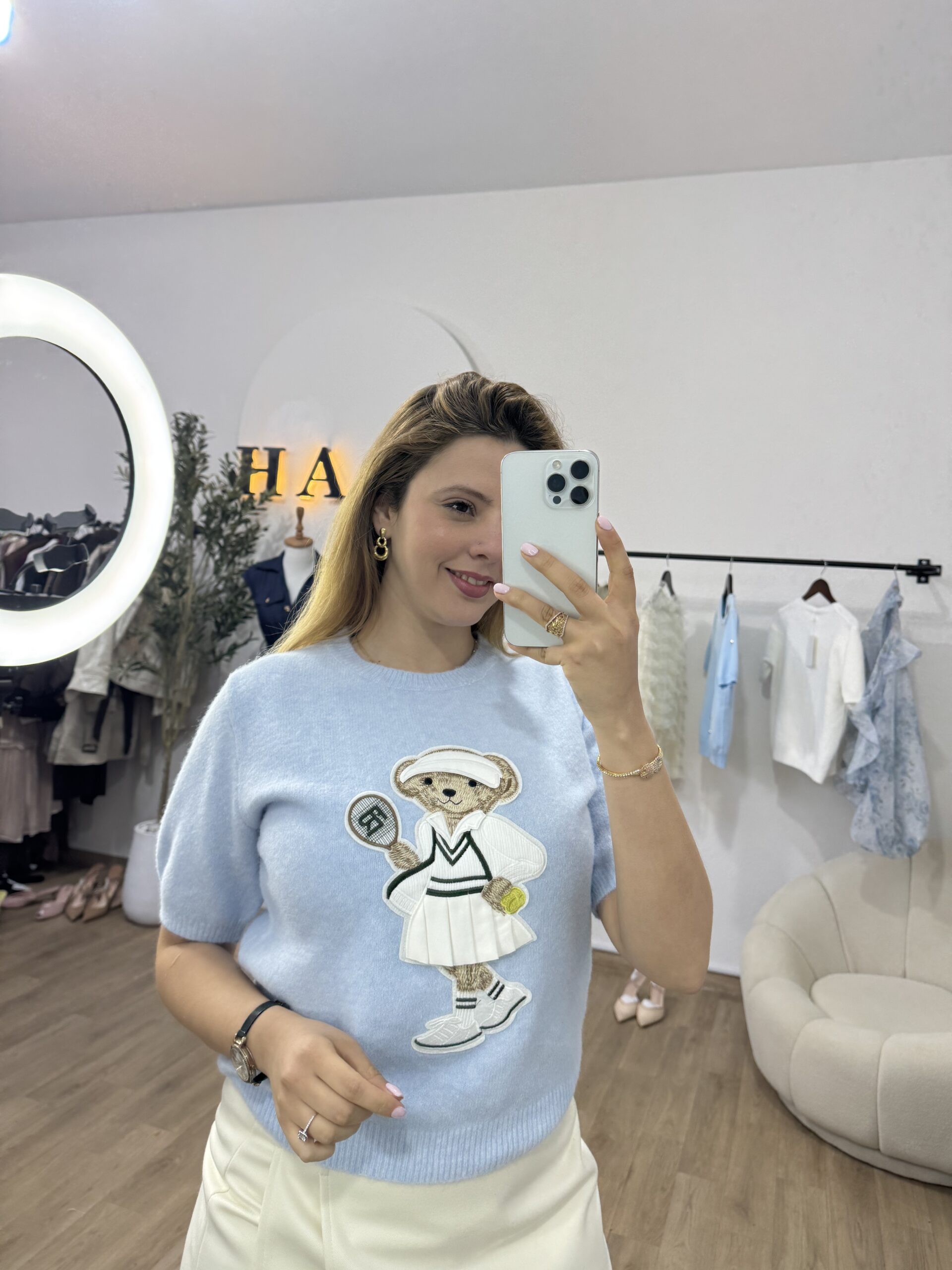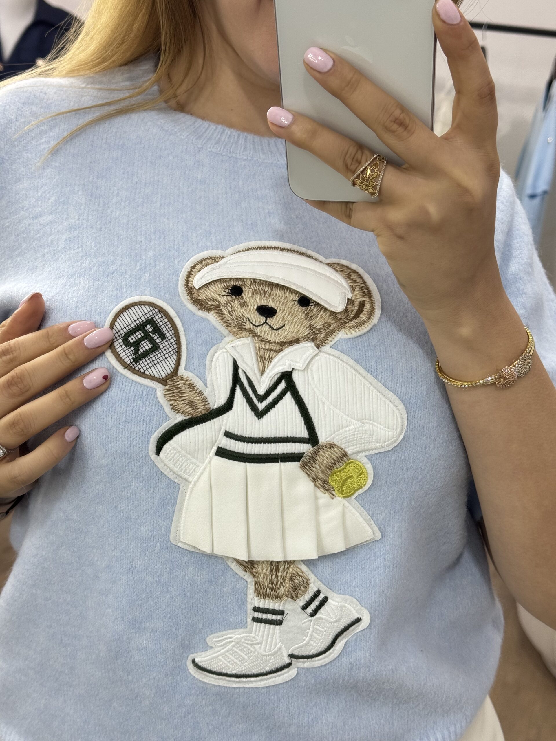 Pull doux et confortable au style casual chic, décoré d’un adorable motif teddy joueur de tennis pour une touche tendance et originale. Sa coupe féminine et ses manches courtes offrent une silhouette élégante et facile à porter au quotidien. Confectionné dans une maille agréable, il se marie aussi bien avec une jupe qu’un pantalon pour un look raffiné et décontracté.