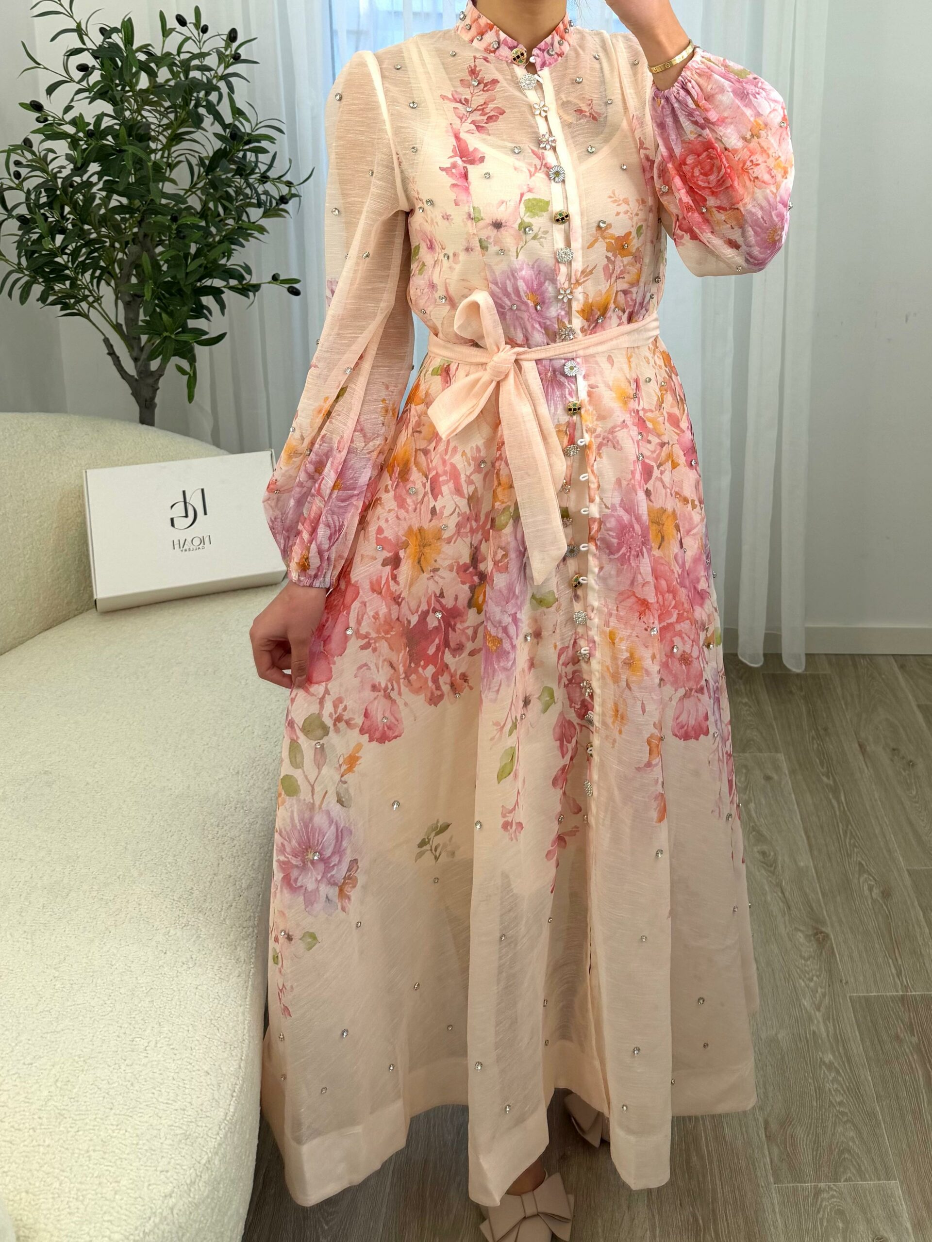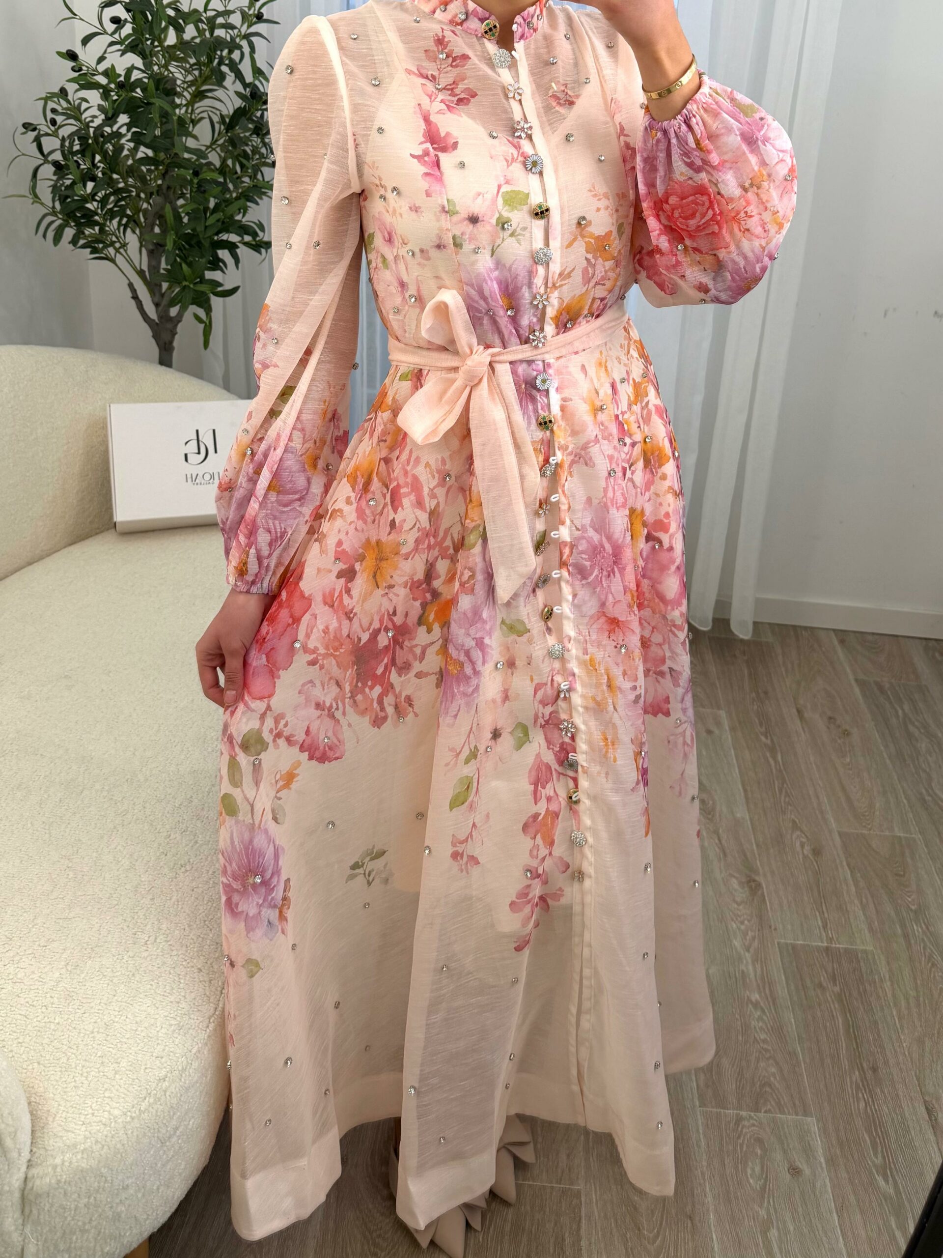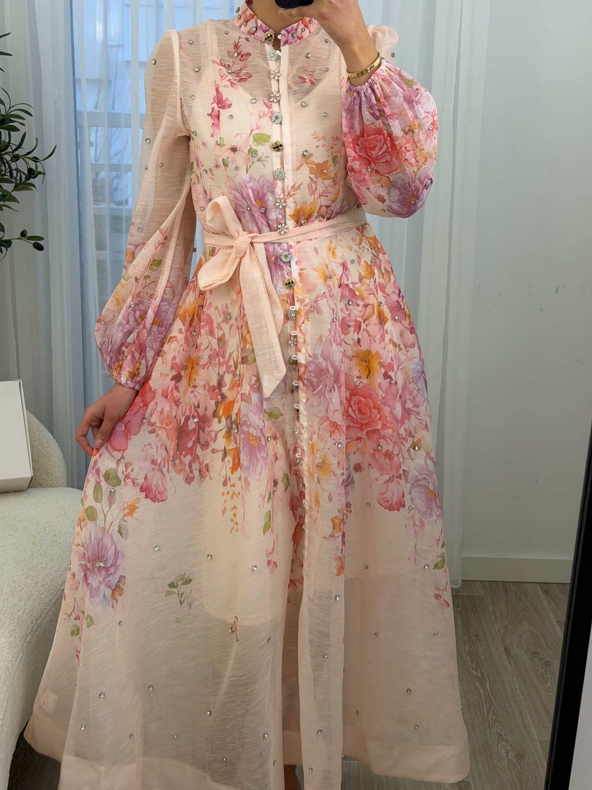 Robe longue au style romantique et raffiné, confectionnée dans un tissu léger et fluide, ornée d’un imprimé floral délicat aux tons pastel. Elle se distingue par ses manches bouffantes élégantes, ses petits détails brillants subtils et sa ceinture à nouer qui souligne joliment la taille. Sa coupe fluide apporte confort et féminité, parfaite pour les occasions spéciales, les sorties chic ou les événements printaniers et estivaux. Une pièce douce et élégante qui allie charme et sophistication 🌸