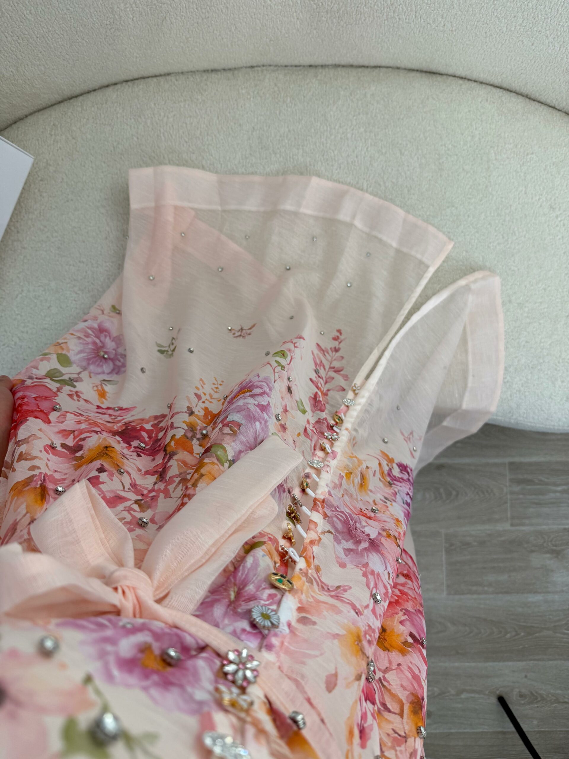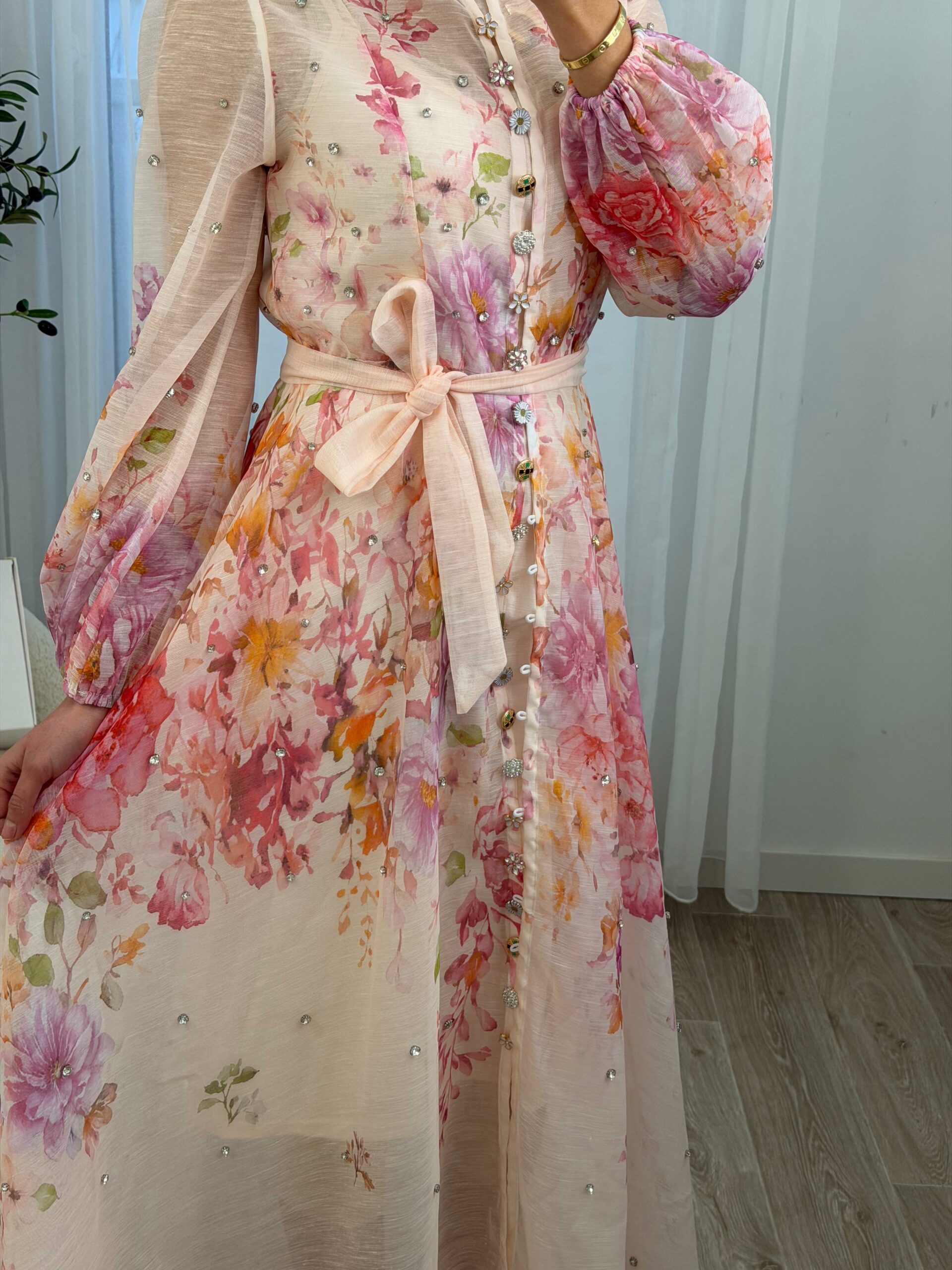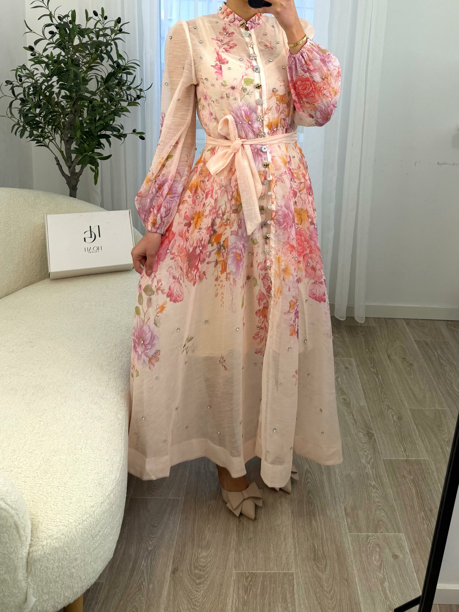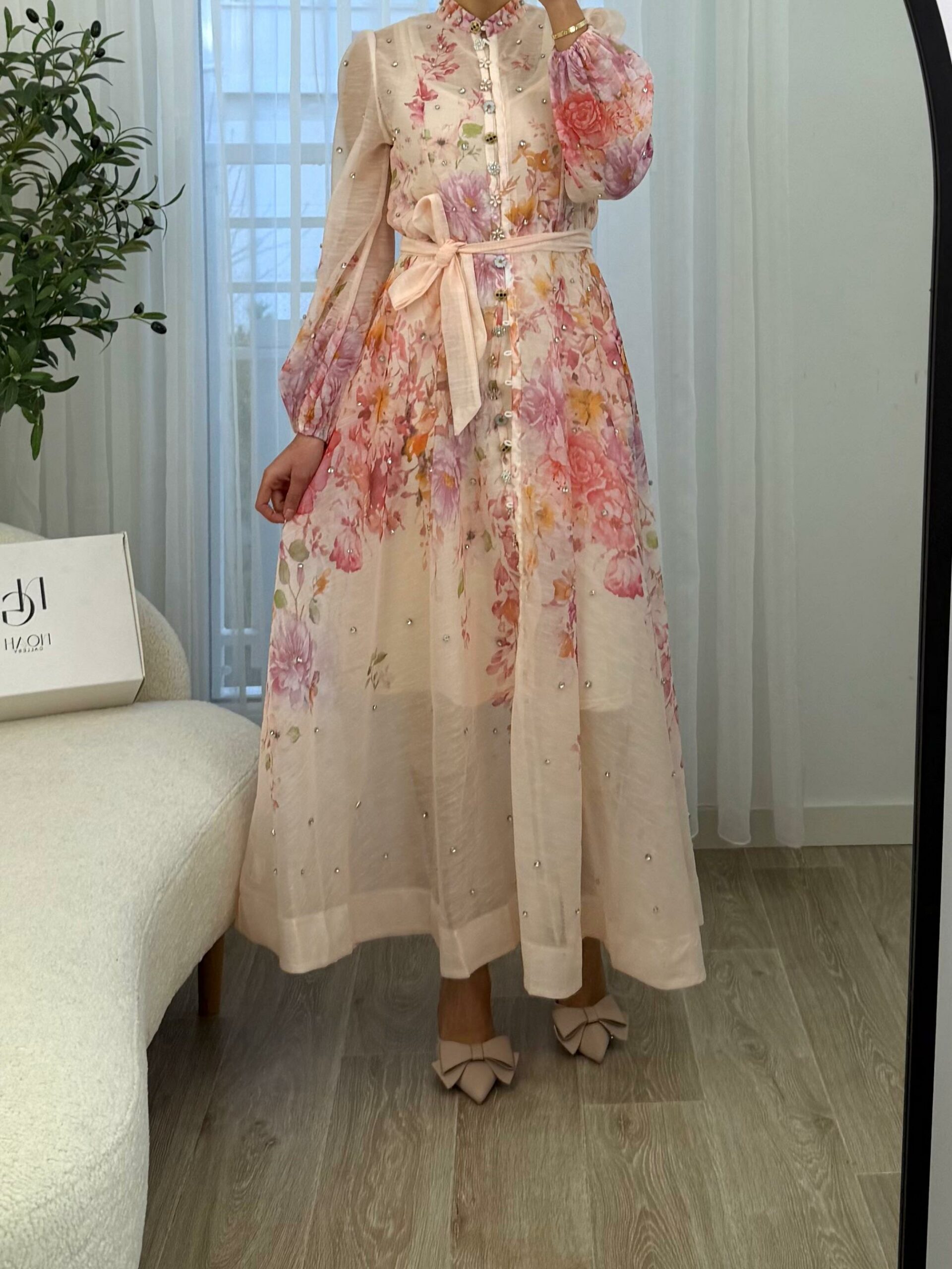 Robe longue au style romantique et raffiné, confectionnée dans un tissu léger et fluide, ornée d’un imprimé floral délicat aux tons pastel. Elle se distingue par ses manches bouffantes élégantes, ses petits détails brillants subtils et sa ceinture à nouer qui souligne joliment la taille. Sa coupe fluide apporte confort et féminité, parfaite pour les occasions spéciales, les sorties chic ou les événements printaniers et estivaux. Une pièce douce et élégante qui allie charme et sophistication 🌸
