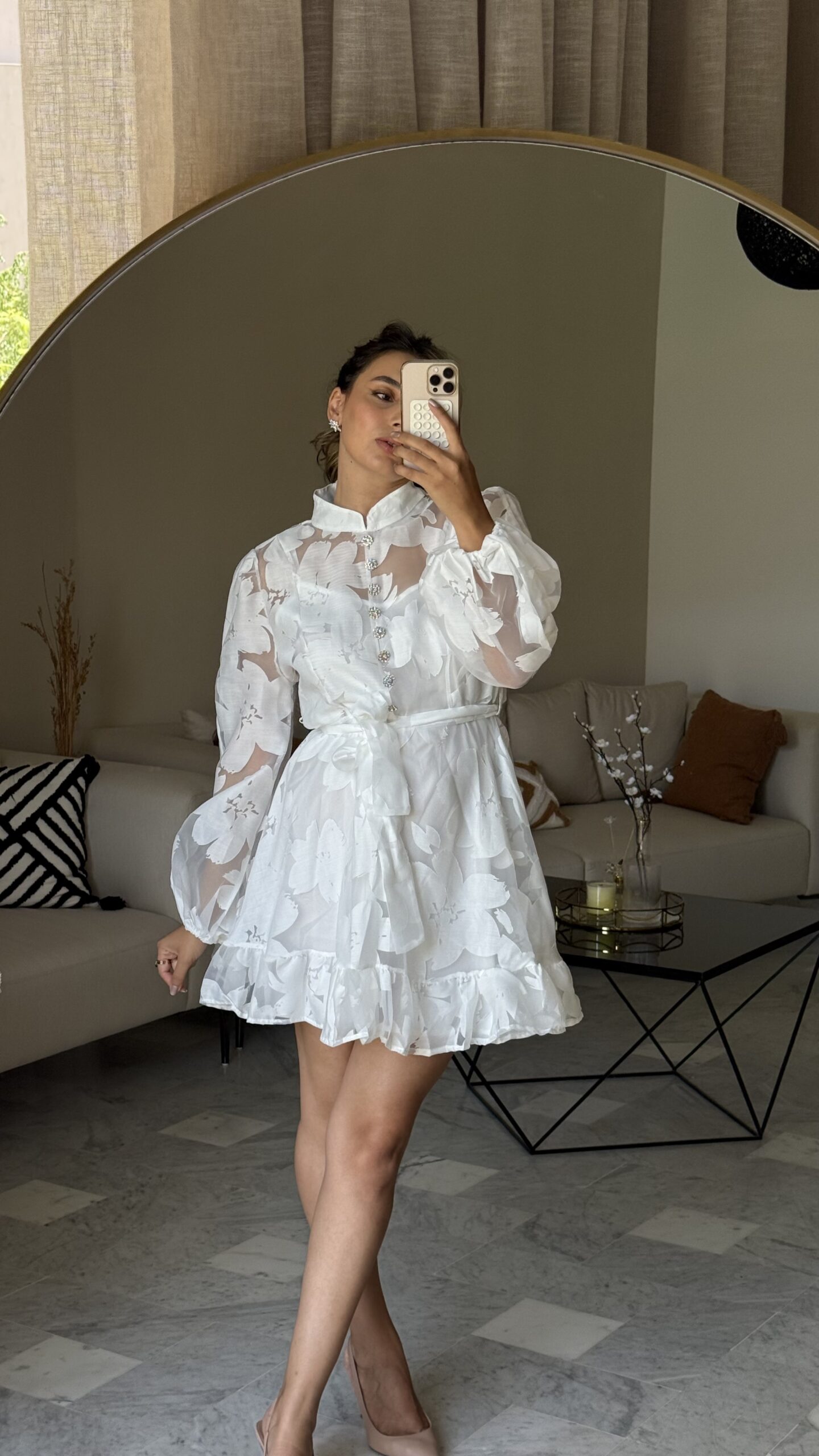 élicate et aérienne, cette robe évoque un jardin matinal baigné de rosée. Son voile de fleurs ton sur ton, ses manches bouffantes et sa coupe cintrée offrent une silhouette romantique et poétique. Un véritable bijou textile.