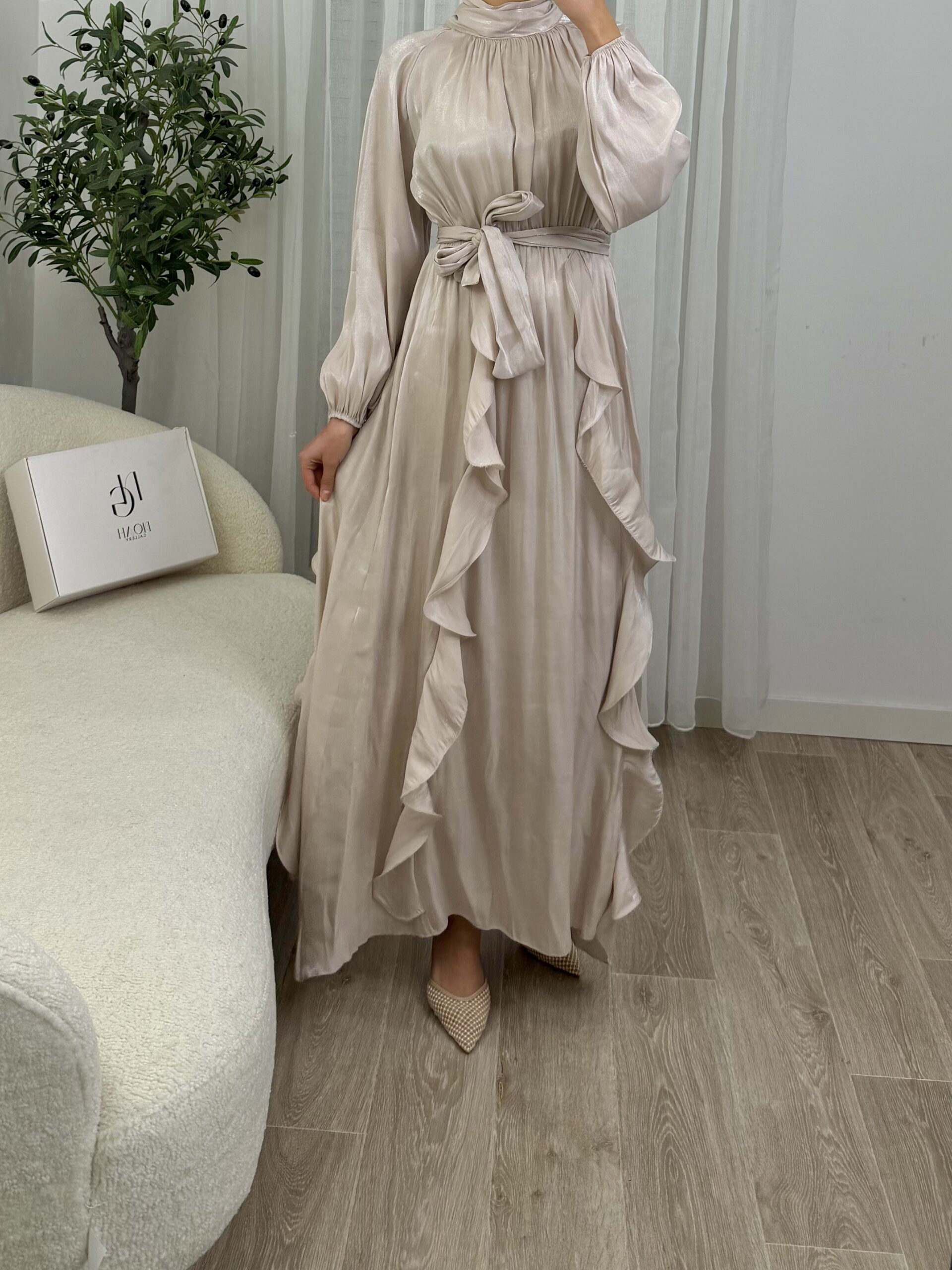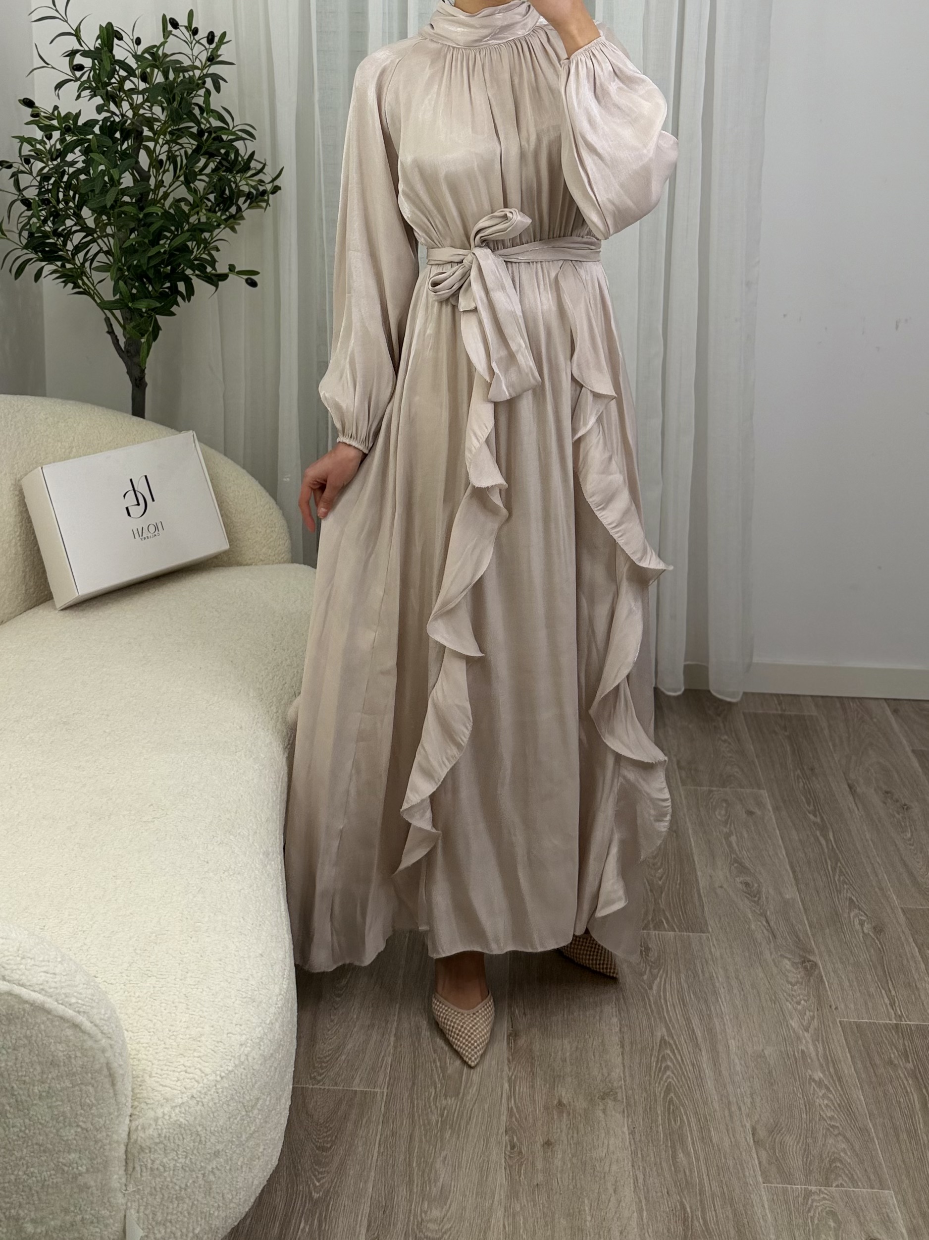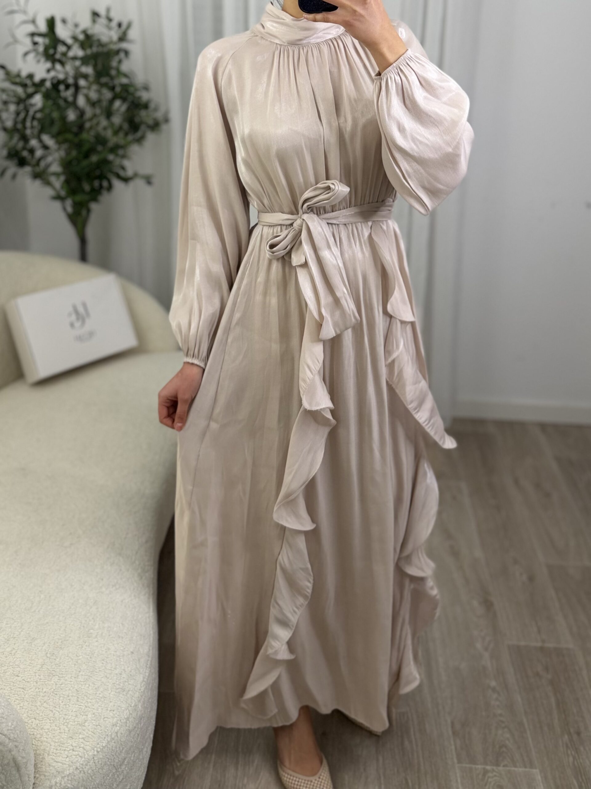Robe longue au tombé fluide et satiné, pensée pour une allure raffinée et féminine. Son col montant, sa taille marquée avec ceinture et ses détails volantés apportent mouvement et sophistication à la silhouette.