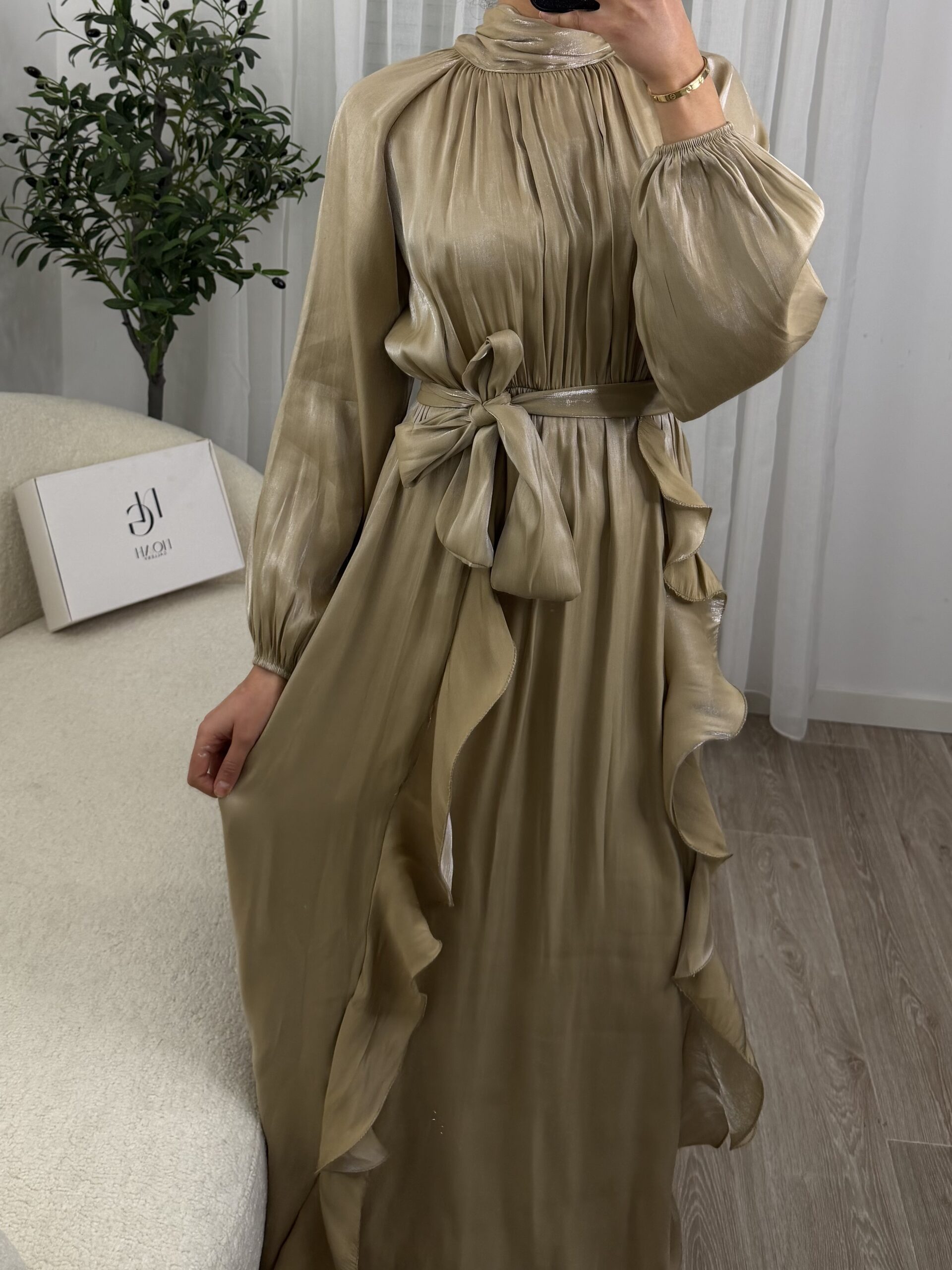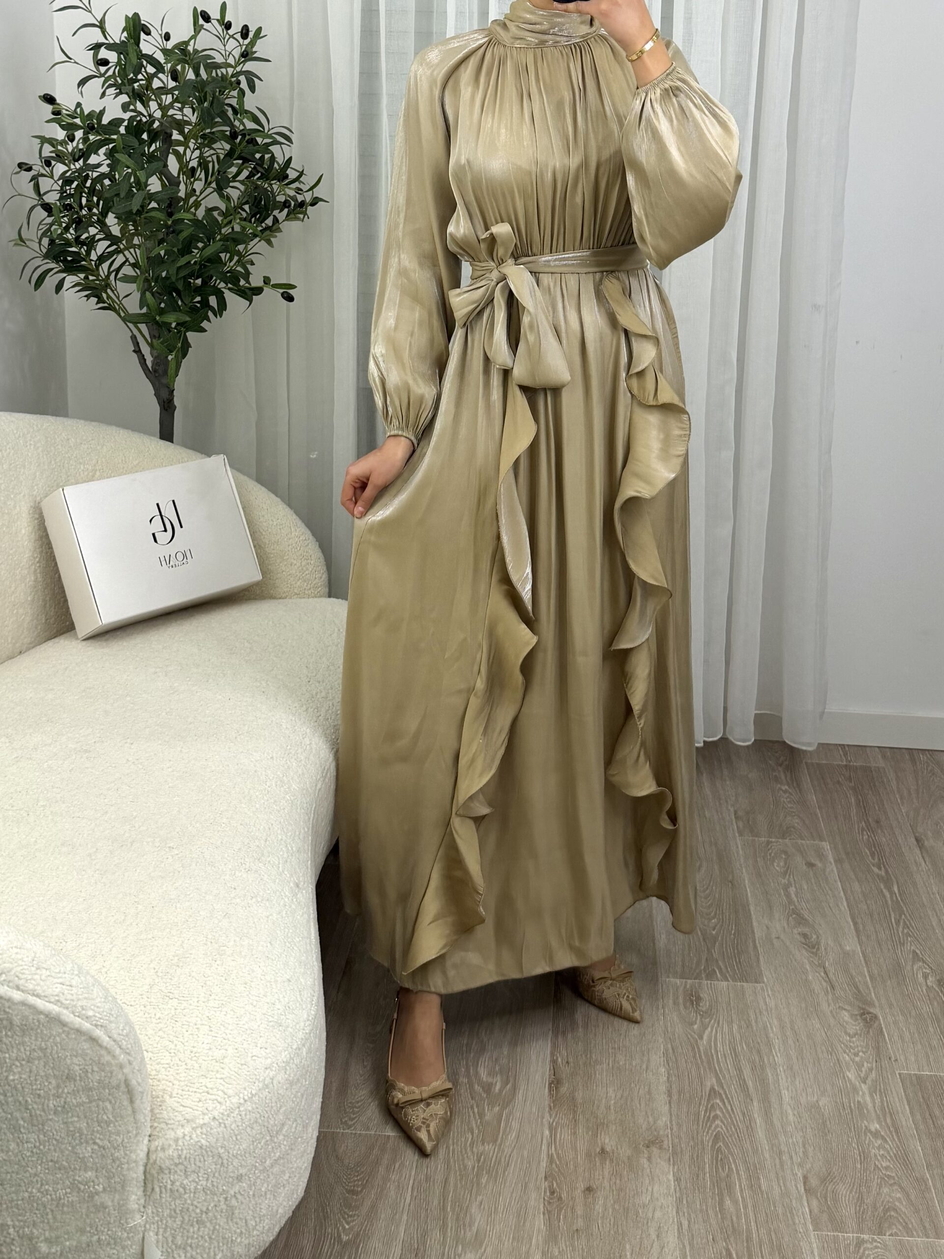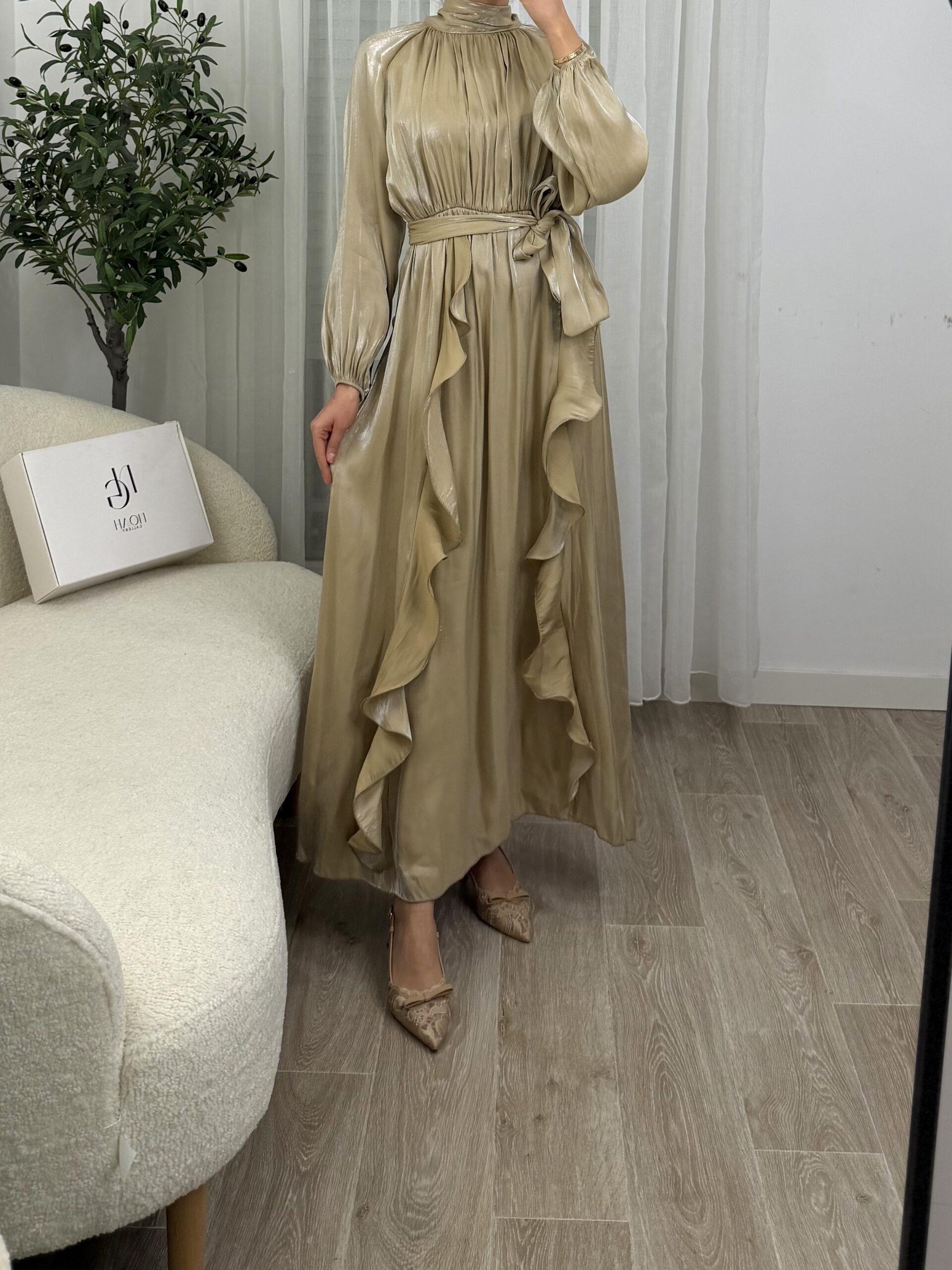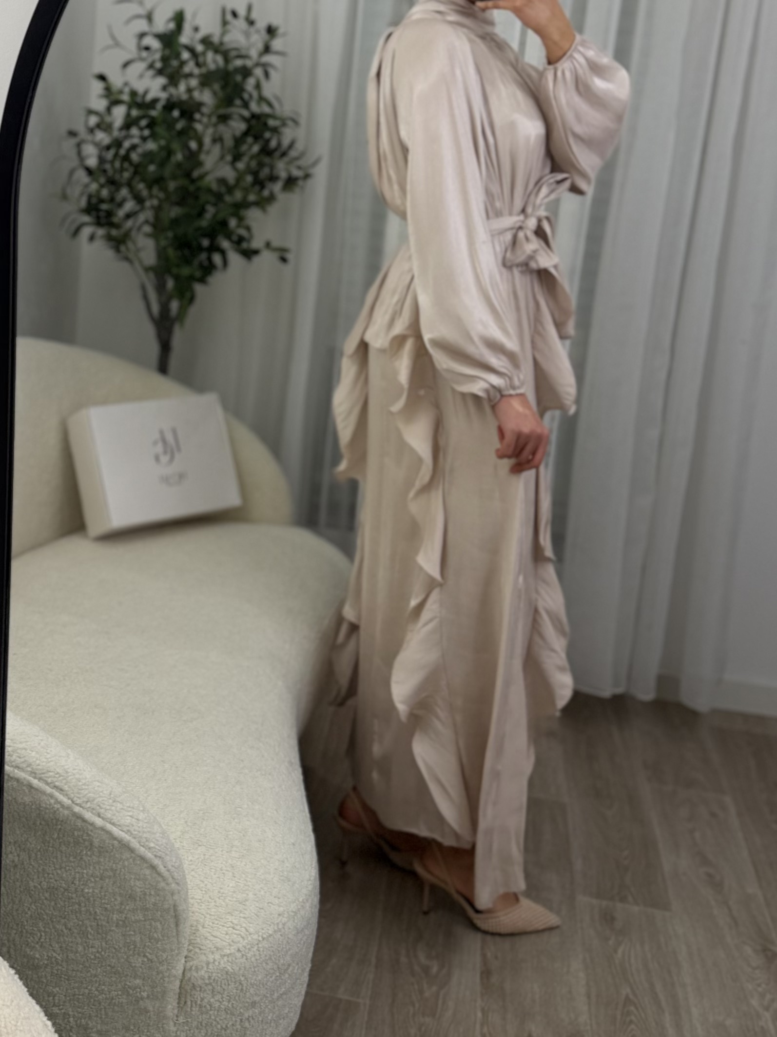 Robe longue au tombé fluide et satiné, pensée pour une allure raffinée et féminine. Son col montant, sa taille marquée avec ceinture et ses détails volantés apportent mouvement et sophistication à la silhouette.