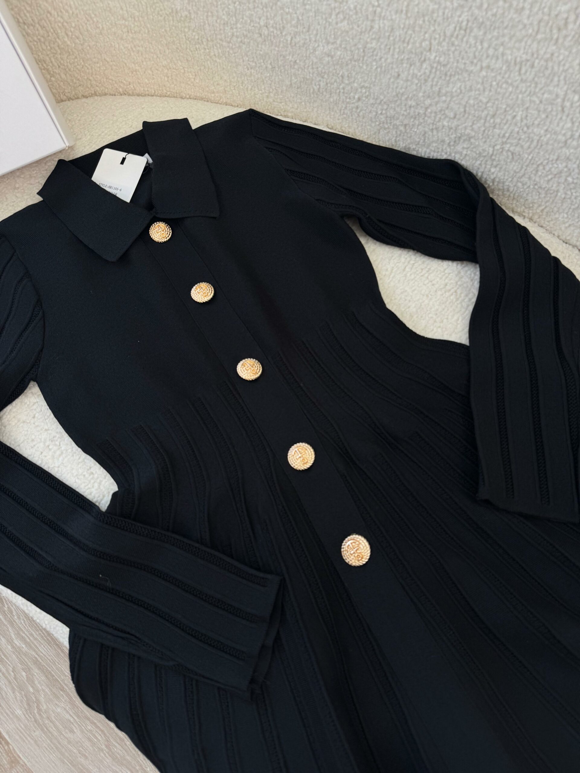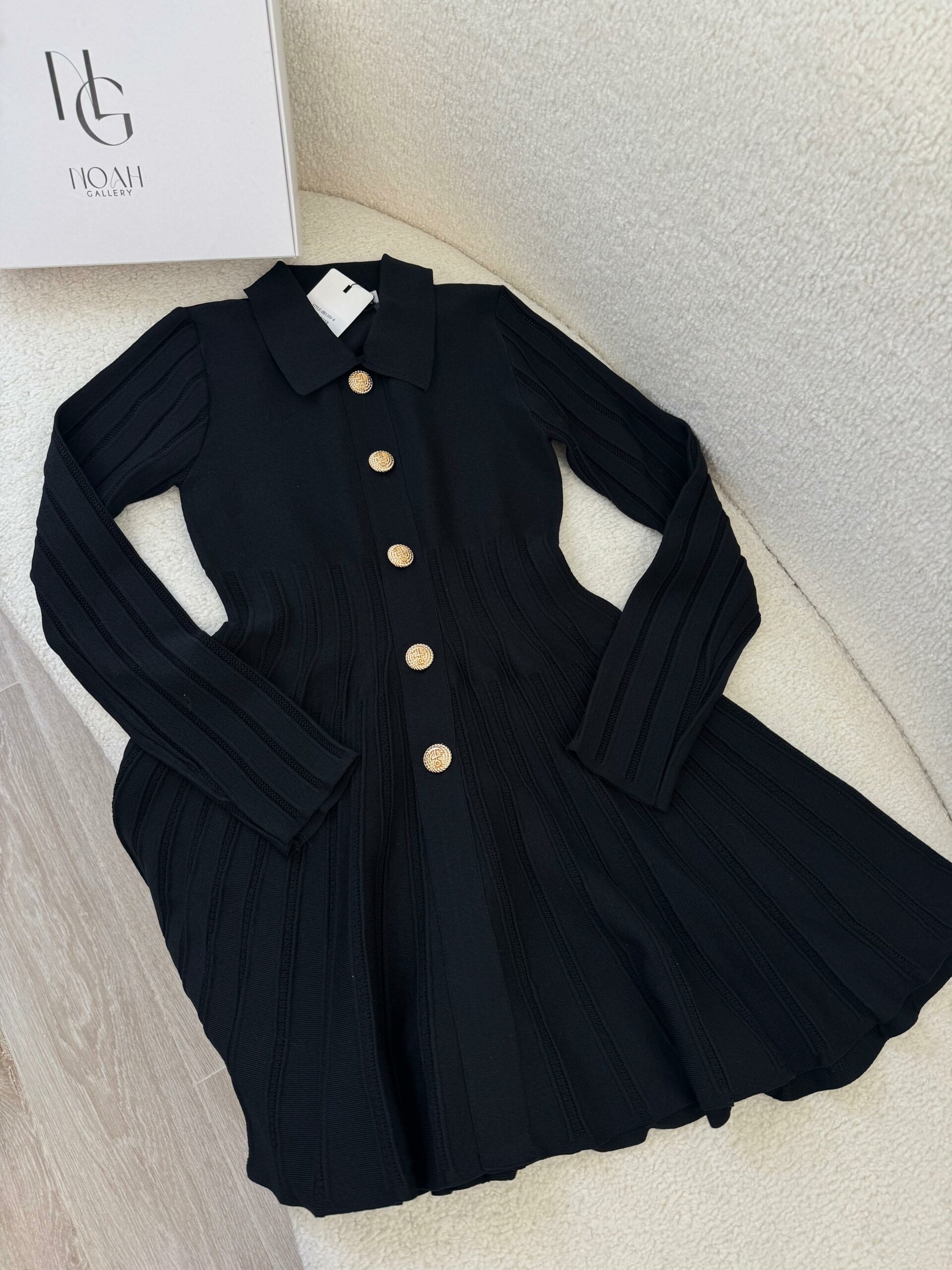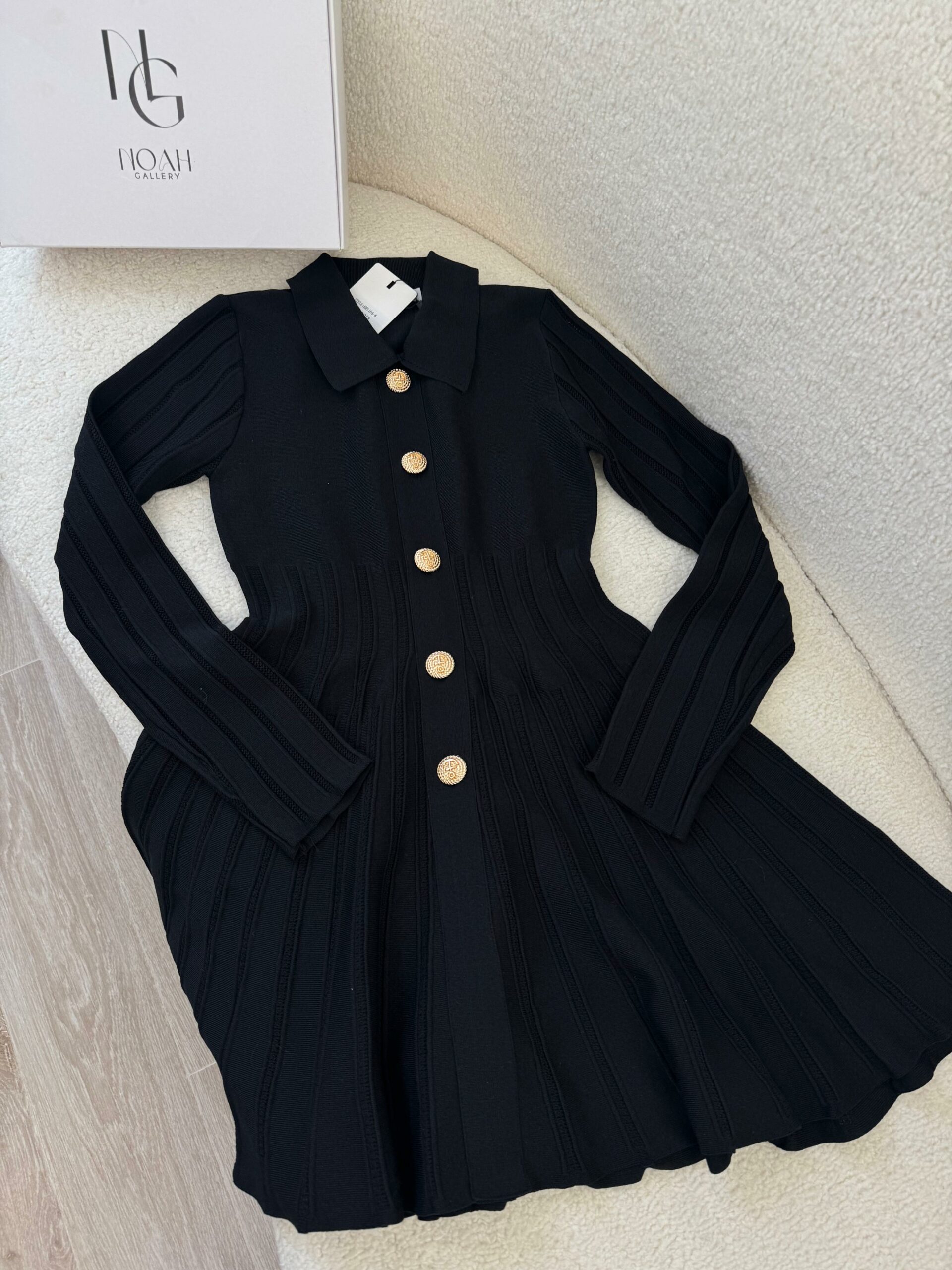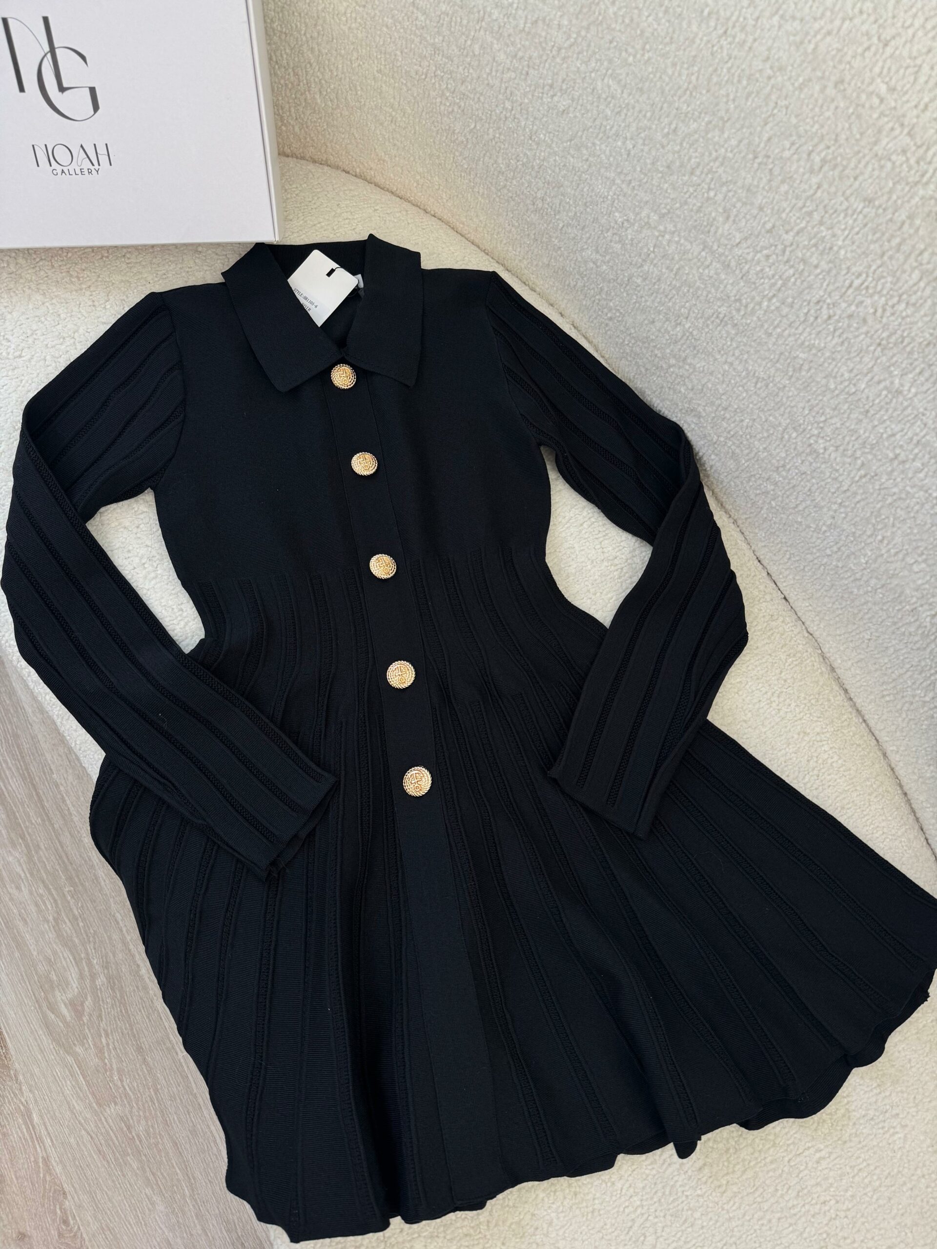 Cette robe noir allie élégance et modernité grâce à sa coupe fluide et son effet plissé qui met en valeur la silhouette. Ses boutons dorés apportent une touche de sophistication et de chic, tandis que son tissu doux et confortable offre un tombé impeccable. Avec son col délicat et sa coupe évasée, elle est parfaite pour créer un look féminin, raffiné et tendance, que ce soit pour une sortie, un dîner ou une occasion spéciale.