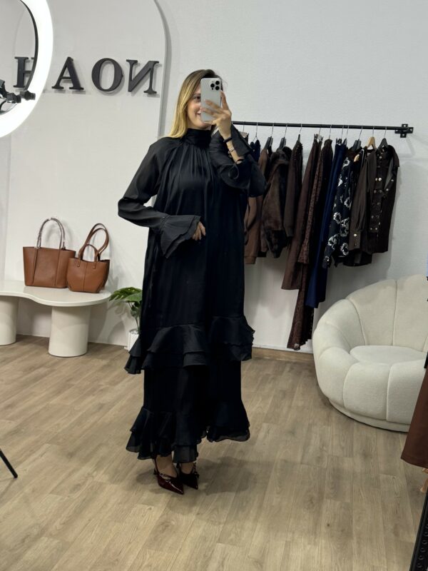 Cette robe longue noire incarne la sophistication et le charme discret. Confectionnée dans un tissu fluide et satiné, elle se distingue par ses manches longues à volants et sa coupe ample qui offre un tombé élégant et aérien. Le détail des volants au bas de la robe ajoute une touche de féminité raffinée, parfaite pour un look chic sans effort. Idéale pour une soirée, un dîner ou une occasion spéciale, cette pièce allie confort et élégance dans un style intemporel.
