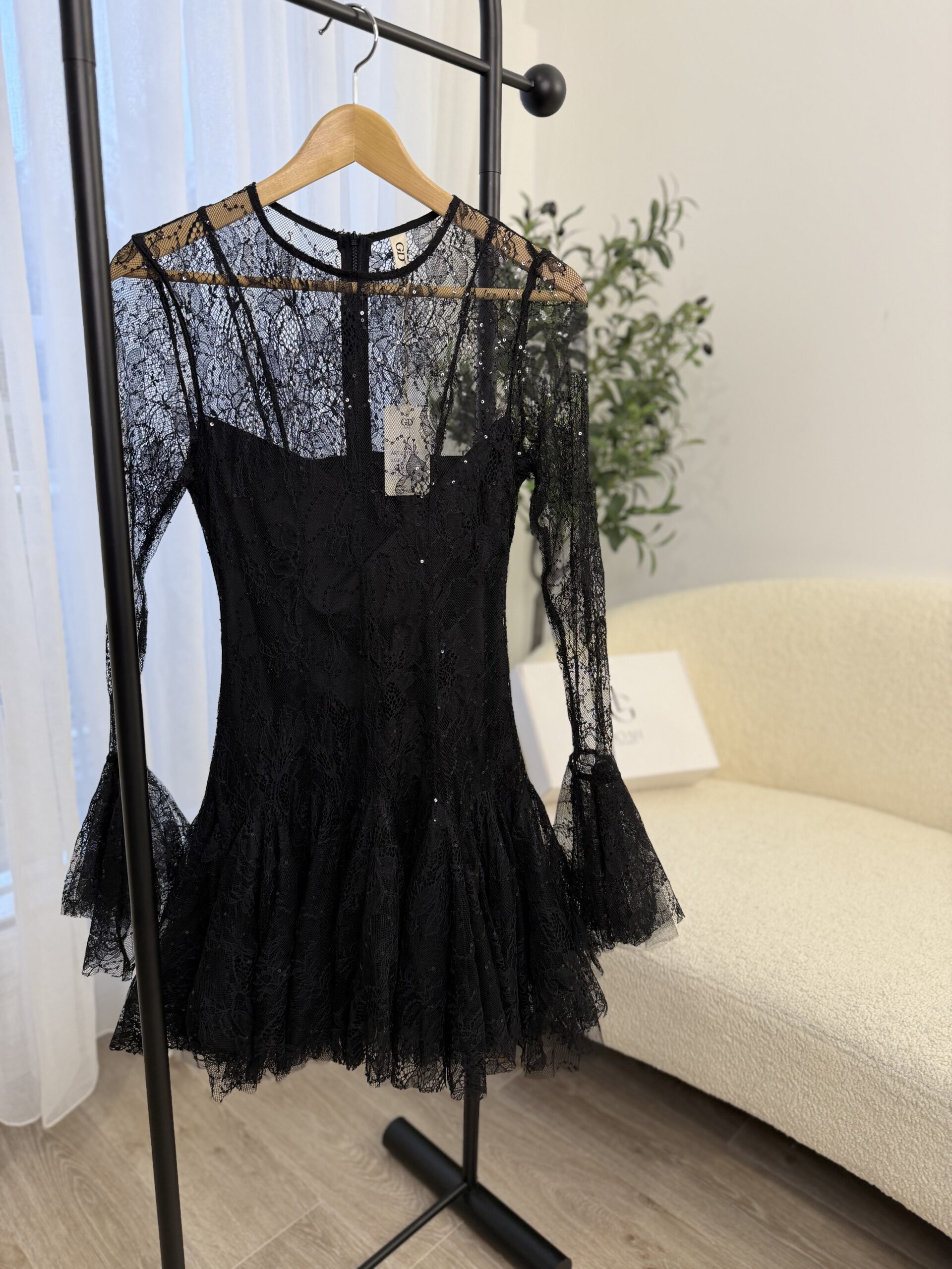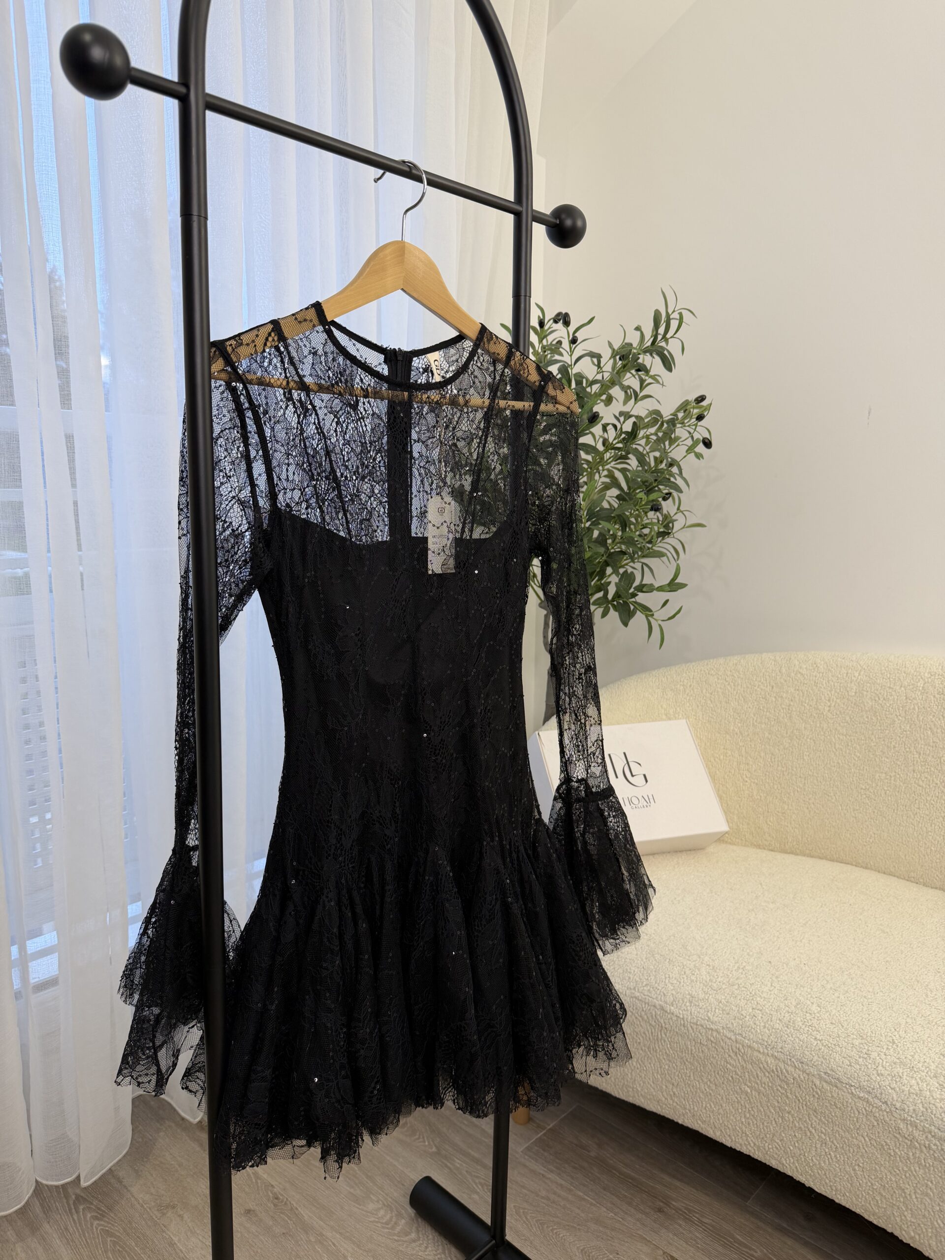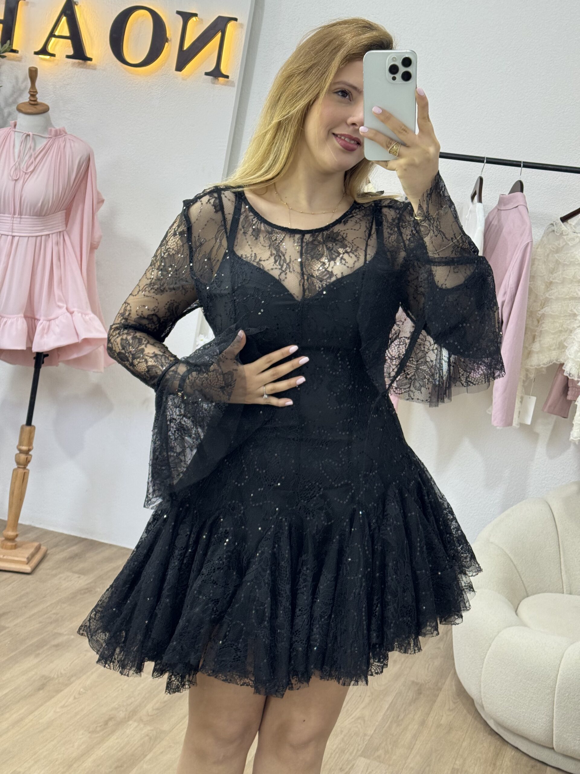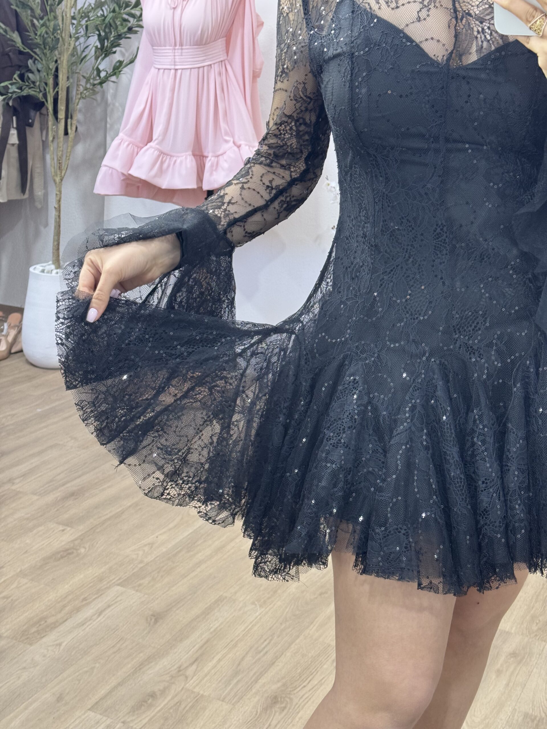 Robe courte en dentelle noire élégante, idéale pour vos soirées et événements spéciaux. Son haut légèrement transparent et ses manches longues en dentelle apportent une touche raffinée, tandis que la jupe volantée donne du mouvement et une allure féminine. Coupe ajustée à la taille pour sublimer la silhouette, avec une finition délicate et romantique.