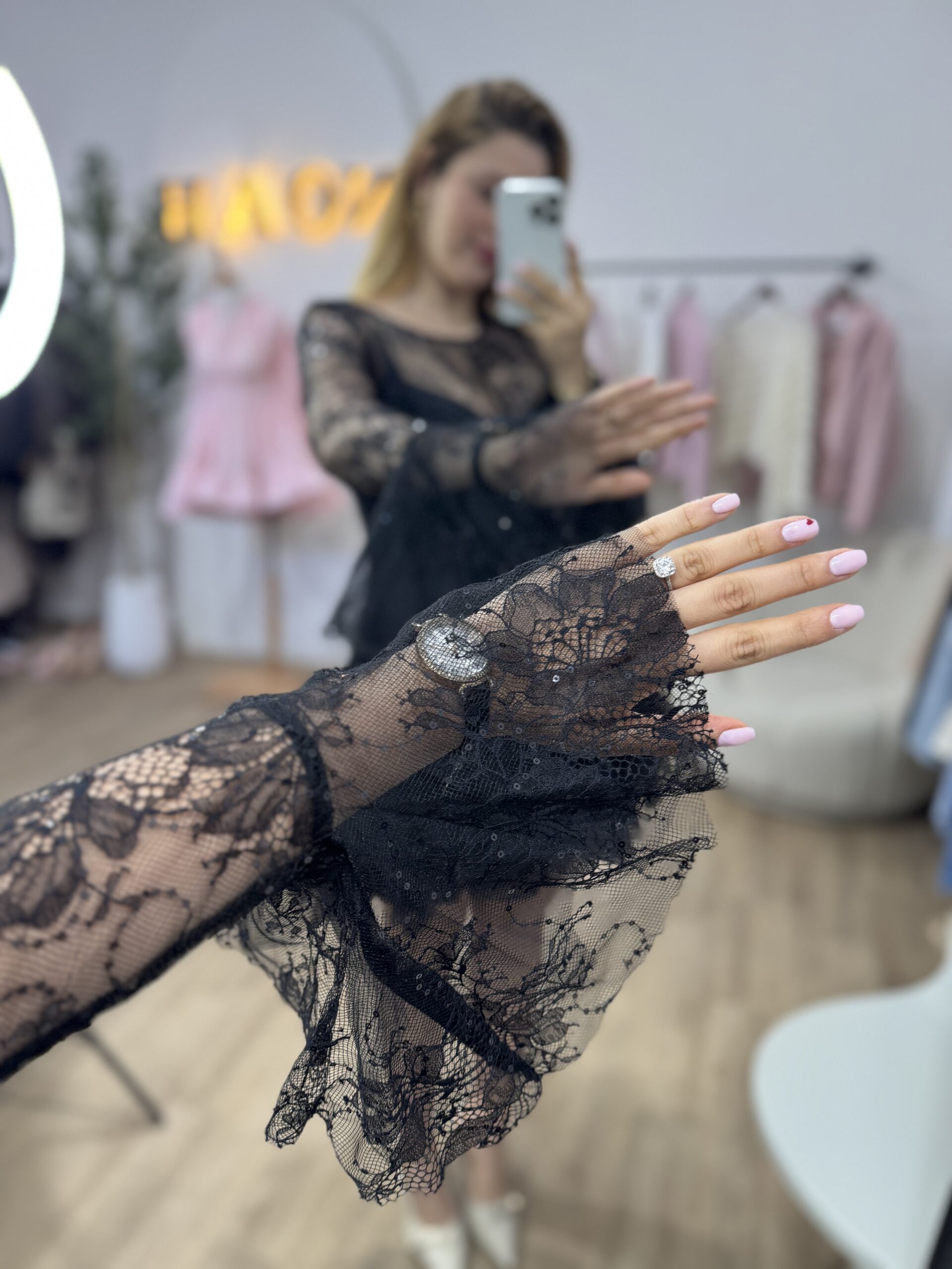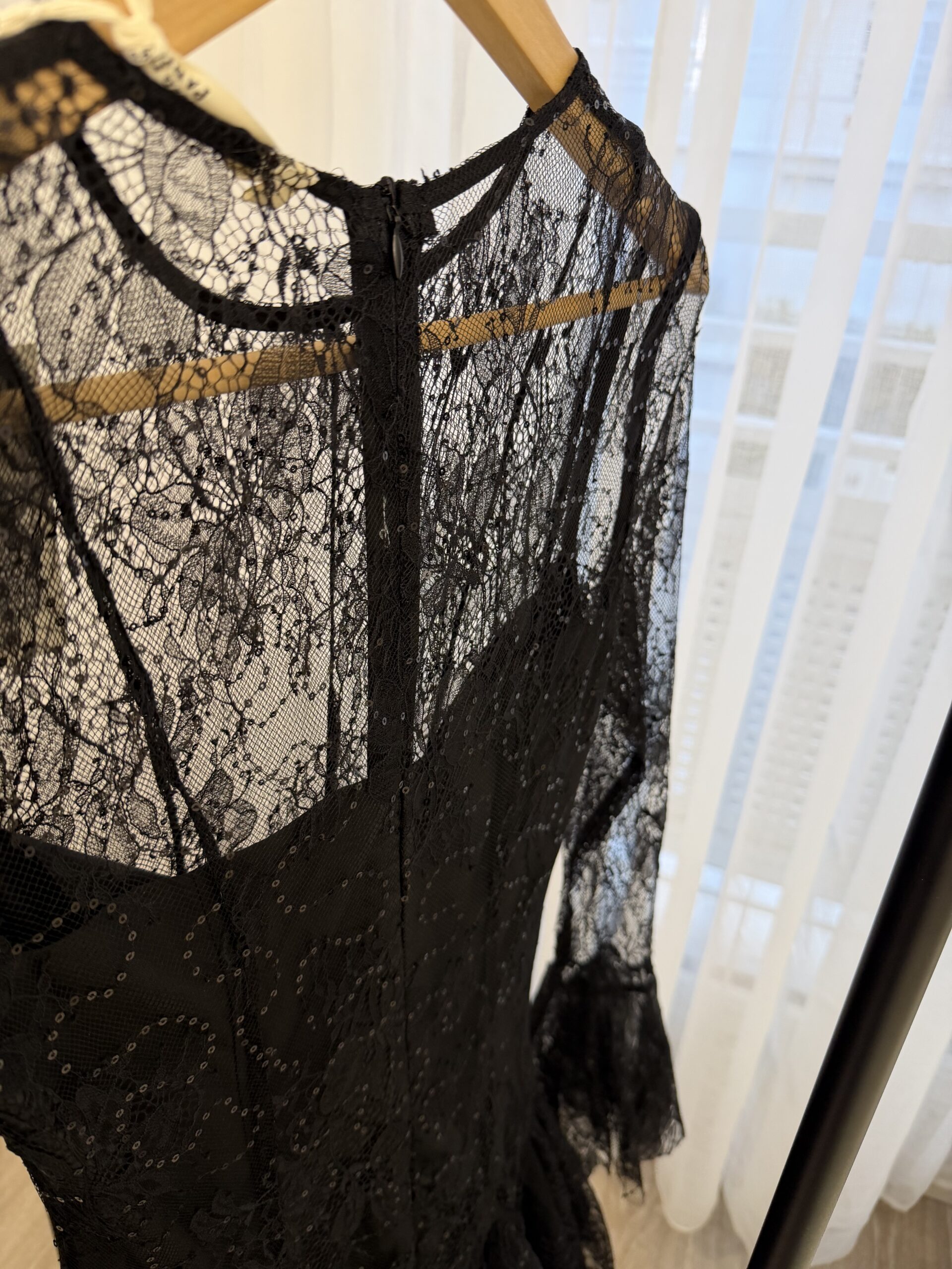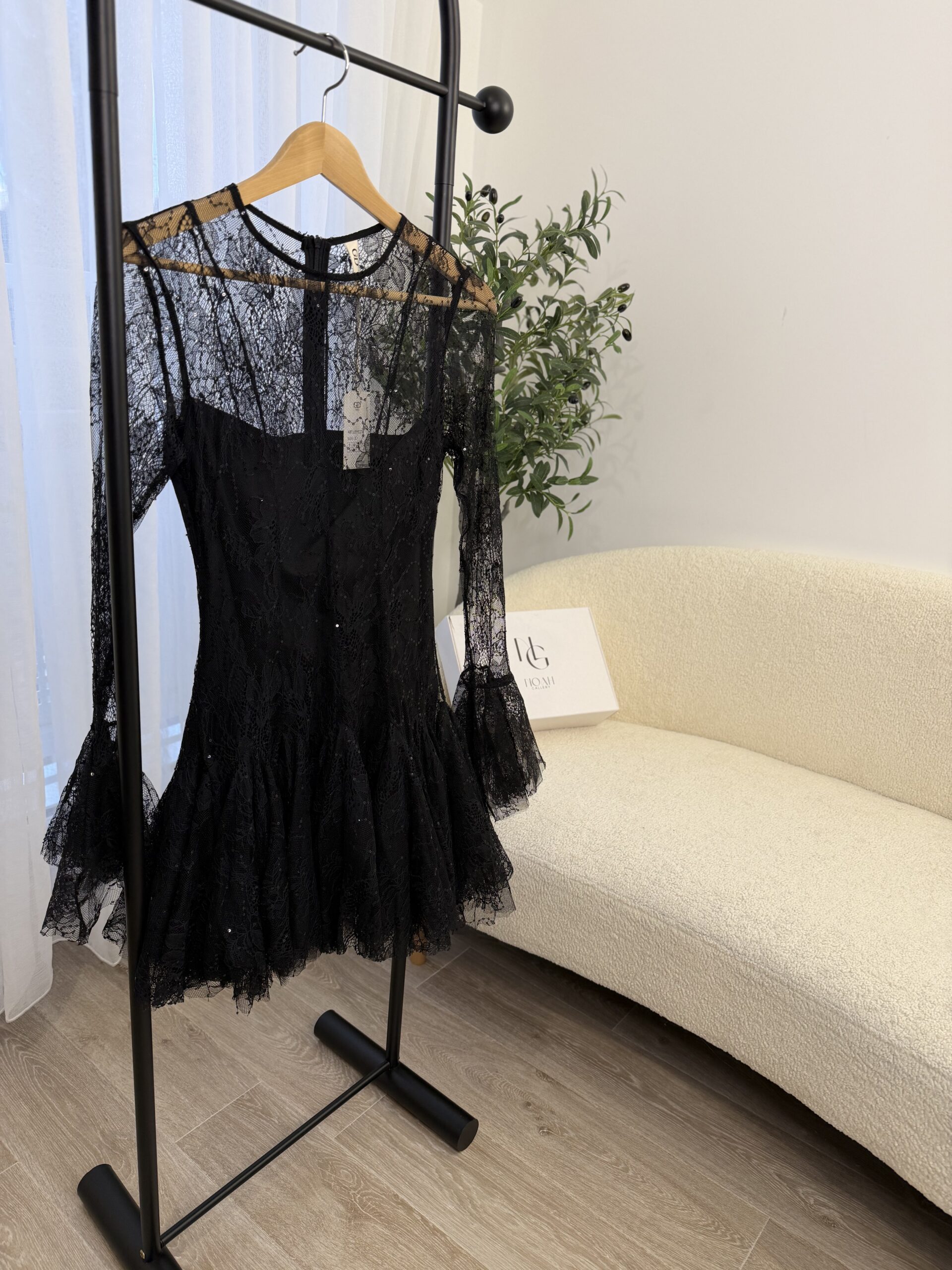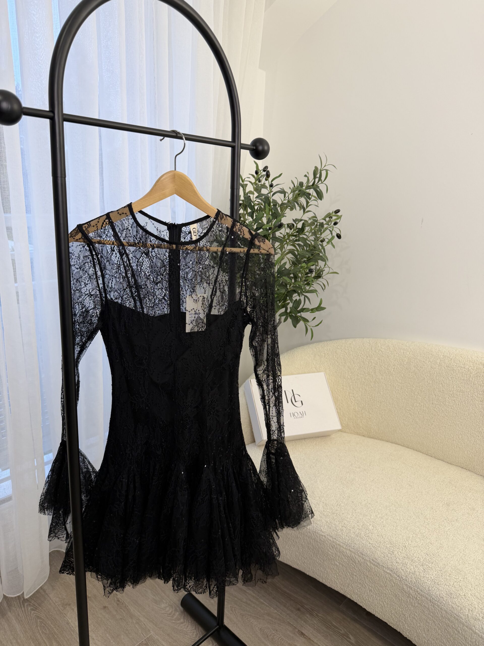 Robe courte en dentelle noire élégante, idéale pour vos soirées et événements spéciaux. Son haut légèrement transparent et ses manches longues en dentelle apportent une touche raffinée, tandis que la jupe volantée donne du mouvement et une allure féminine. Coupe ajustée à la taille pour sublimer la silhouette, avec une finition délicate et romantique.