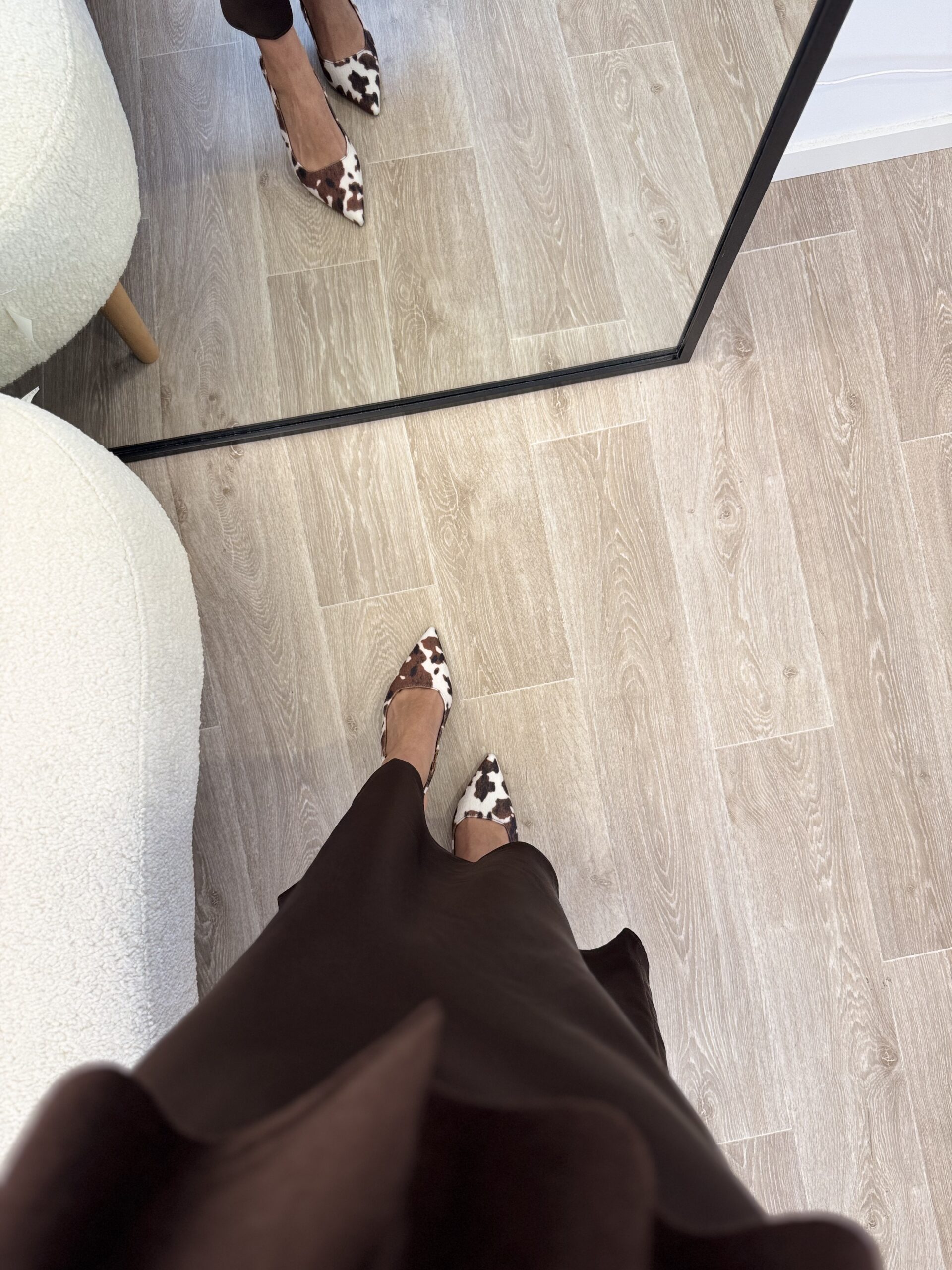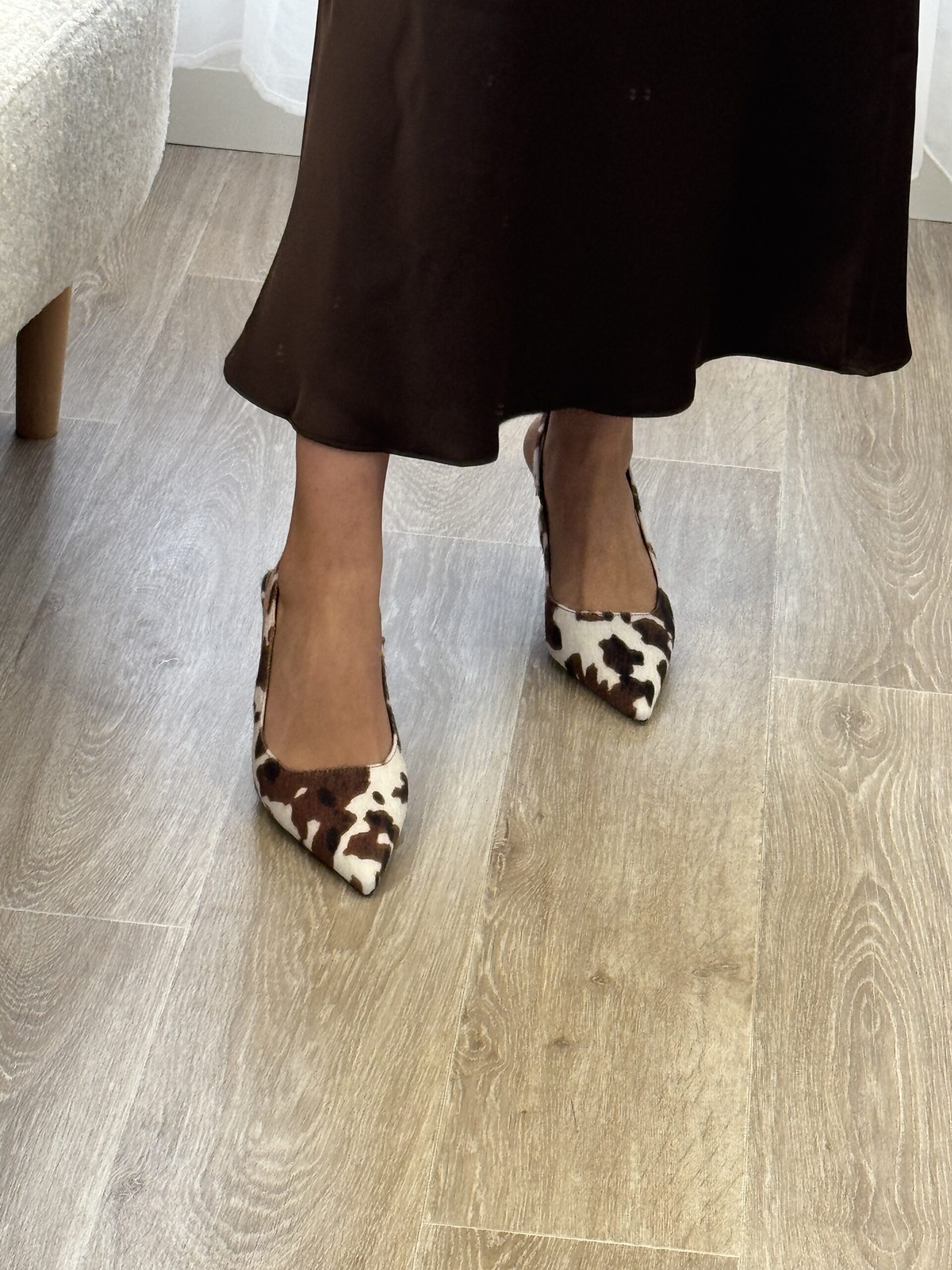 Talons élégants en tissu imprimé vache, alliant audace et raffinement. Leur motif marron et blanc apporte une touche tendance et originale, parfaite pour sublimer une tenue sobre ou affirmer un look mode assumé.
