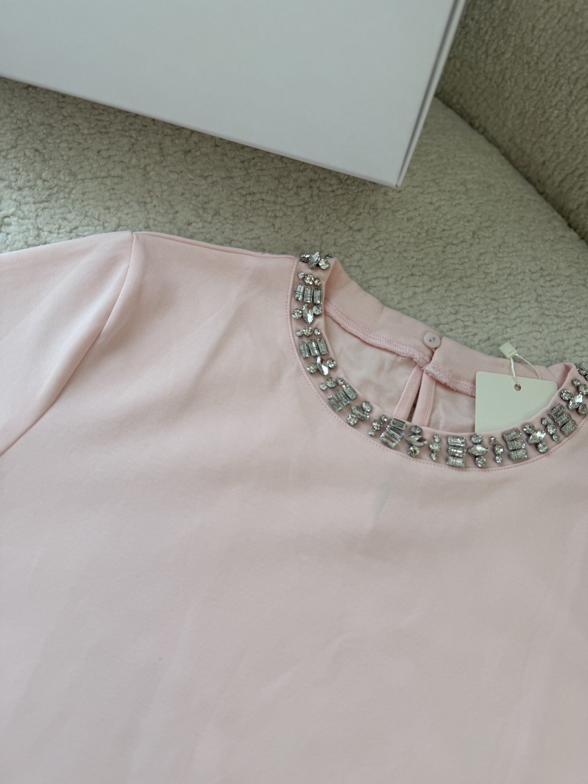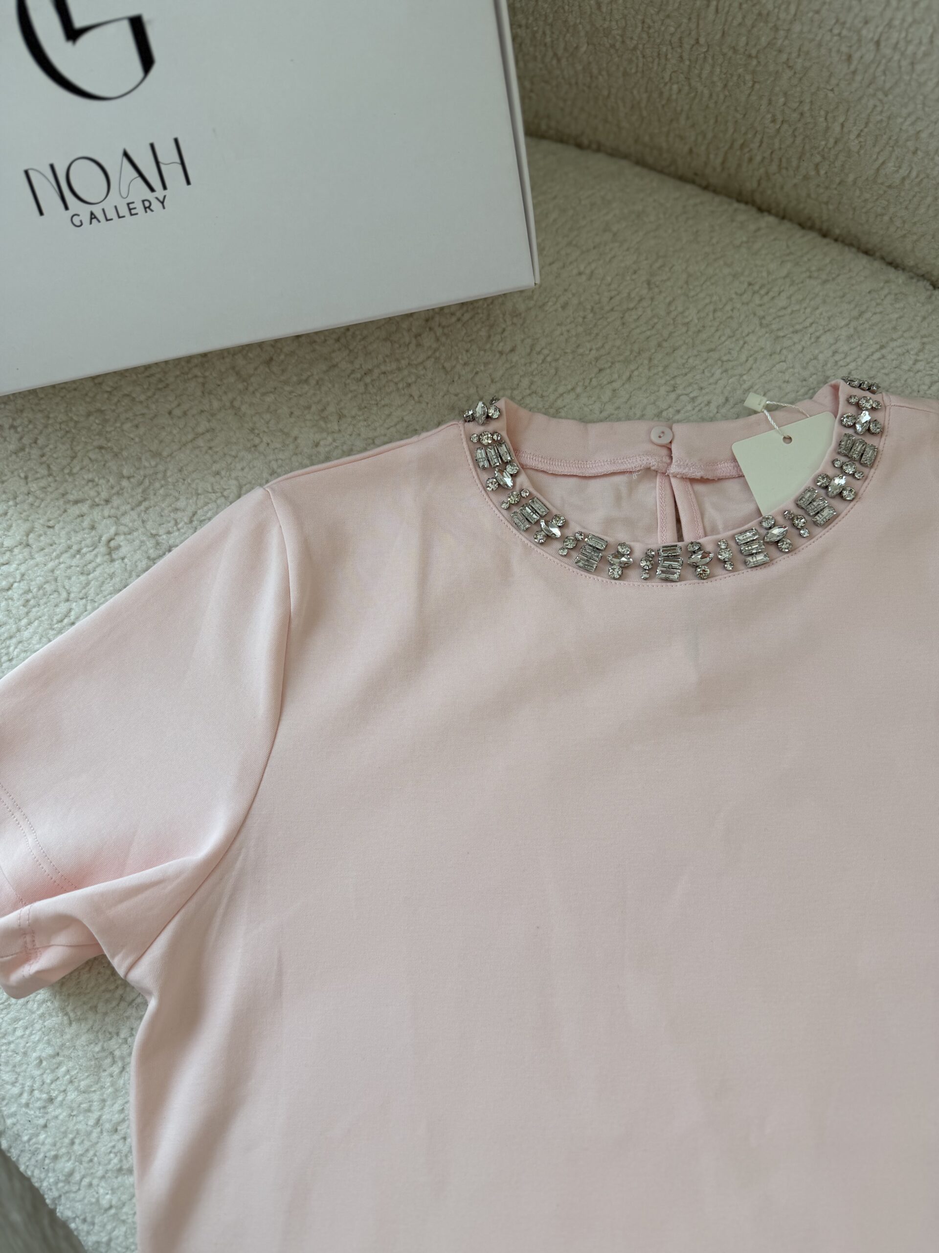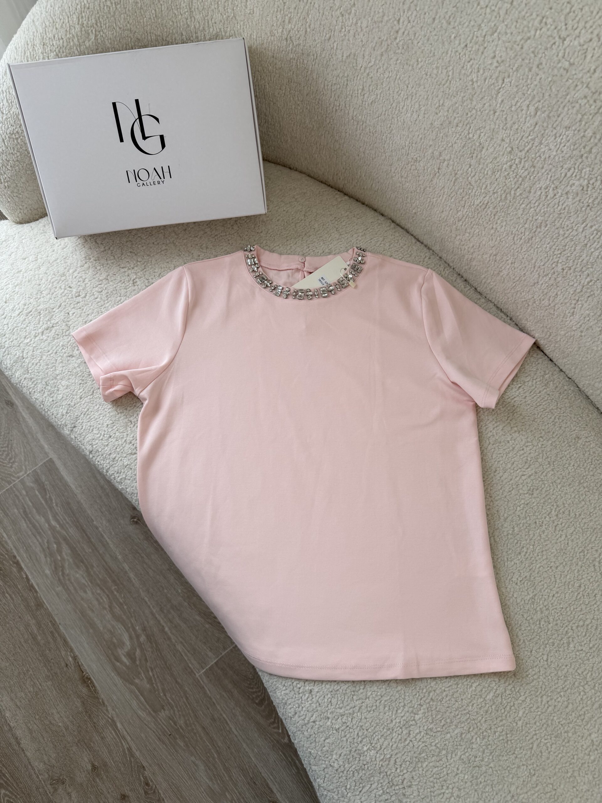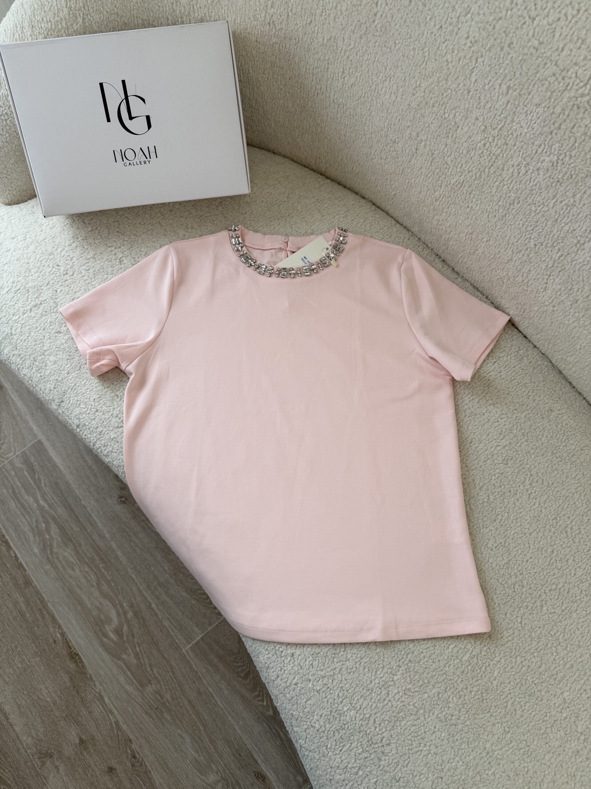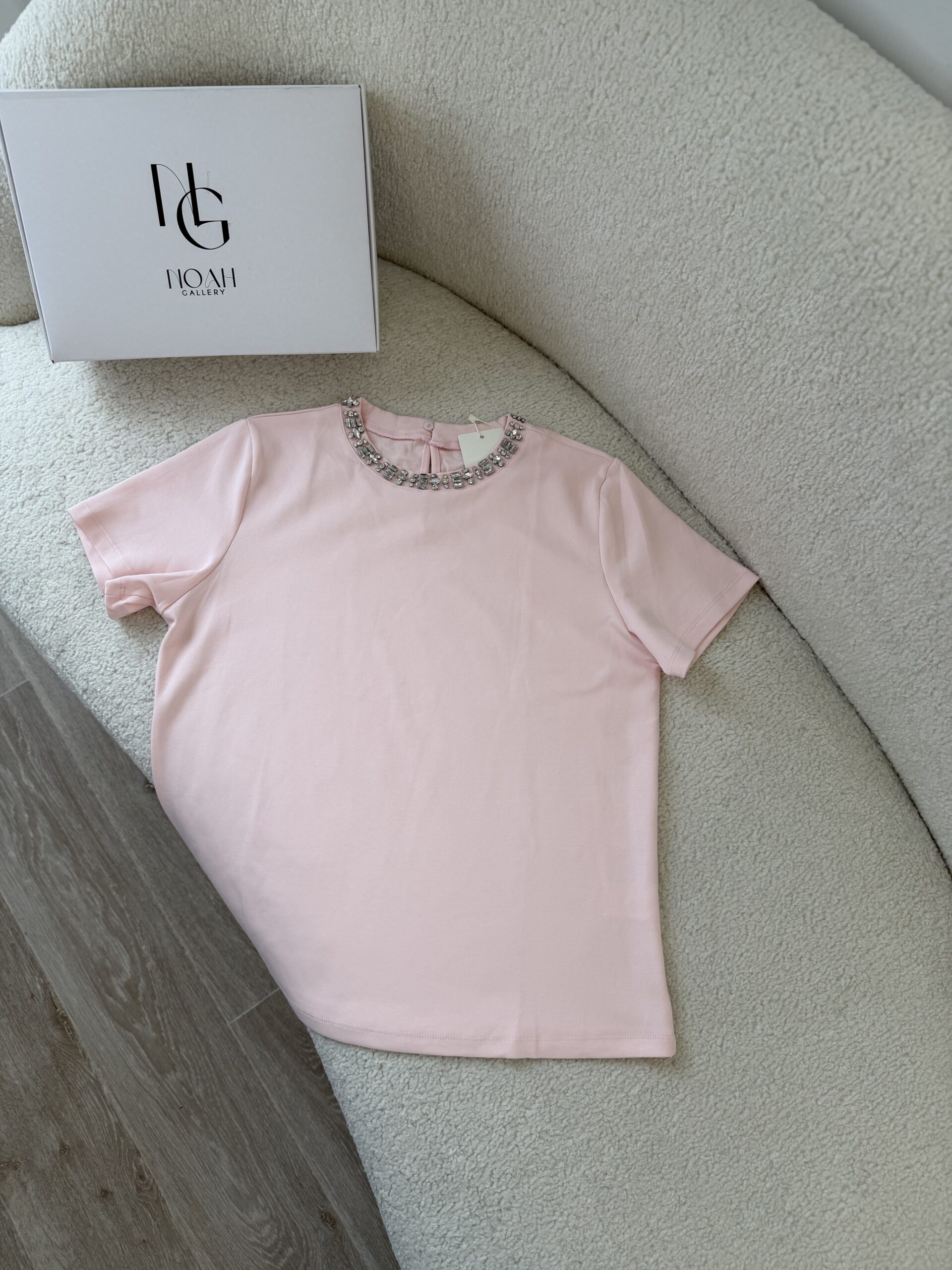 Top élégant à la coupe épurée, sublimé par un col orné de strass scintillants. Sa teinte rose douce apporte une touche féminine et lumineuse, idéale pour rehausser vos tenues du quotidien ou de soirée. Confortable et raffiné, il se porte facilement avec un jean ou une pièce plus habillée.