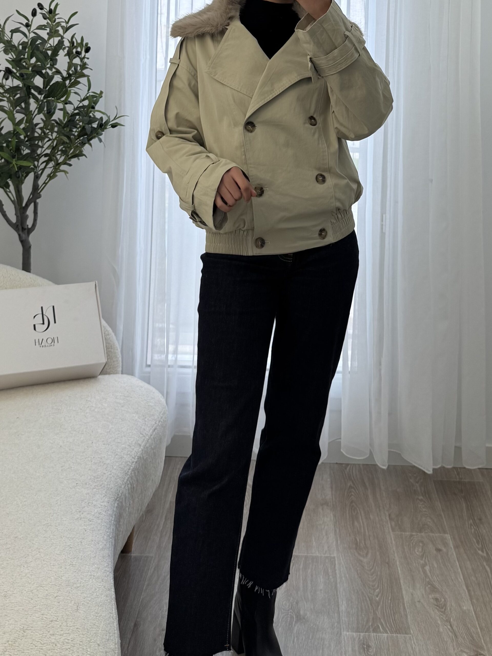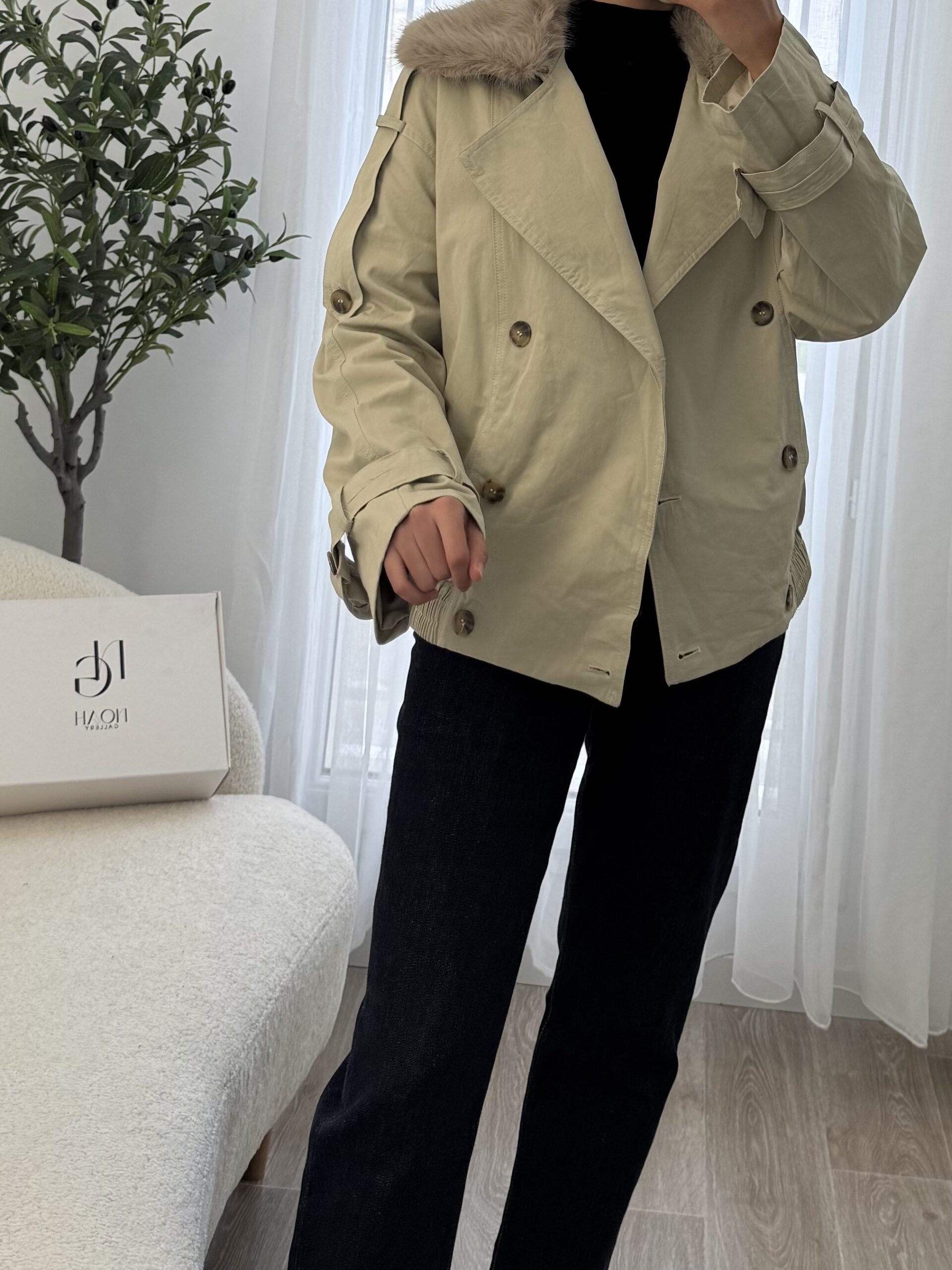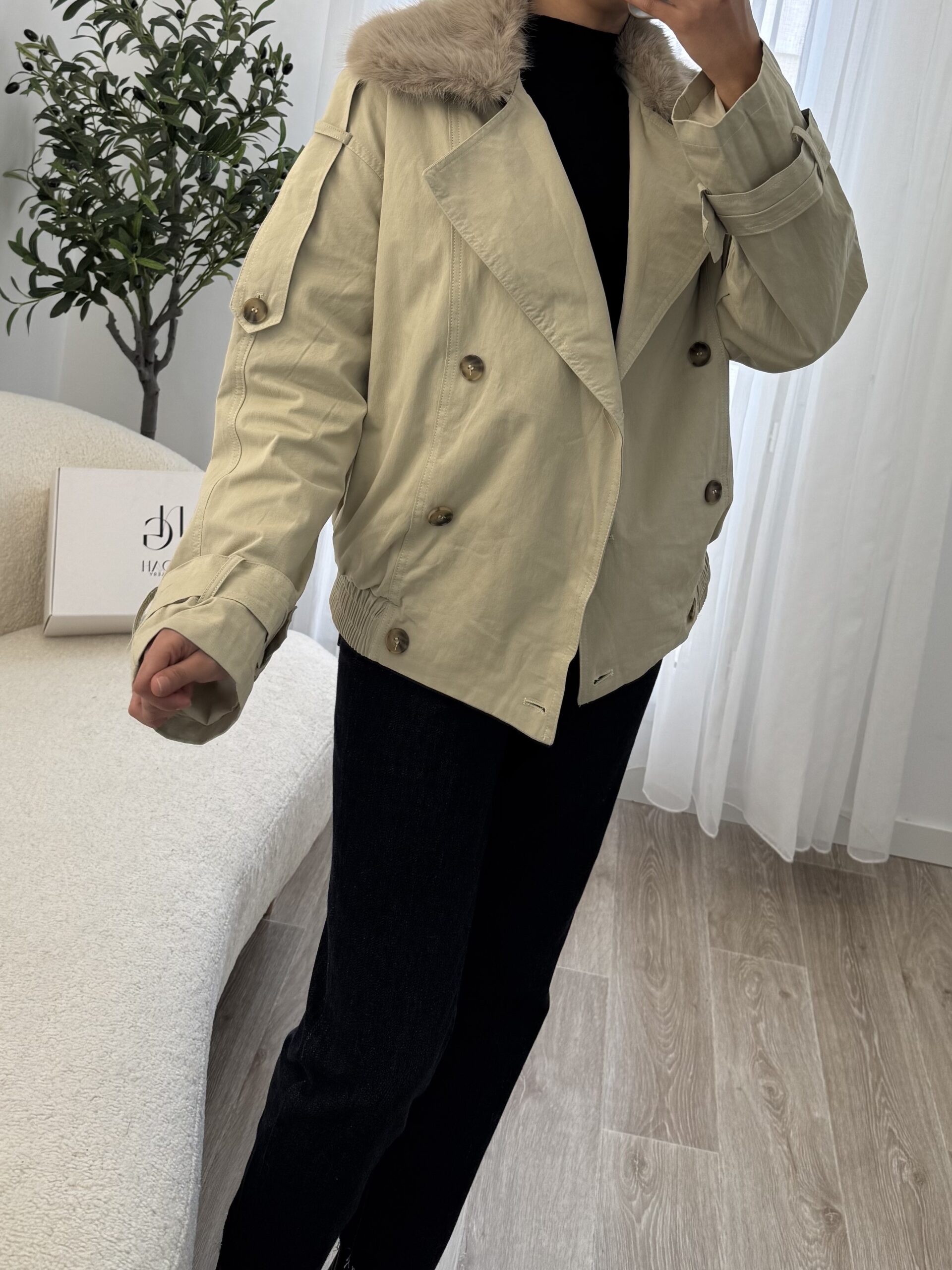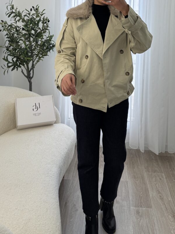 Trench court beige au style moderne, doté d’un col en fausse fourrure et d’une coupe structurée pour un look chic et chaleureux façon Zara.