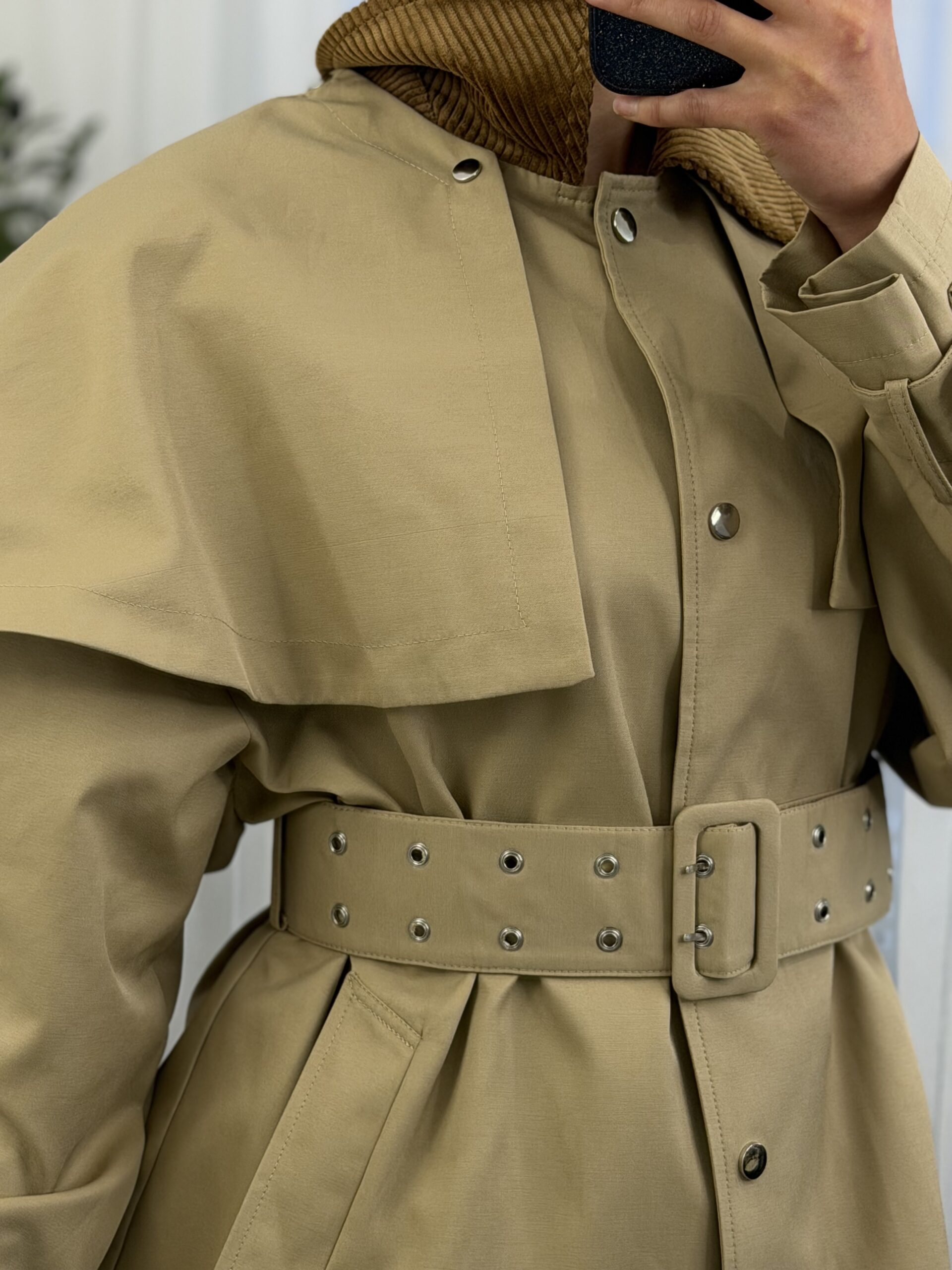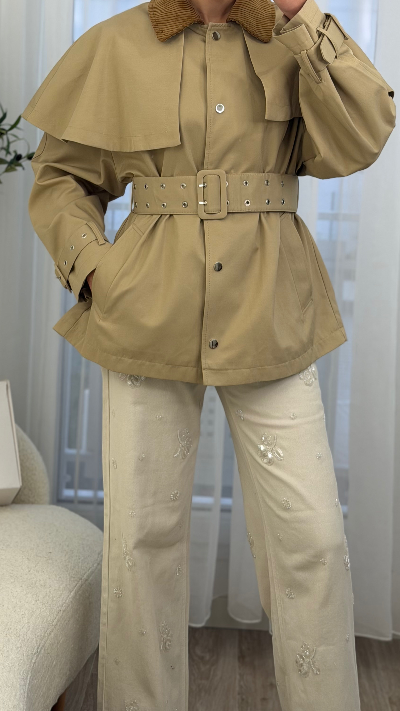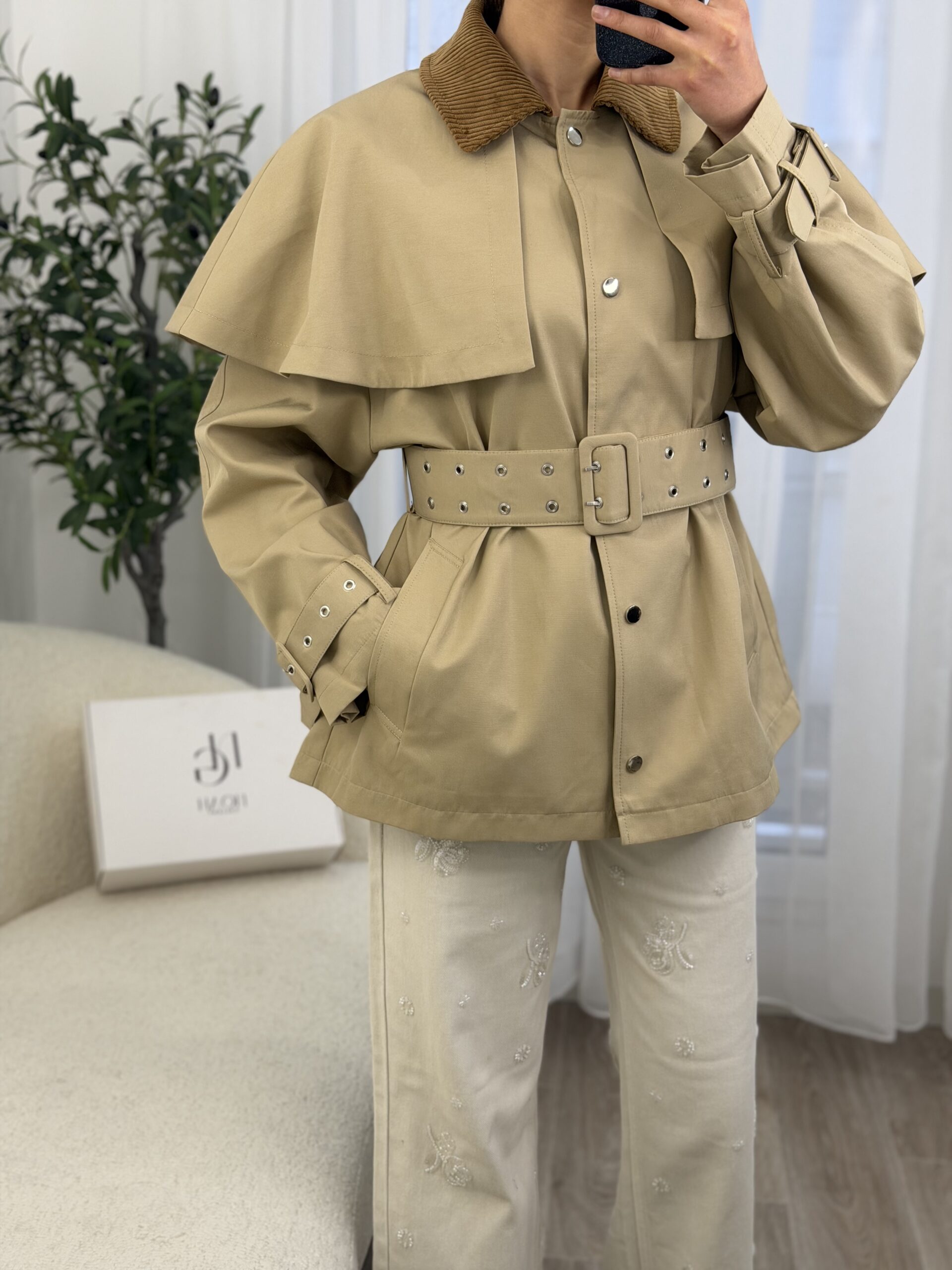 Ce trench court beige sable revisite le classique trench coat avec une touche moderne et élégante. Il se distingue par une cape structurée sur les épaules qui apporte du volume et du caractère à la silhouette. La ceinture large à œillets métalliques souligne la taille et permet un ajustement parfait.