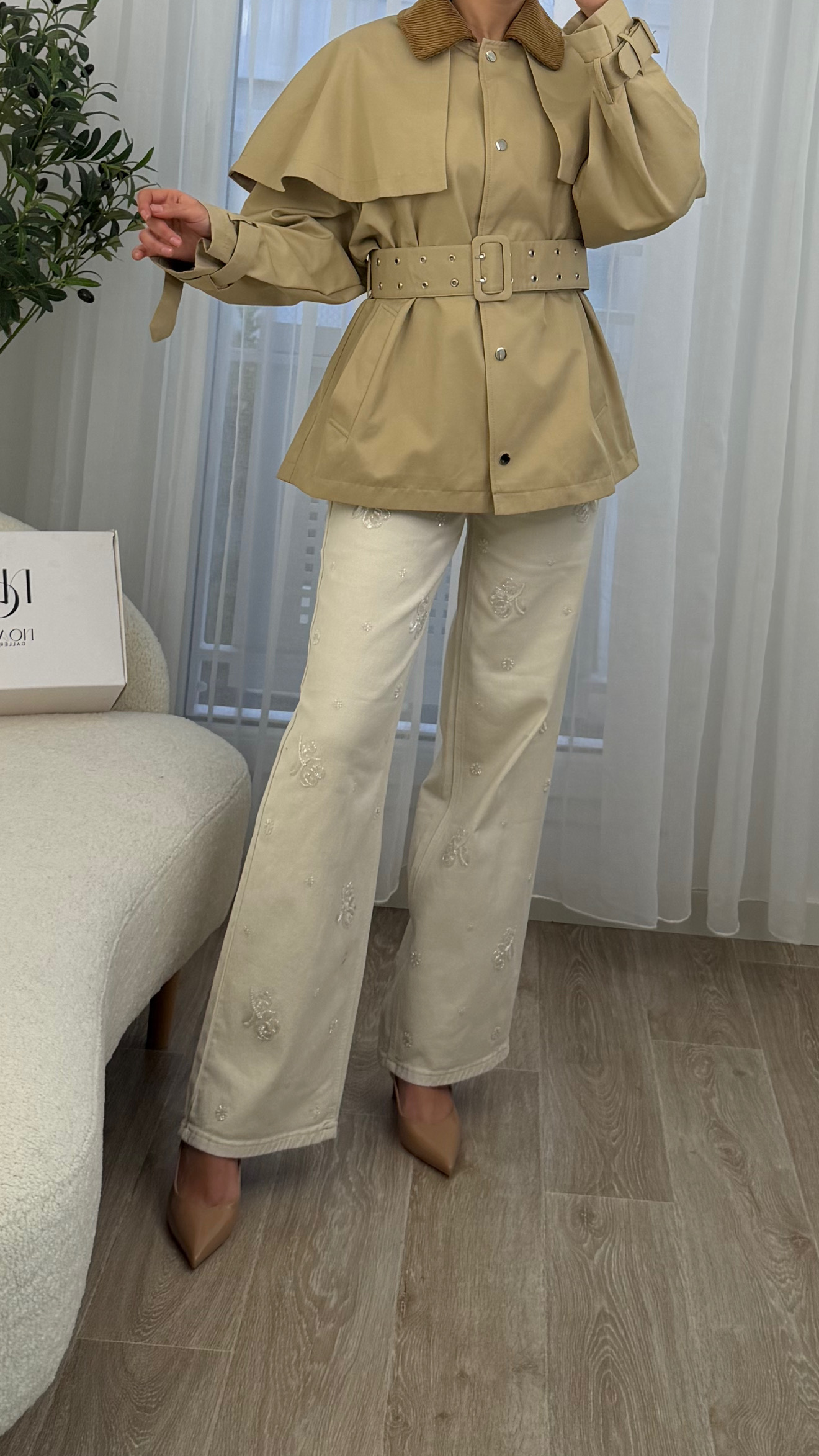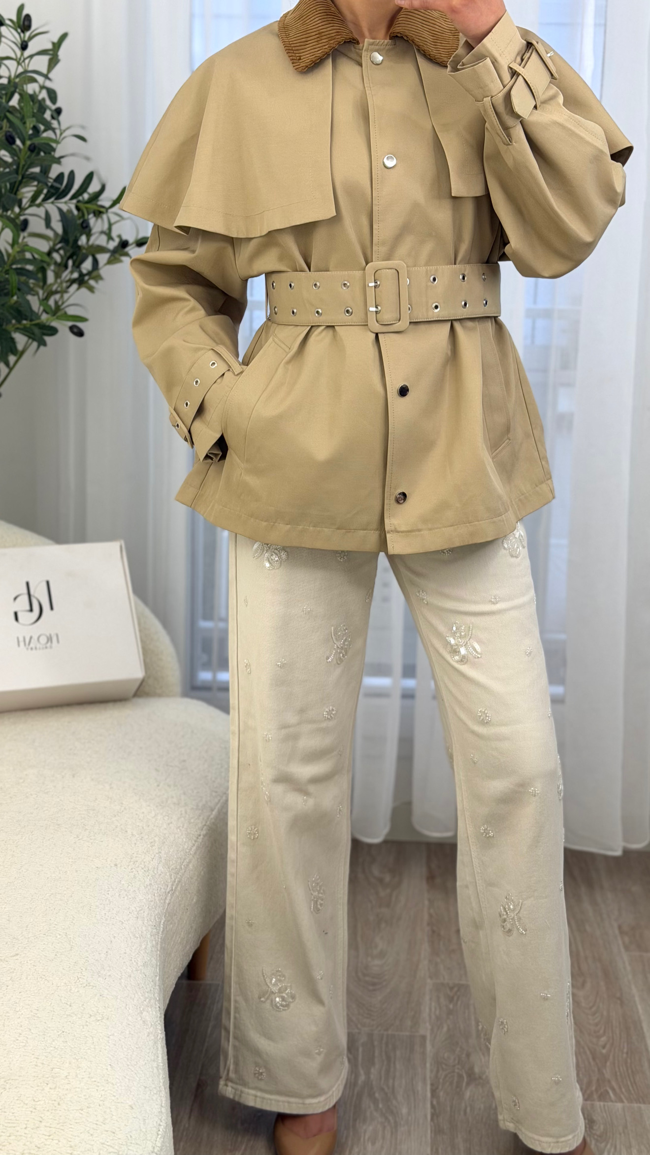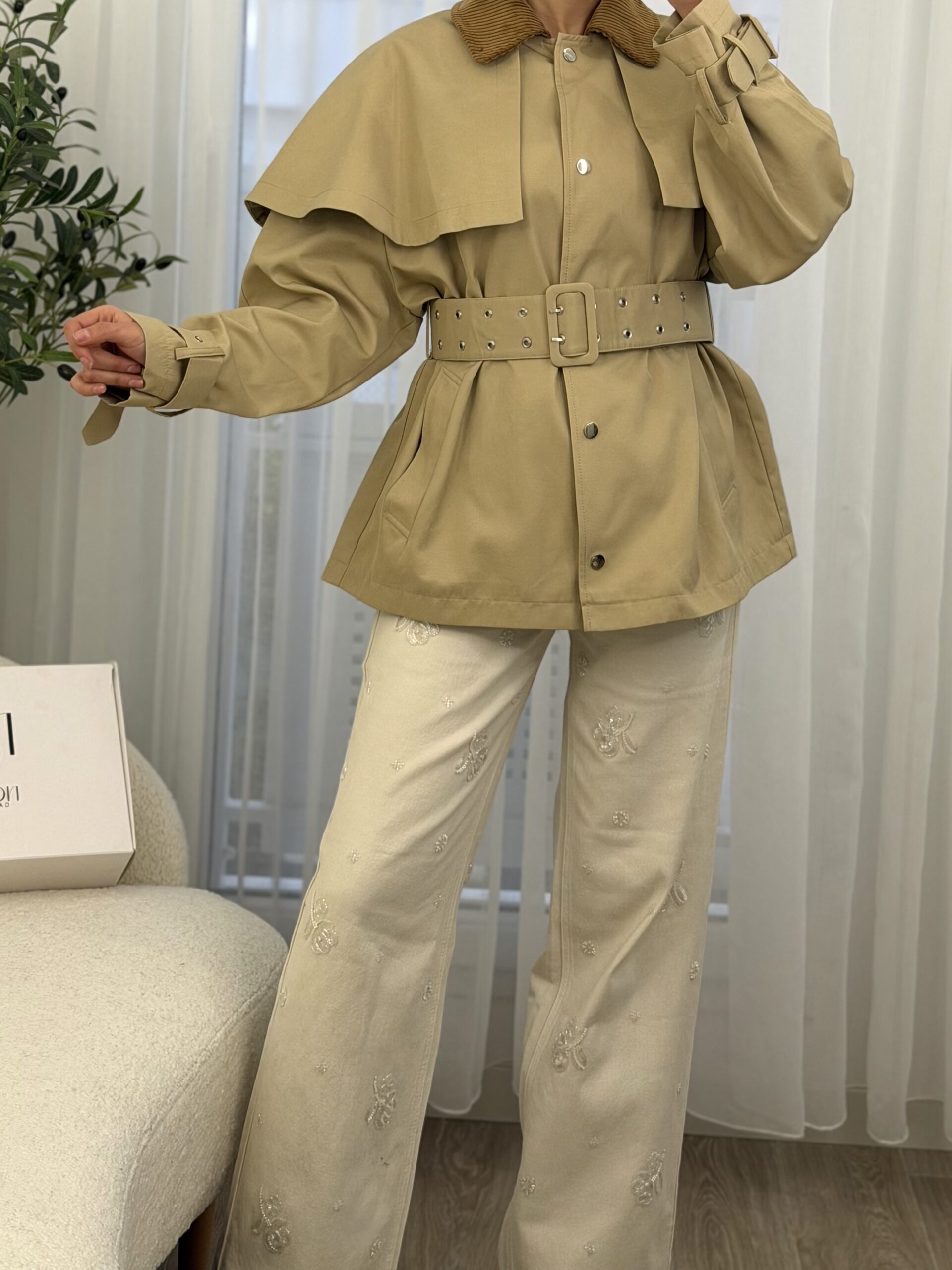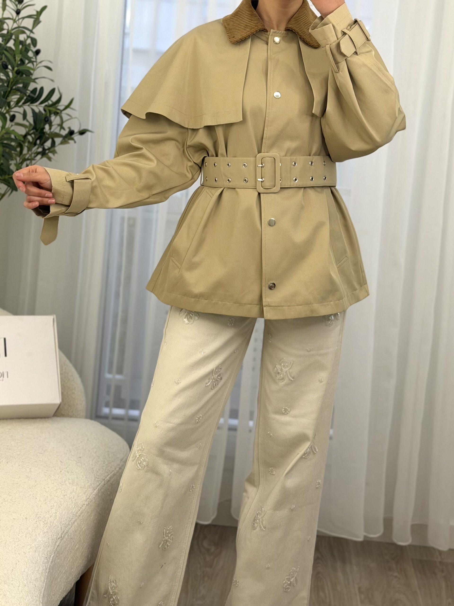 Ce trench court beige sable revisite le classique trench coat avec une touche moderne et élégante. Il se distingue par une cape structurée sur les épaules qui apporte du volume et du caractère à la silhouette. La ceinture large à œillets métalliques souligne la taille et permet un ajustement parfait.