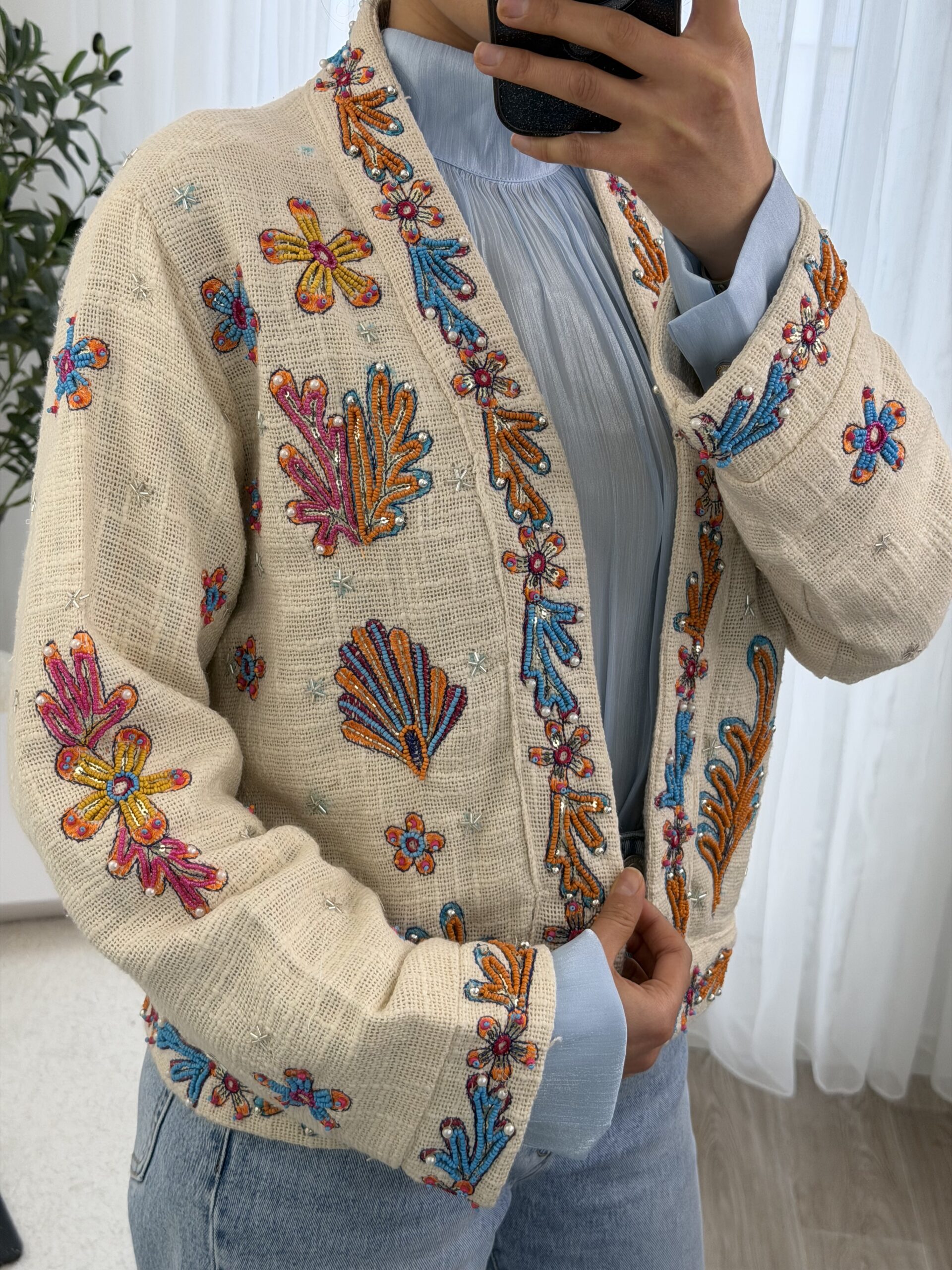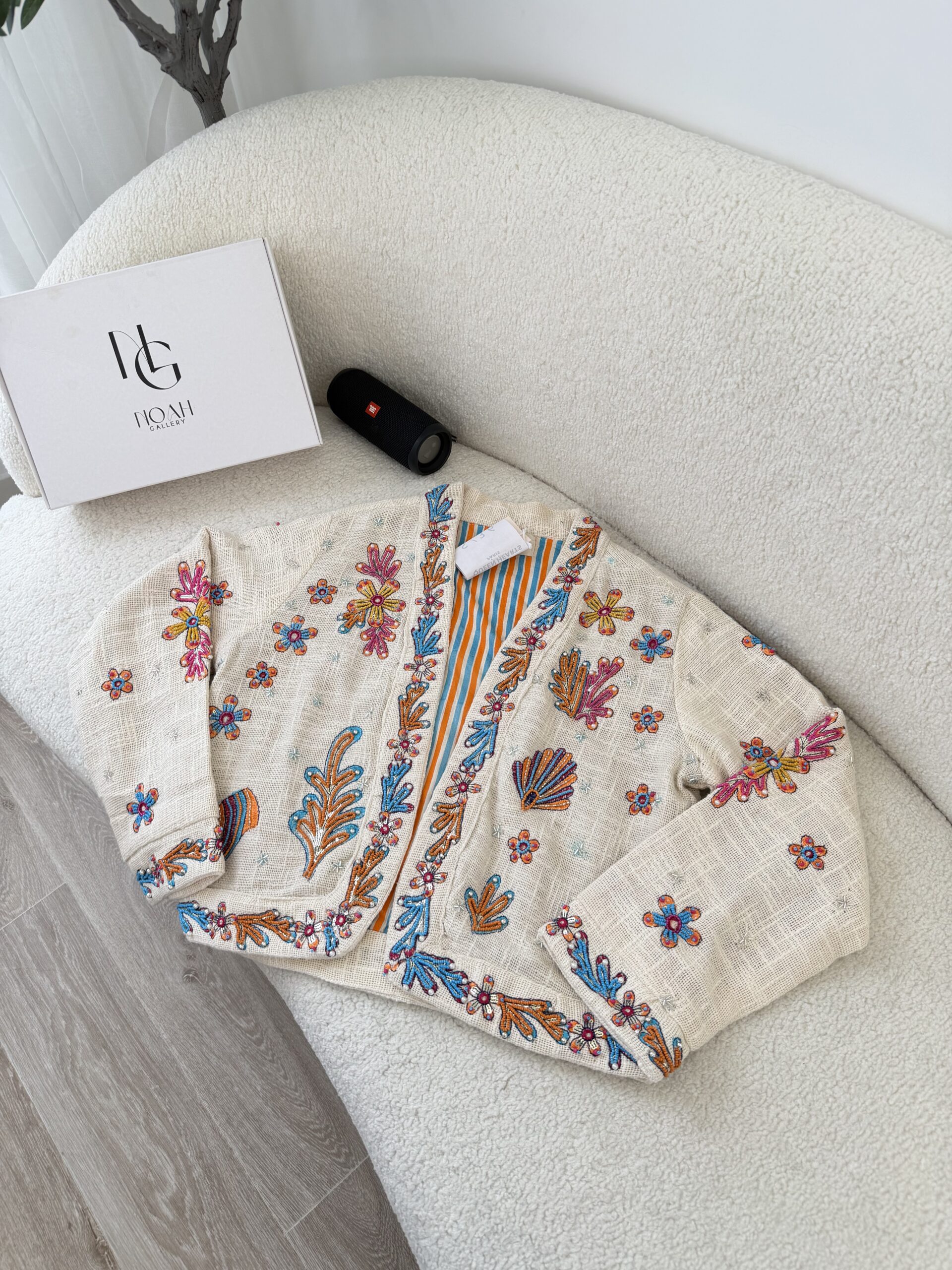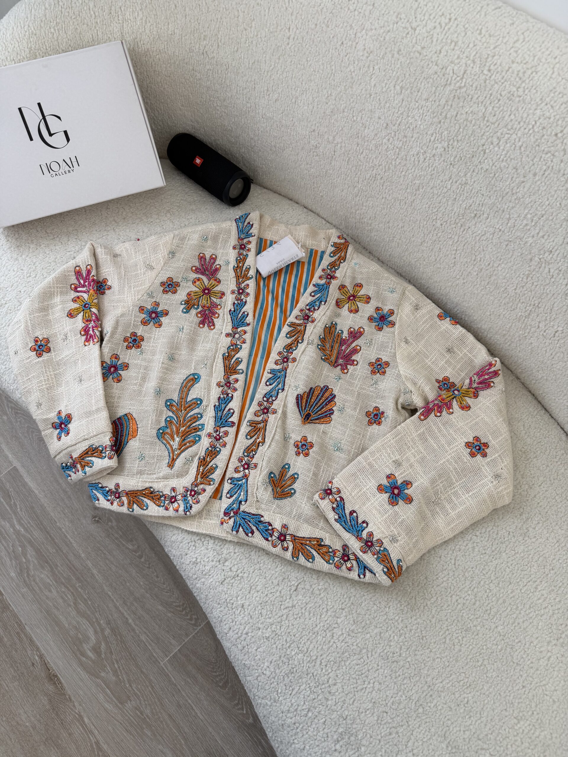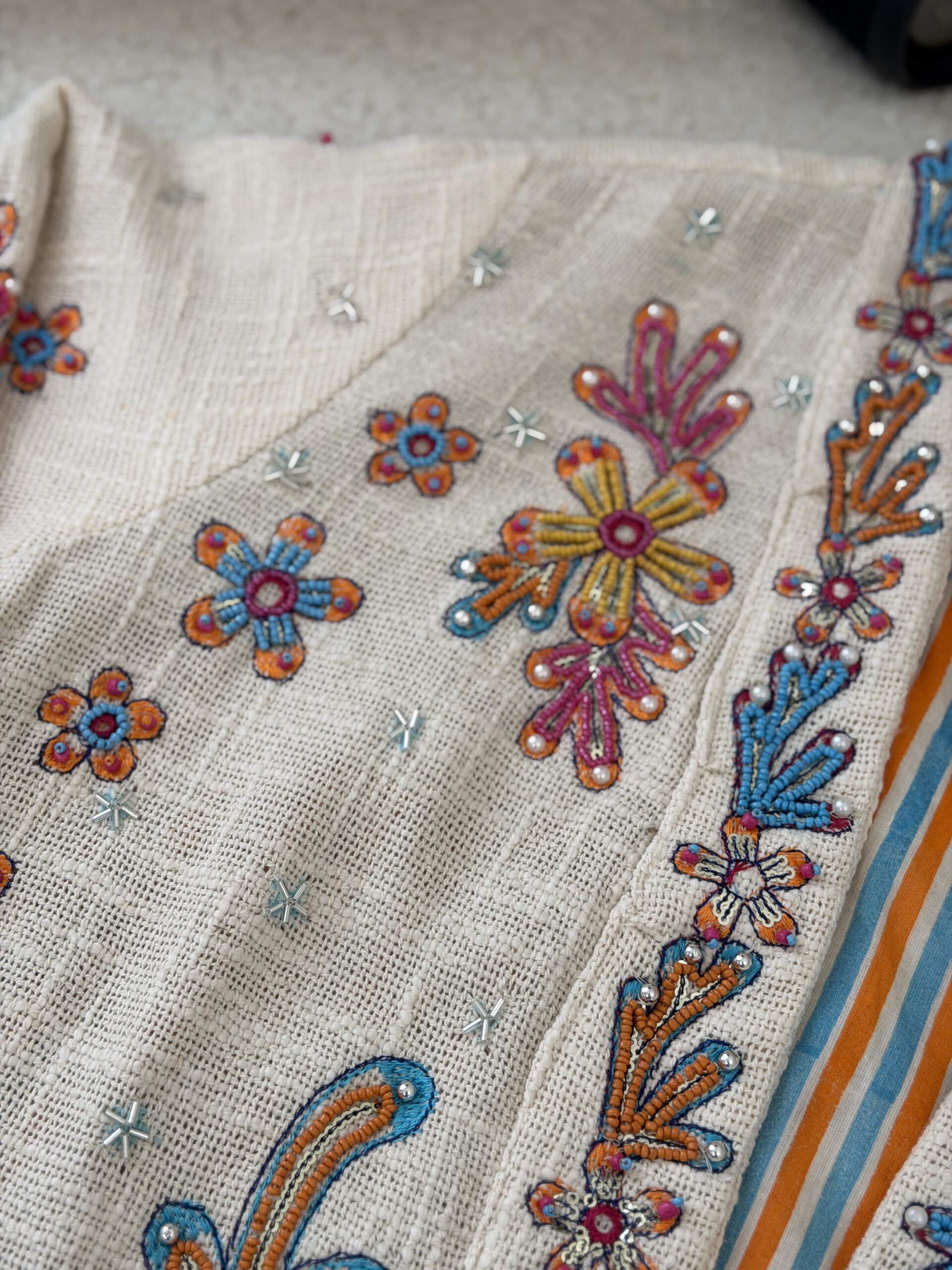 Cette veste bohème écru brodée à la main se distingue par ses magnifiques broderies florales multicolores artisanales. Confectionnée dans un tissu léger et confortable, elle apporte une touche bohème chic et authentique à toutes vos tenues. Une pièce unique, idéale pour sublimer un look casual ou élégant en toute saison.