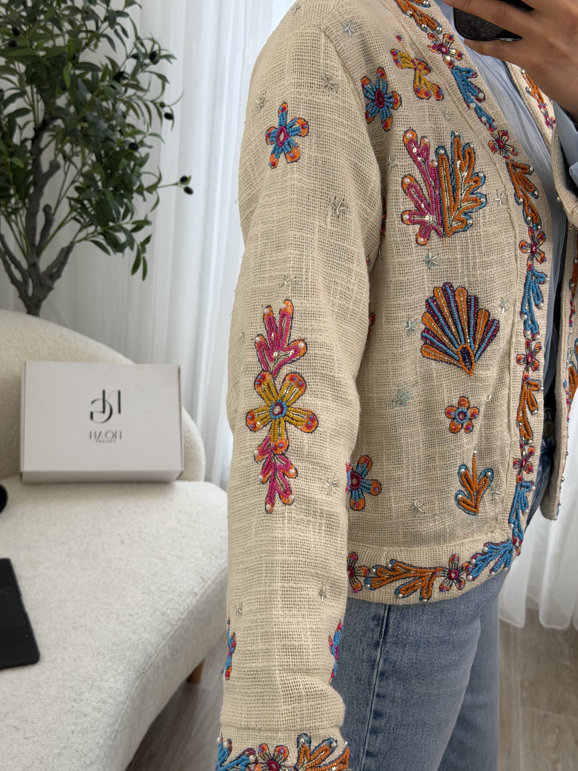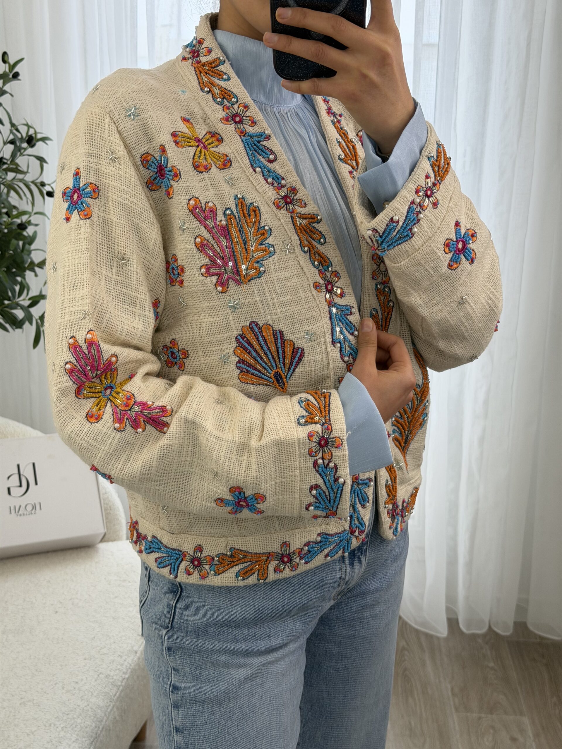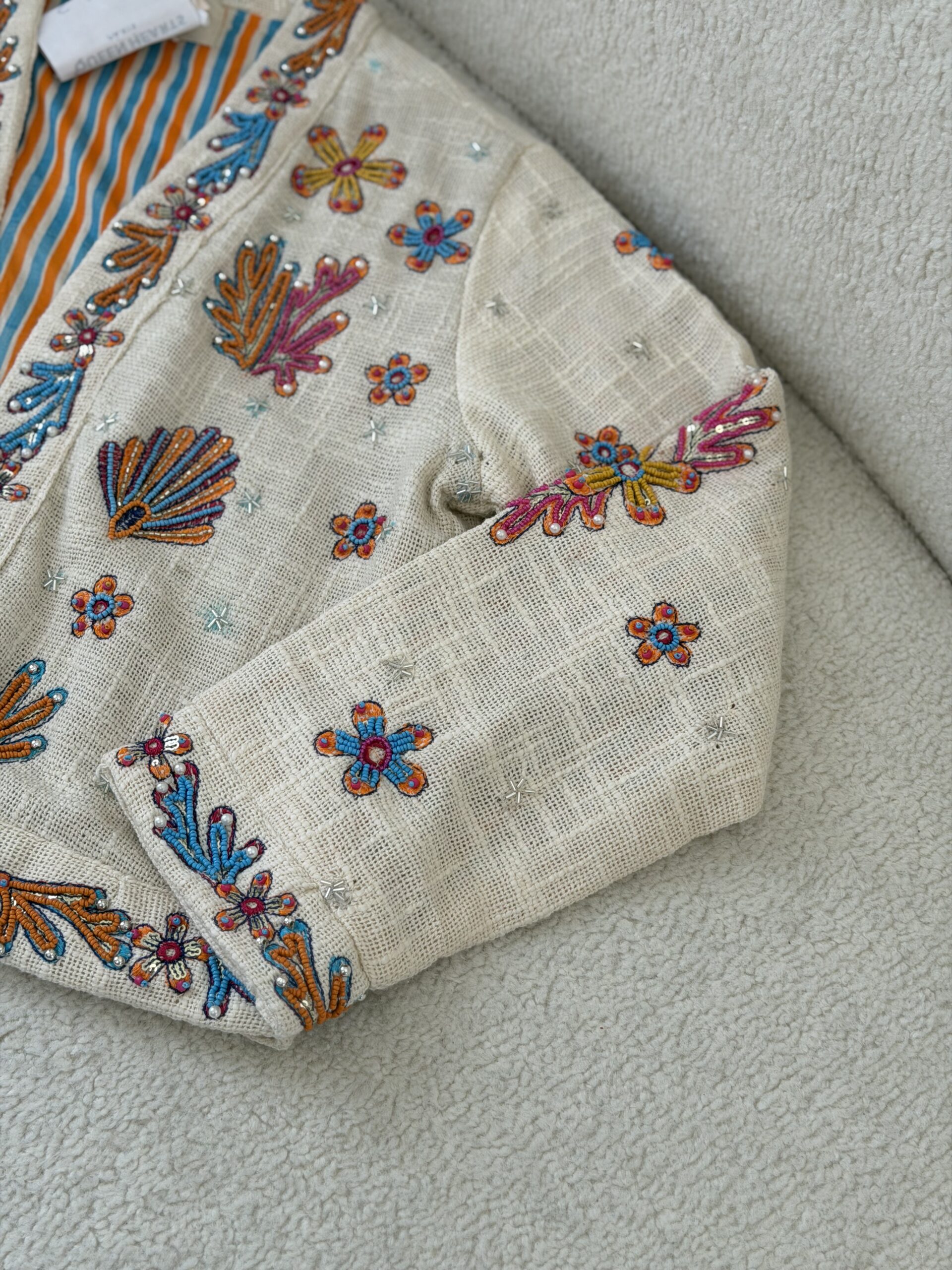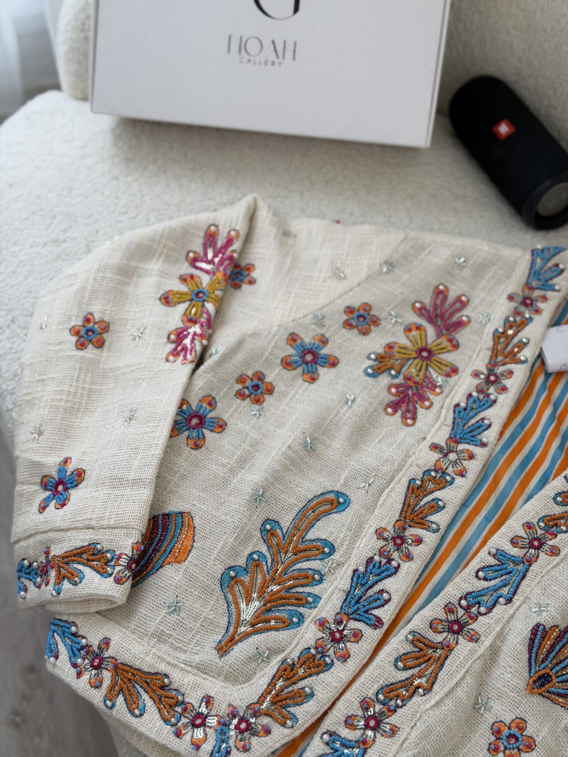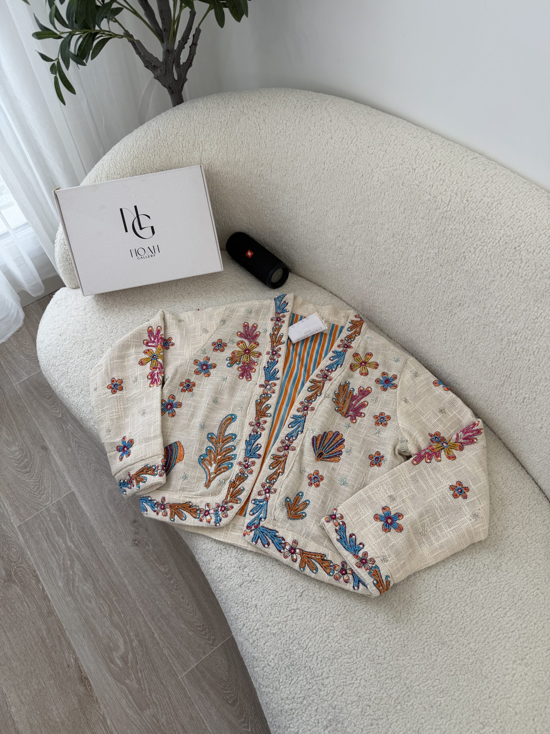 Cette veste bohème écru brodée à la main se distingue par ses magnifiques broderies florales multicolores artisanales. Confectionnée dans un tissu léger et confortable, elle apporte une touche bohème chic et authentique à toutes vos tenues. Une pièce unique, idéale pour sublimer un look casual ou élégant en toute saison.