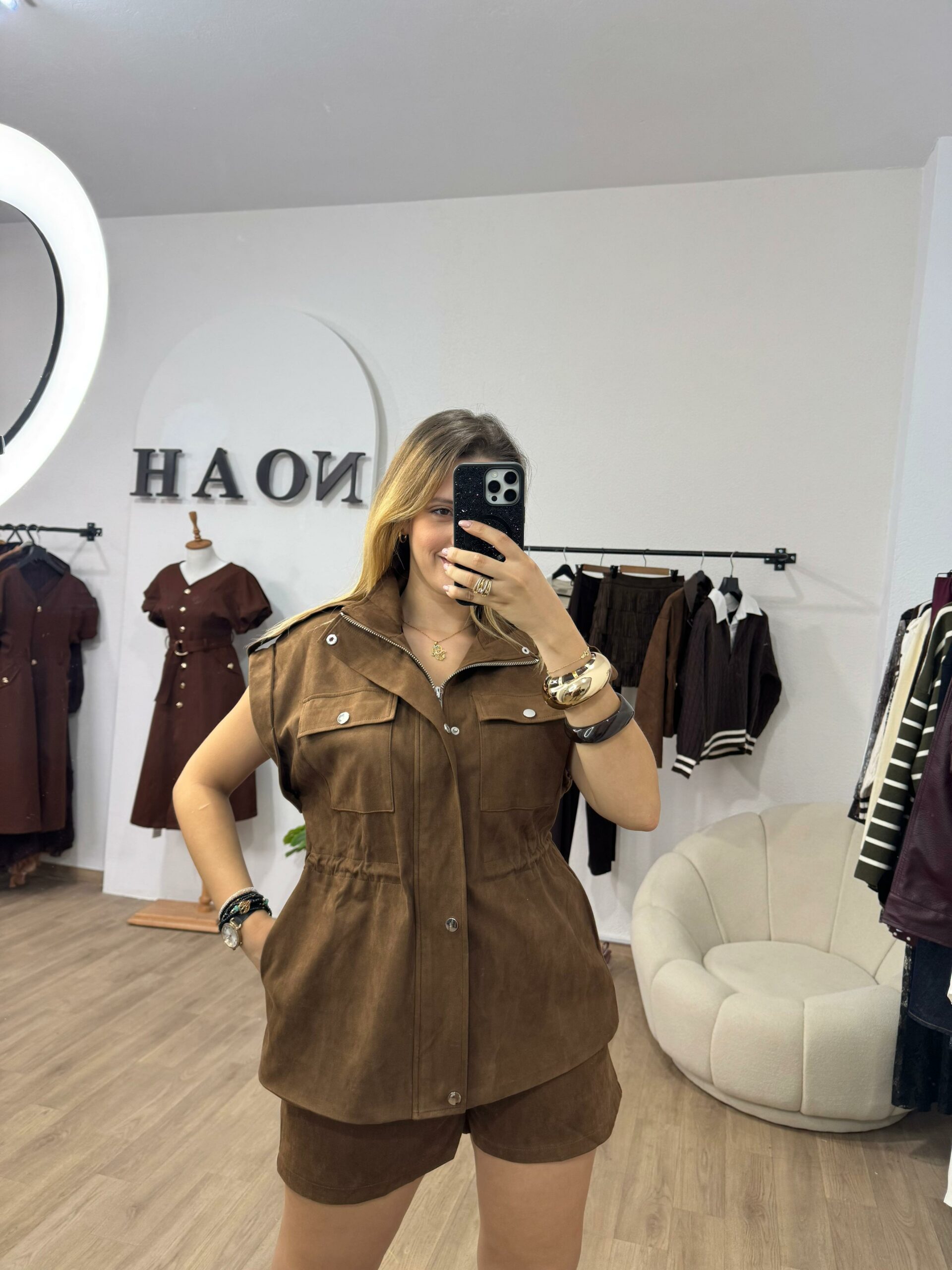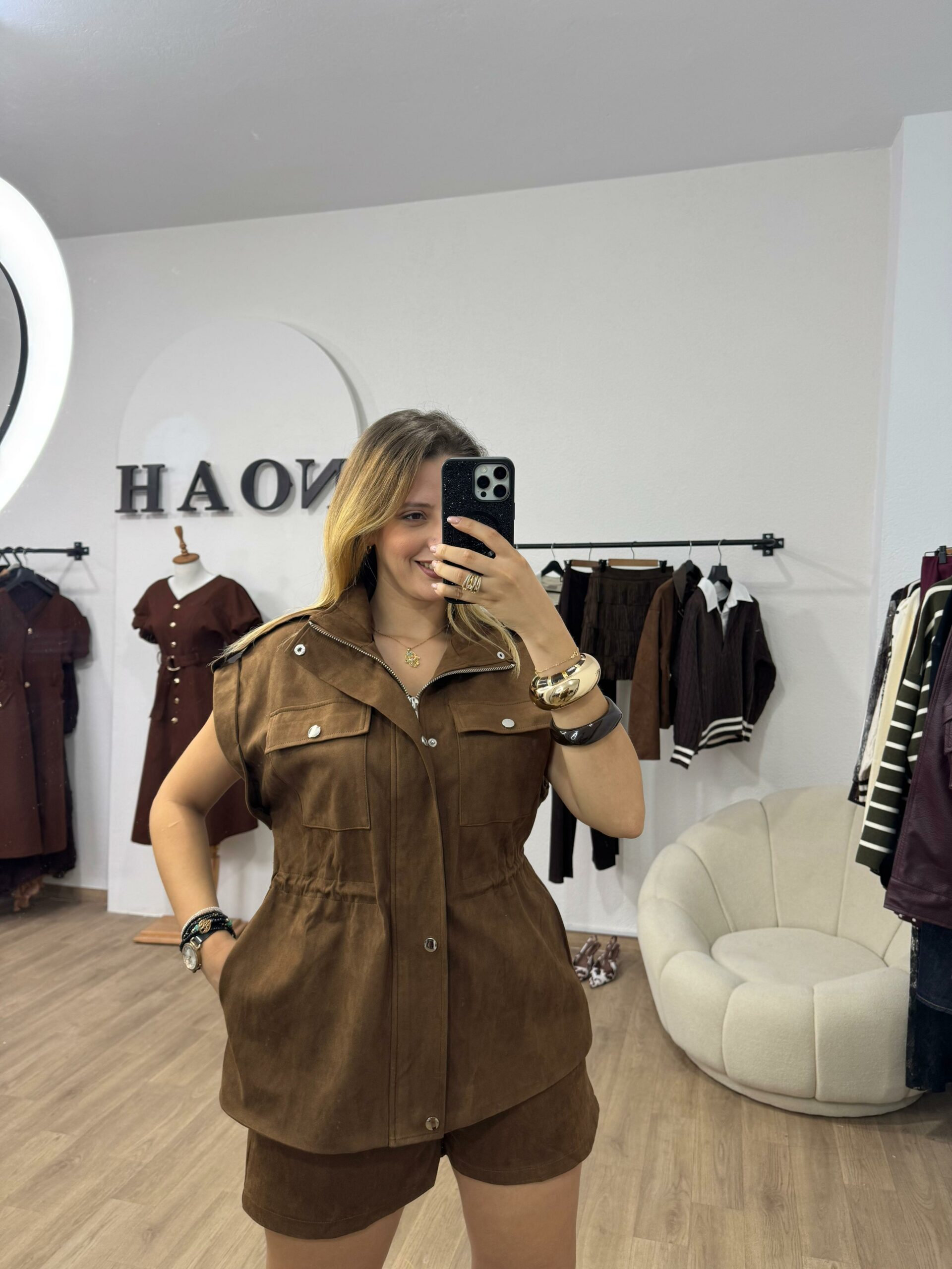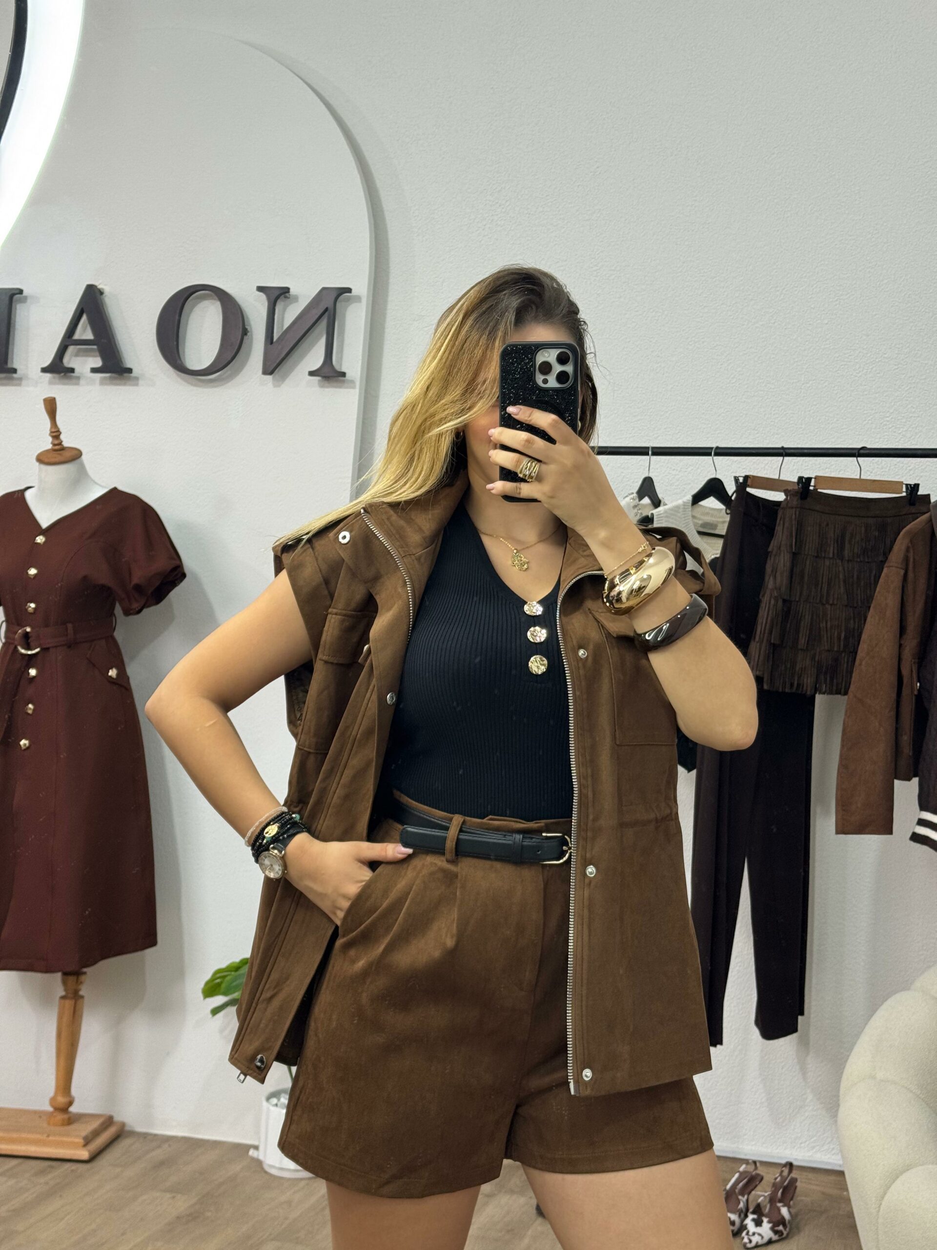 Veste sans manches en daim au style élégant et moderne, idéale pour apporter une touche raffinée à vos tenues. Sa matière douce effet suédé offre un rendu chic et confortable, parfait pour la mi-saison. Facile à superposer sur une chemise, un pull ou une robe, cette veste structure la silhouette tout en restant légère. Un indispensable pour un look tendance, à la fois casual et sophistiqué 🤎✨