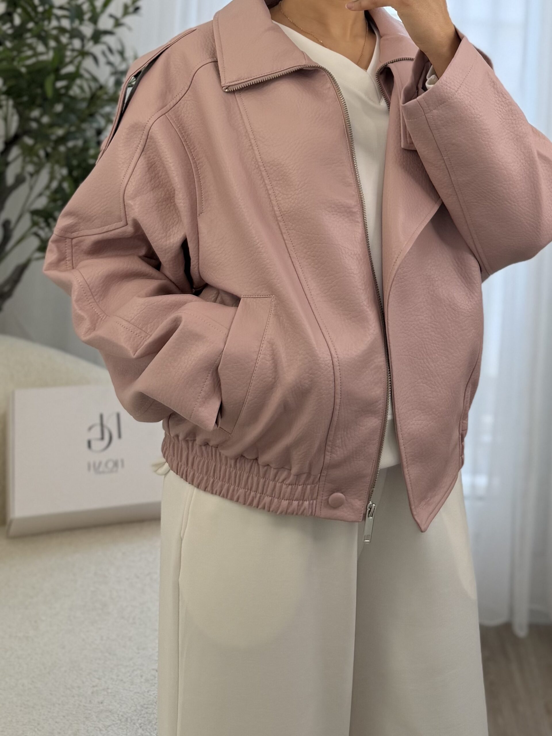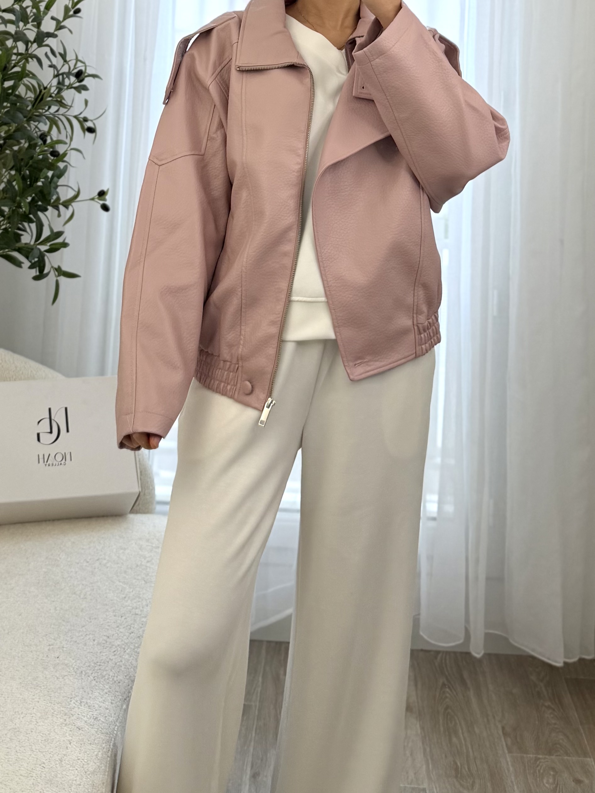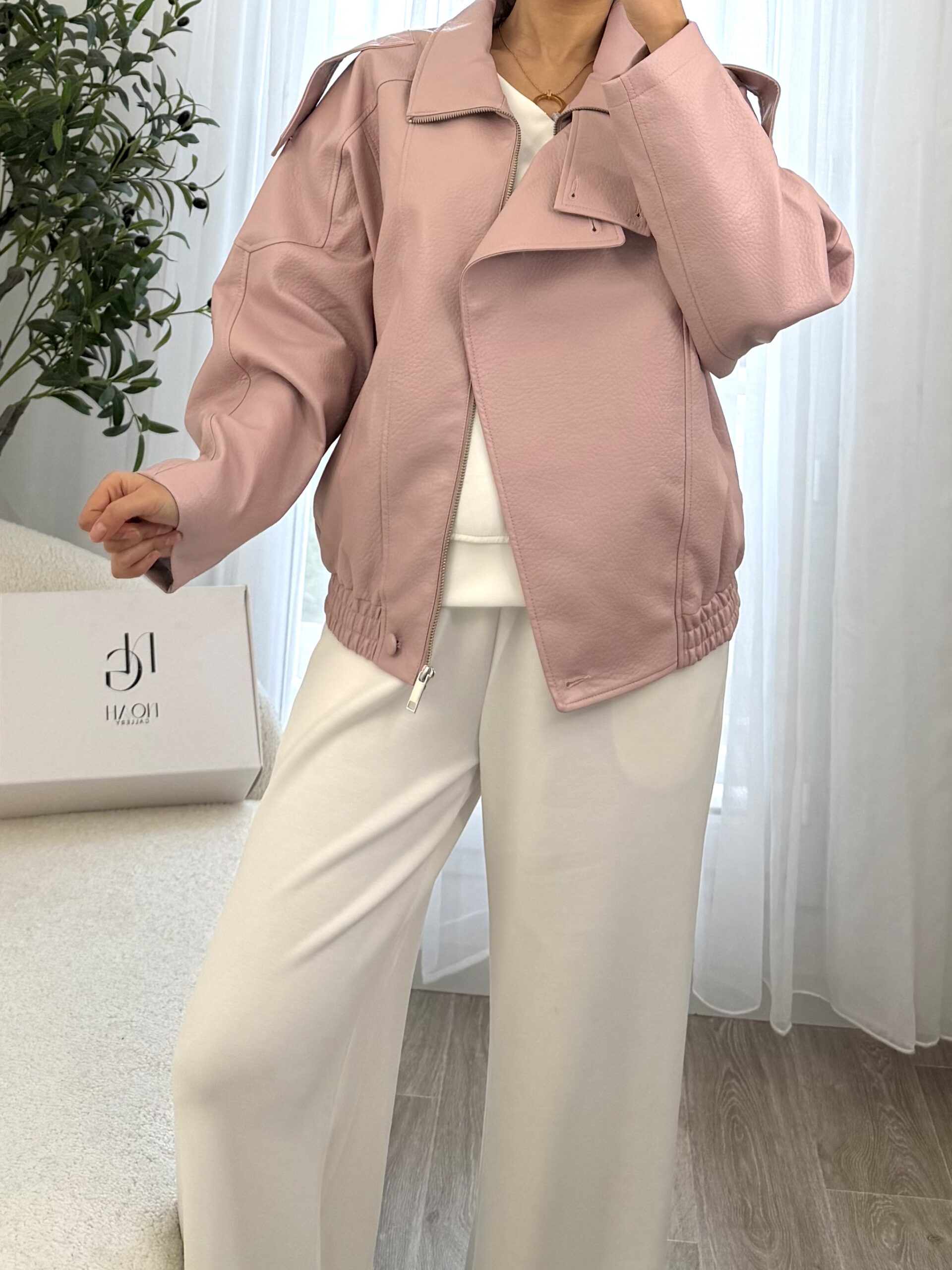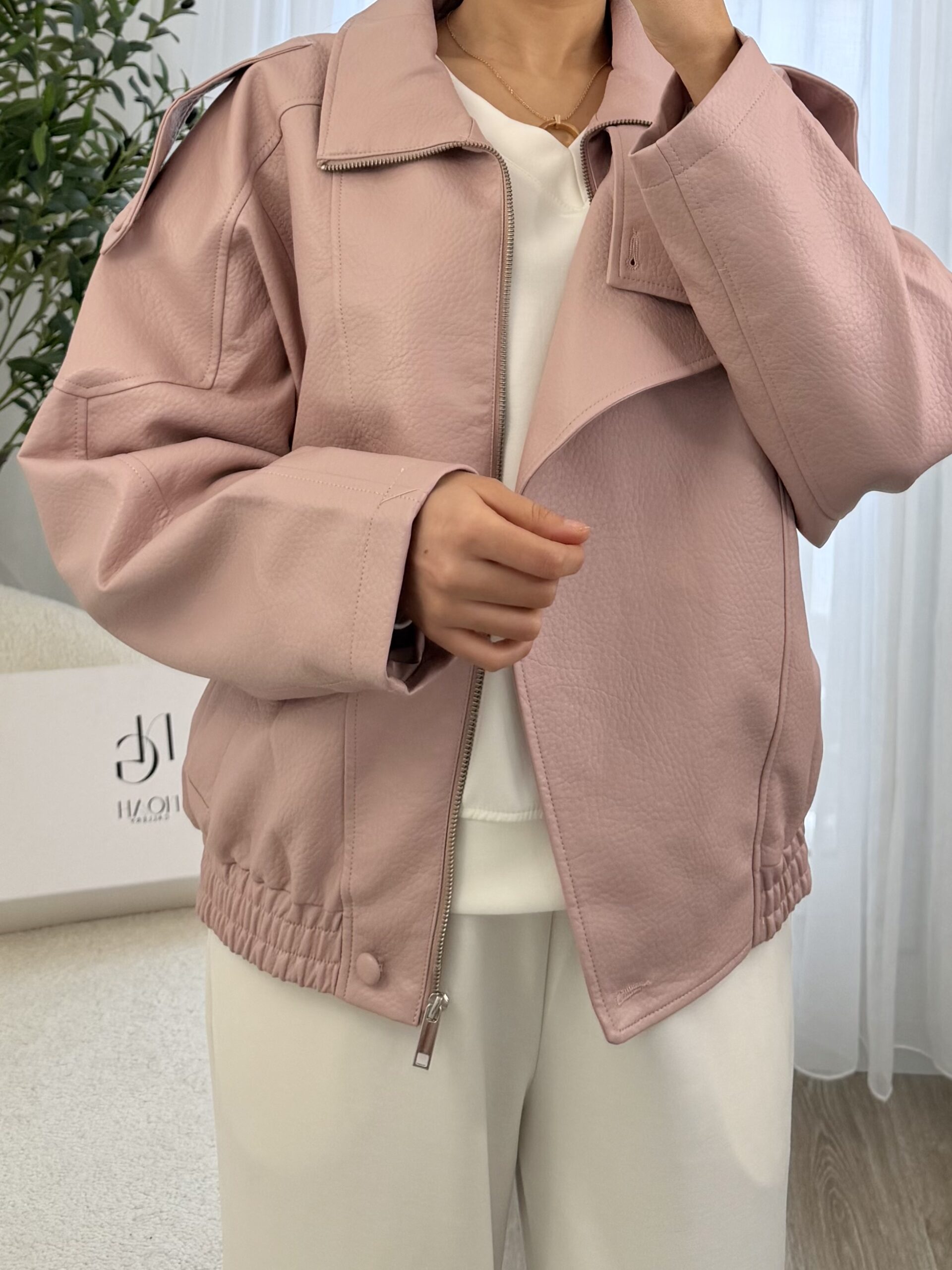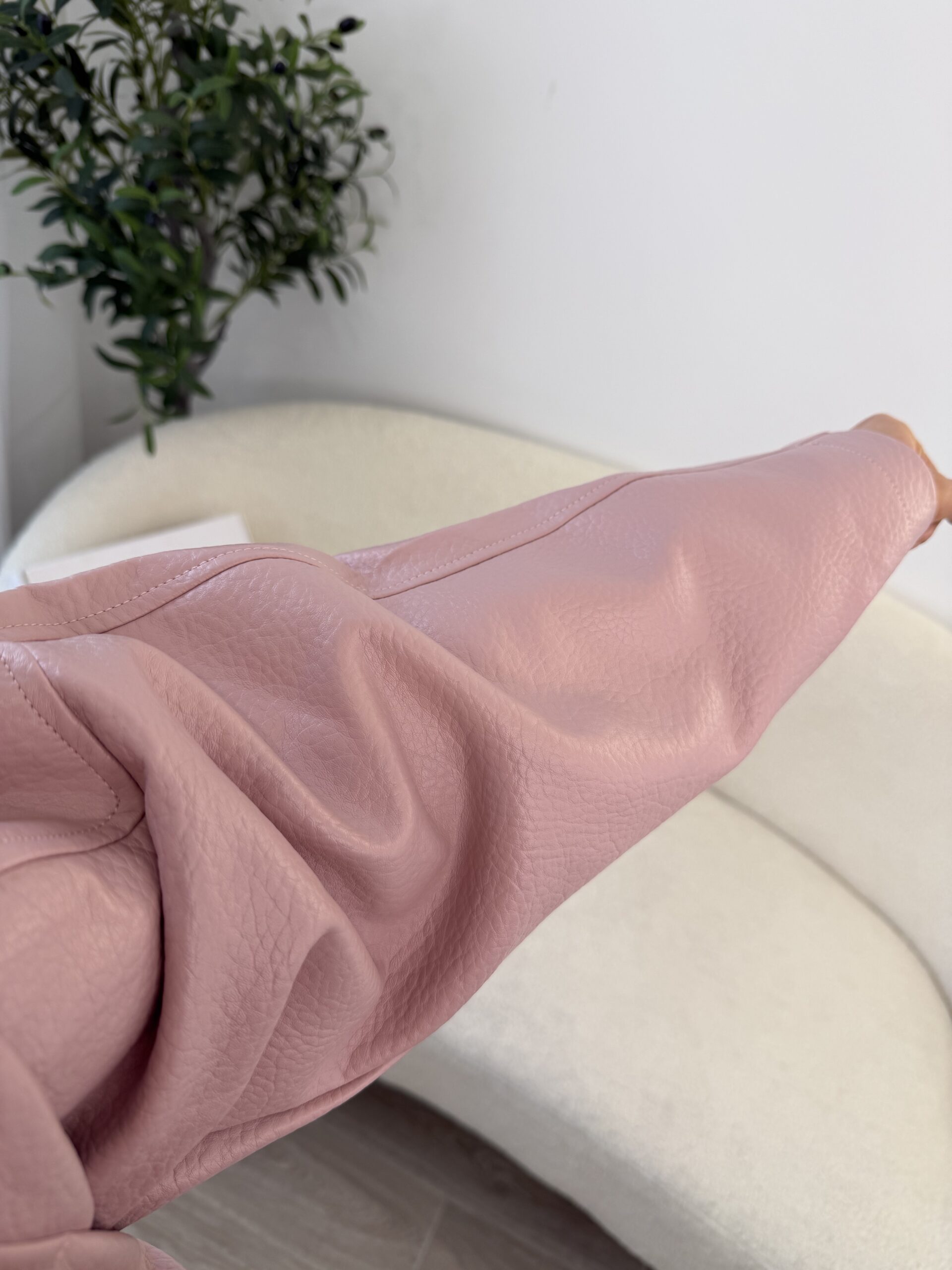 Veste style biker en matière effet cuir souple, au coloris rose poudré doux et moderne. Sa coupe tendance et ses détails structurés apportent une touche chic et féminine, parfaite pour compléter un look casual ou habillé.