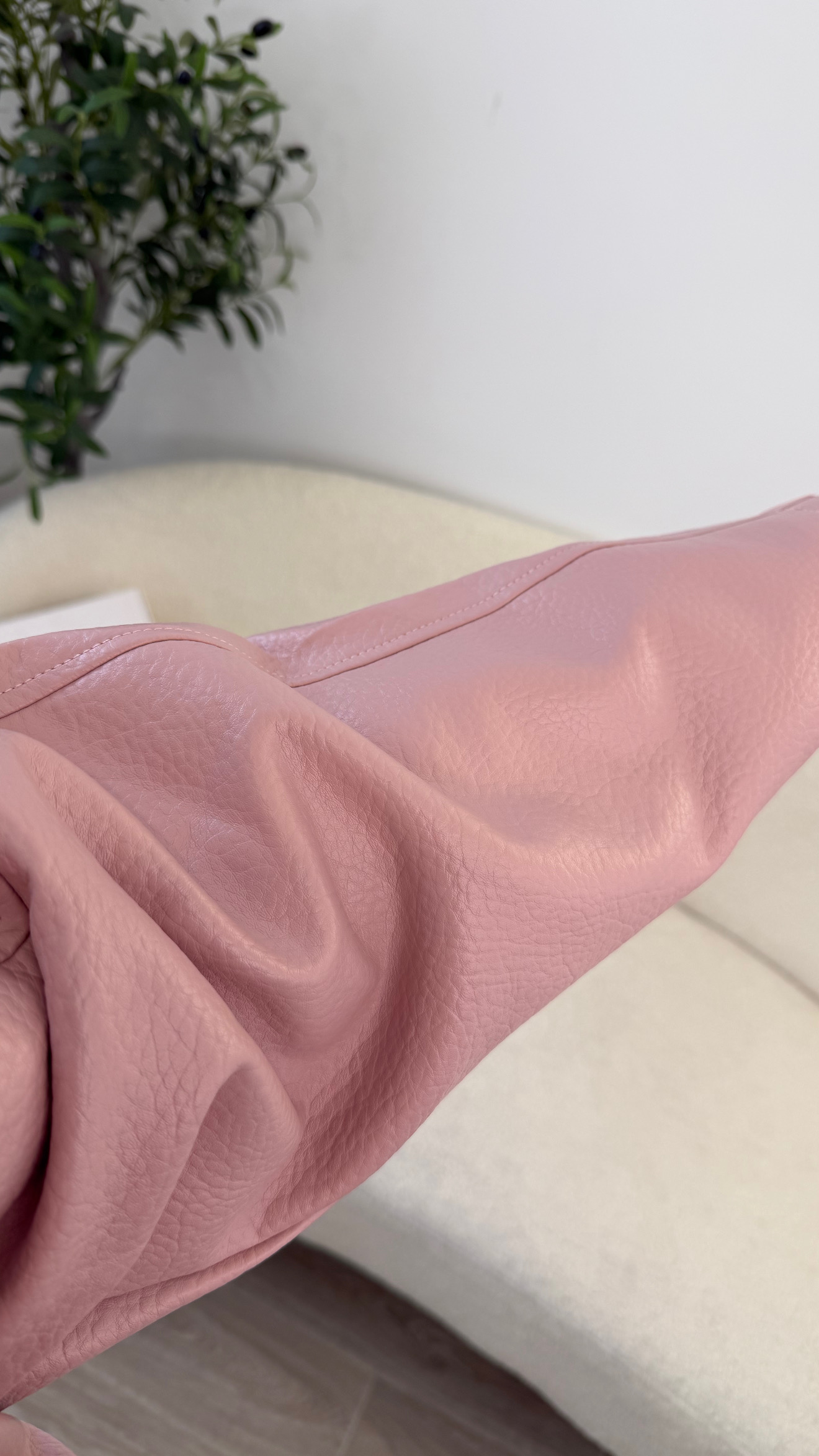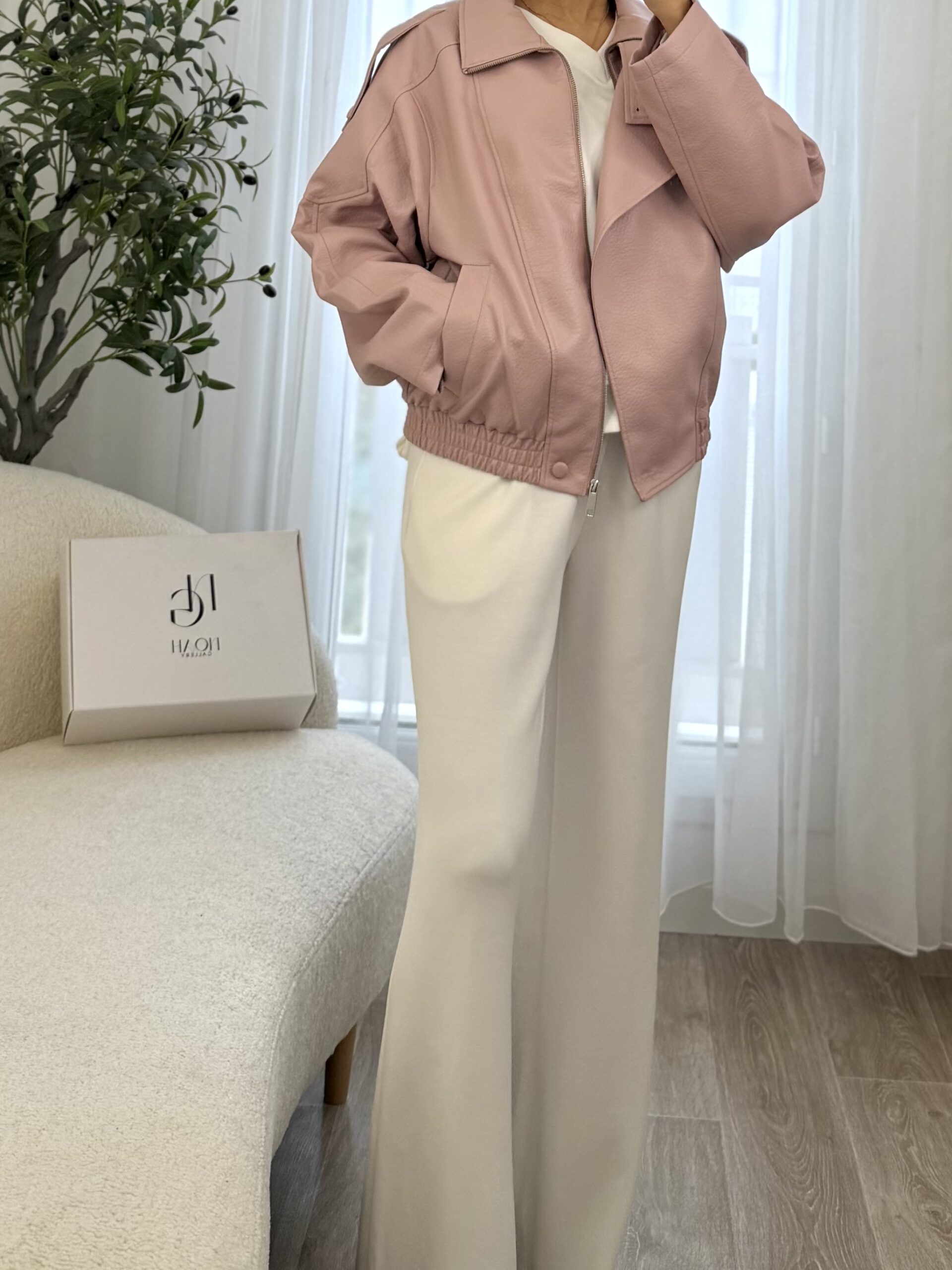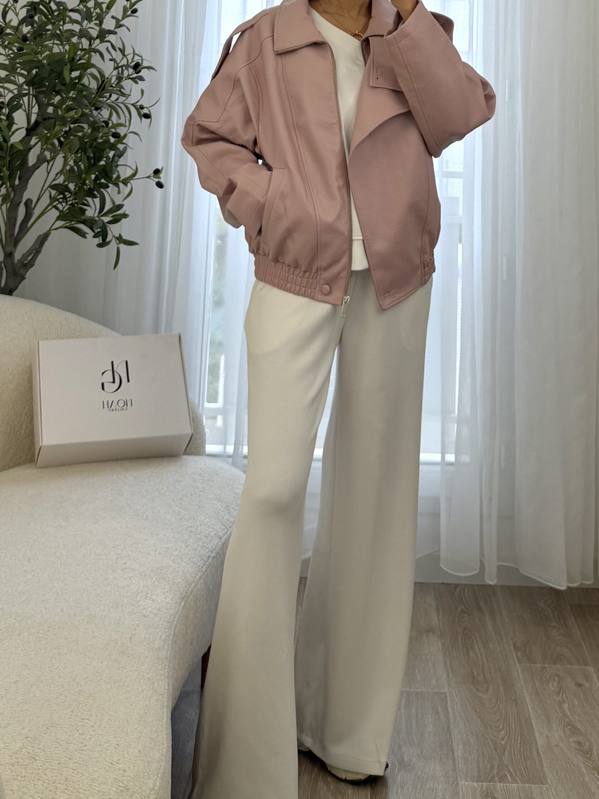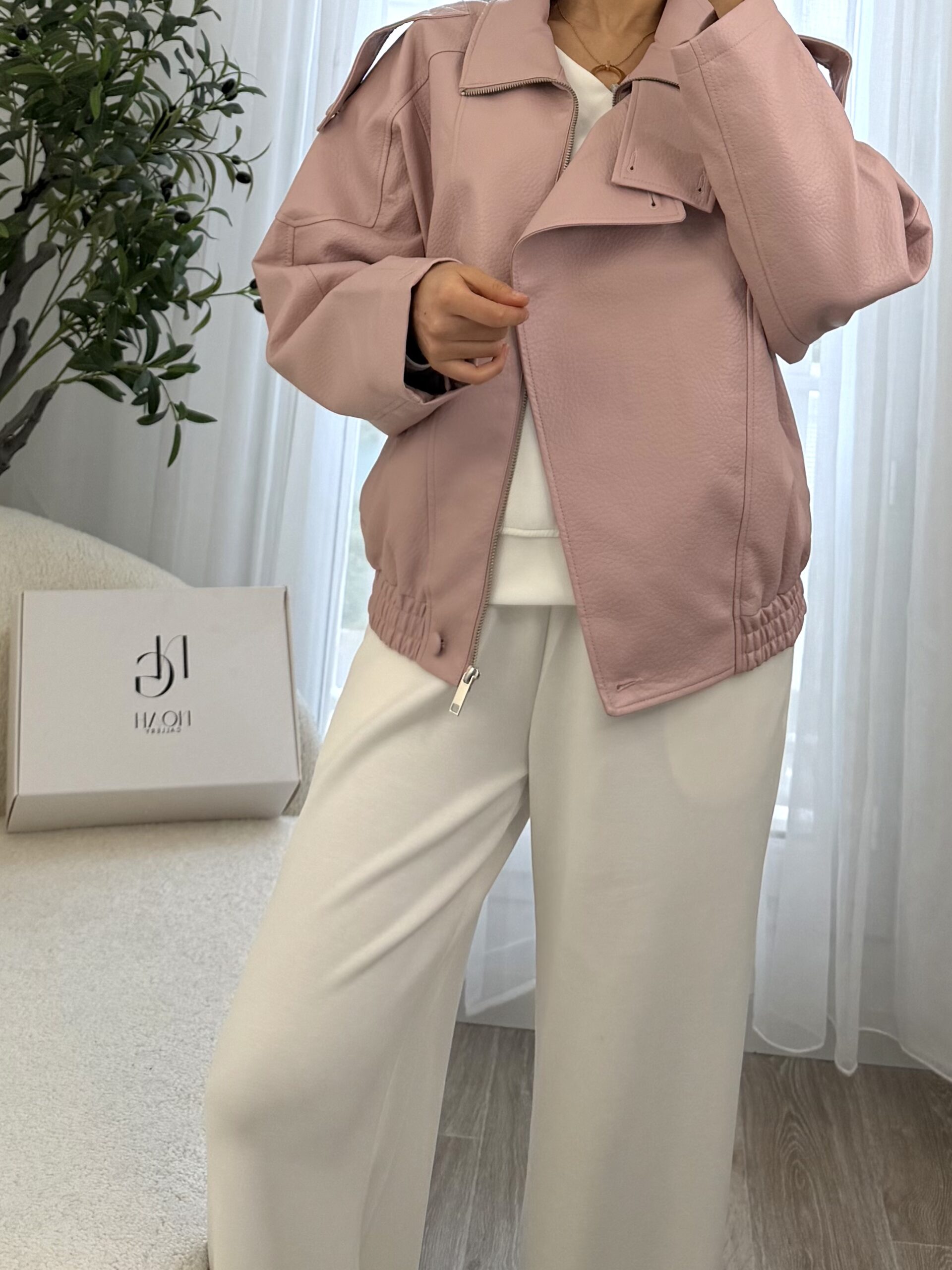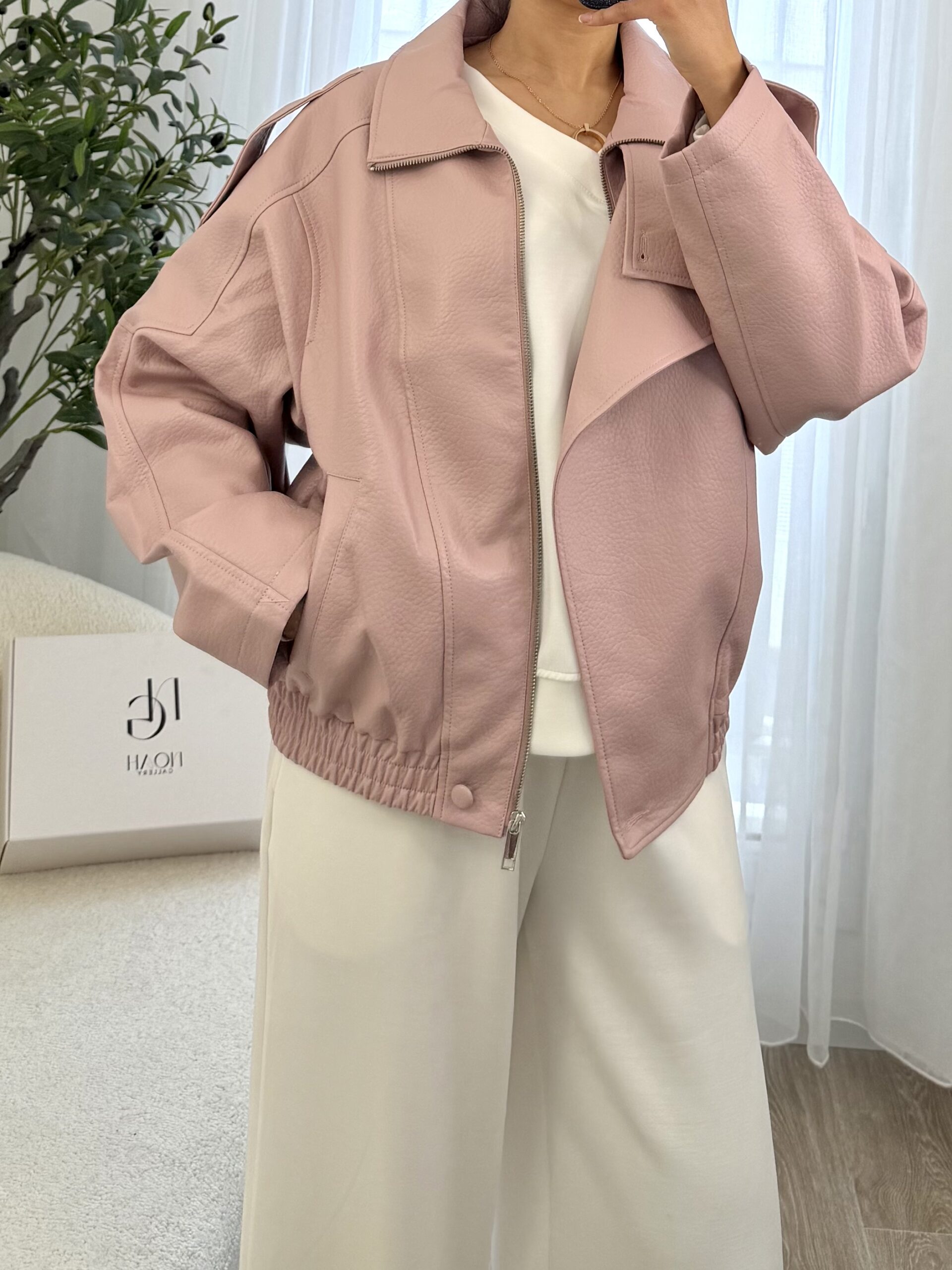 Veste style biker en matière effet cuir souple, au coloris rose poudré doux et moderne. Sa coupe tendance et ses détails structurés apportent une touche chic et féminine, parfaite pour compléter un look casual ou habillé.