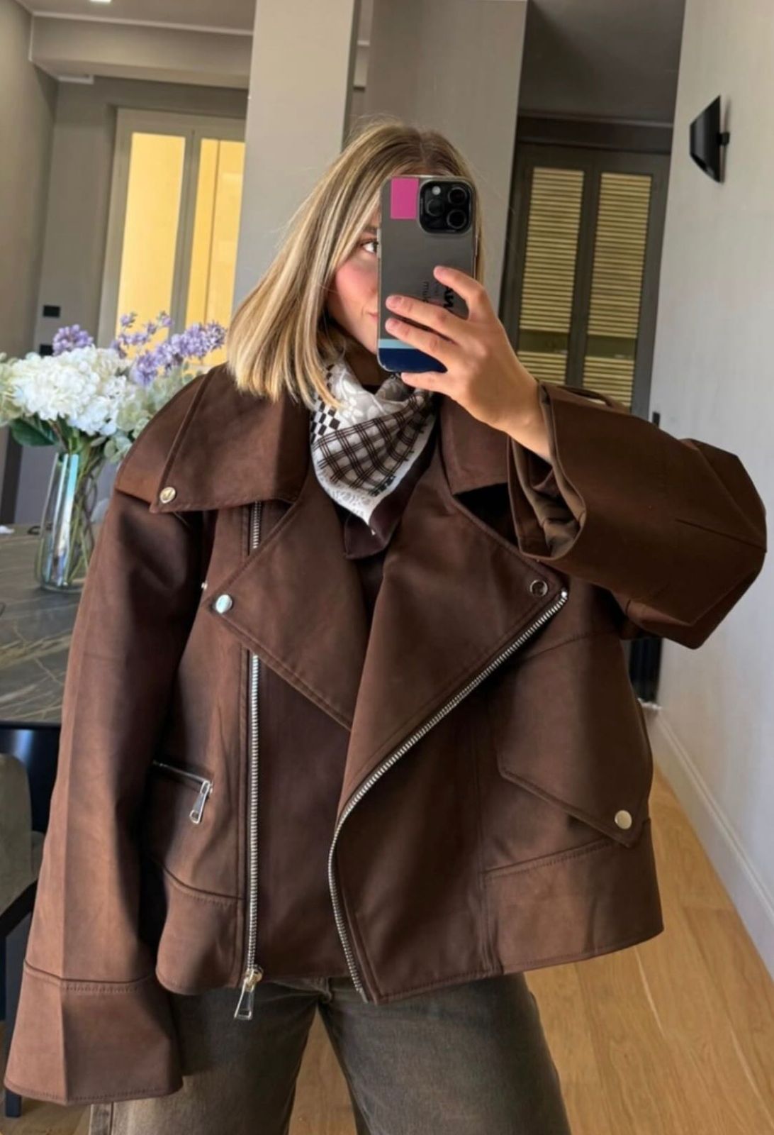 Cette veste biker oversize apporte une touche audacieuse et moderne à n’importe quel look. Avec sa coupe ample et sa fermeture zippée asymétrique, elle combine parfaitement style urbain et confort. Ses épaules structurées et ses détails métalliques lui donnent un caractère affirmé tout en restant facile à porter au quotidien. Associée à une jupe plissée ou un jean, elle crée un look tendance, dynamique et plein de personnalité. Une pièce incontournable pour celles qui aiment l’allure cool et stylée.
