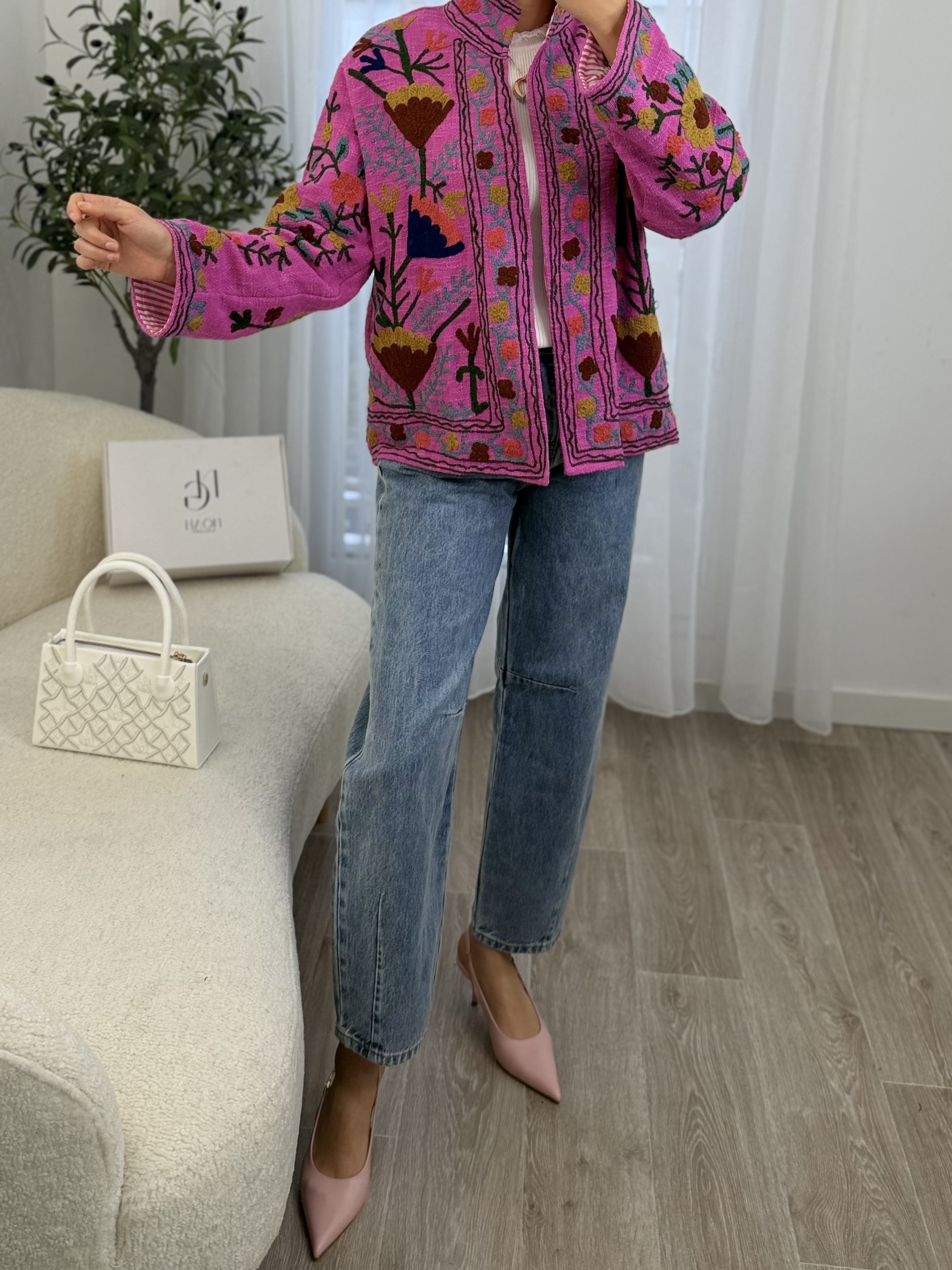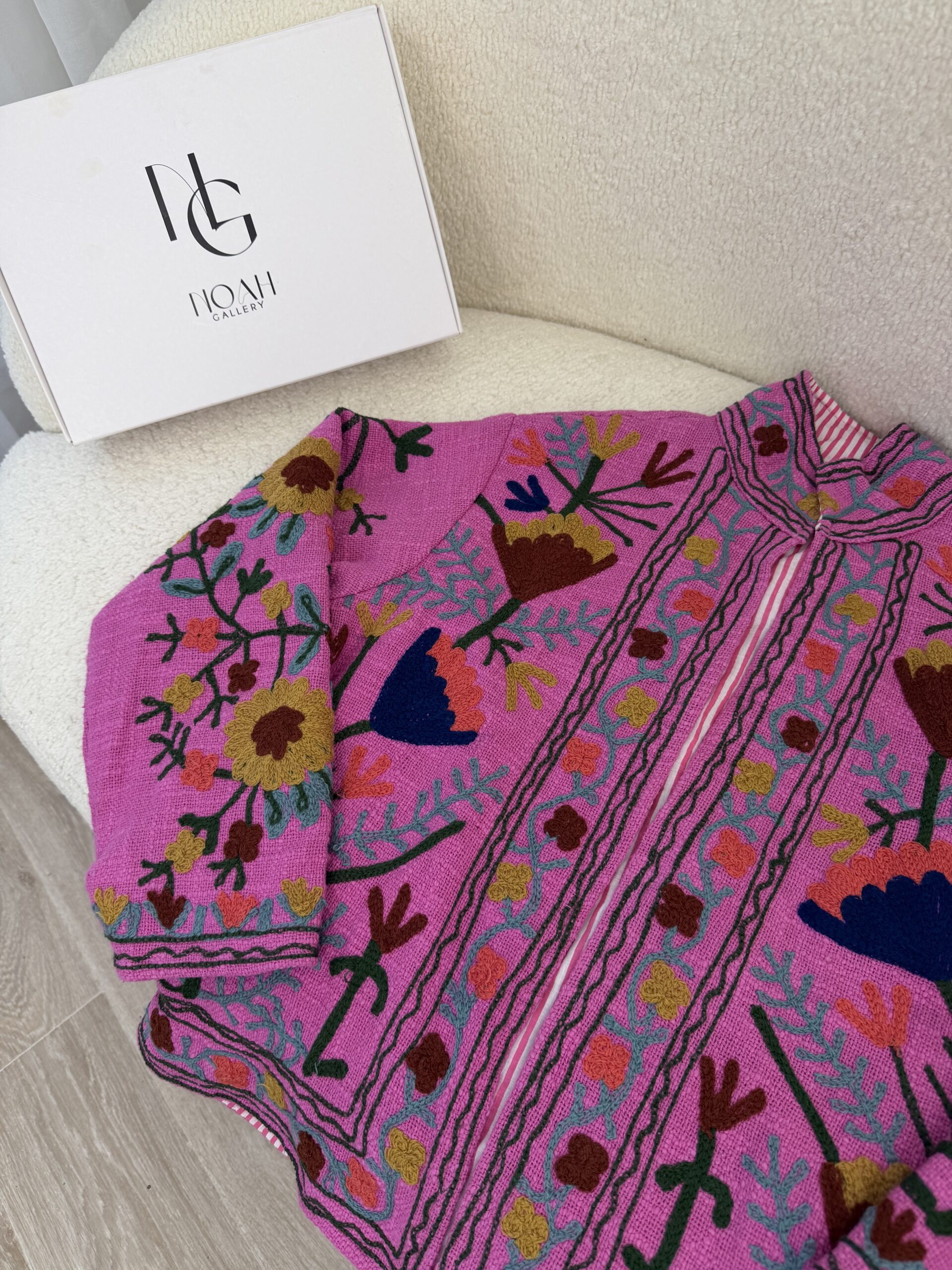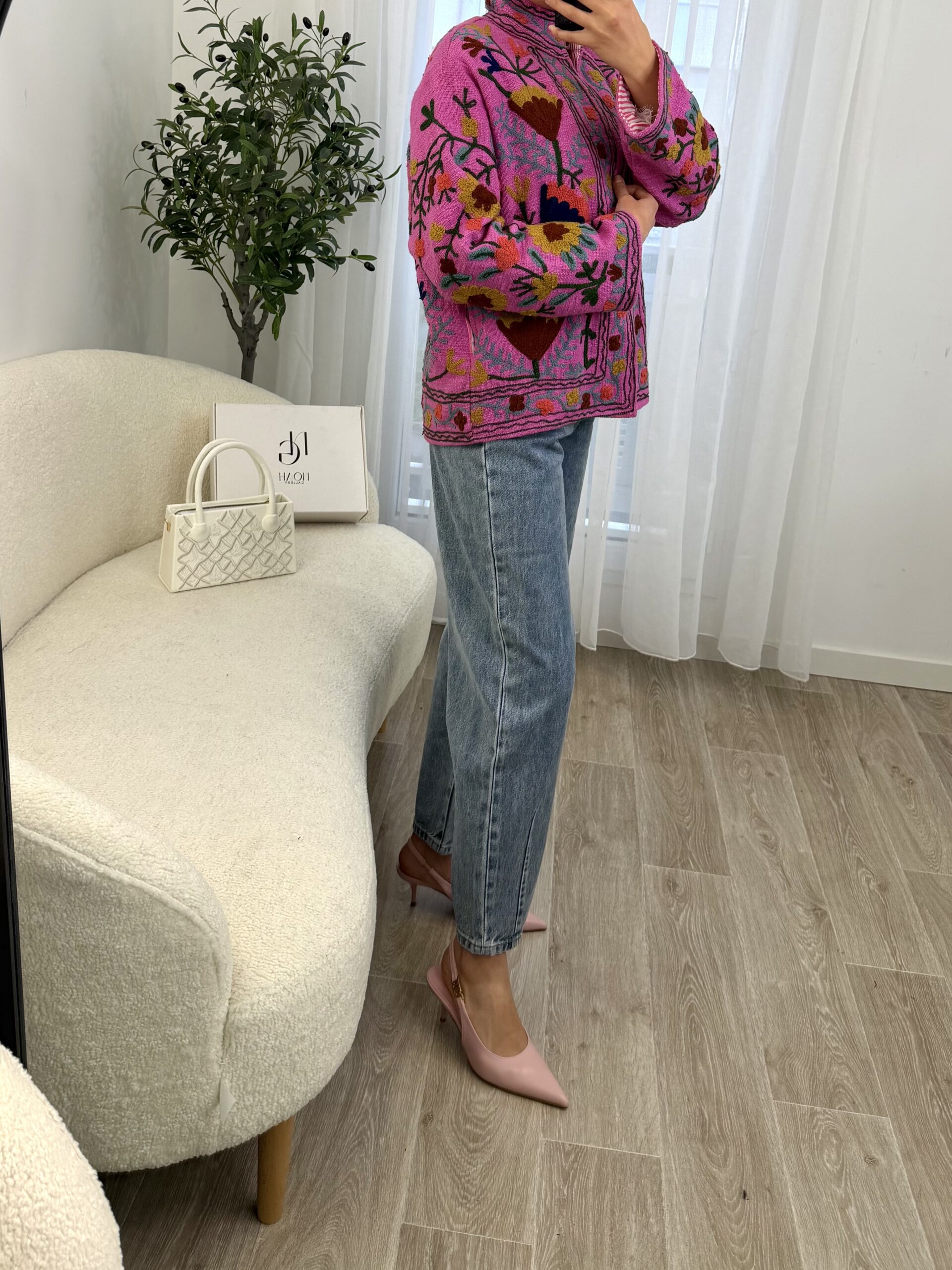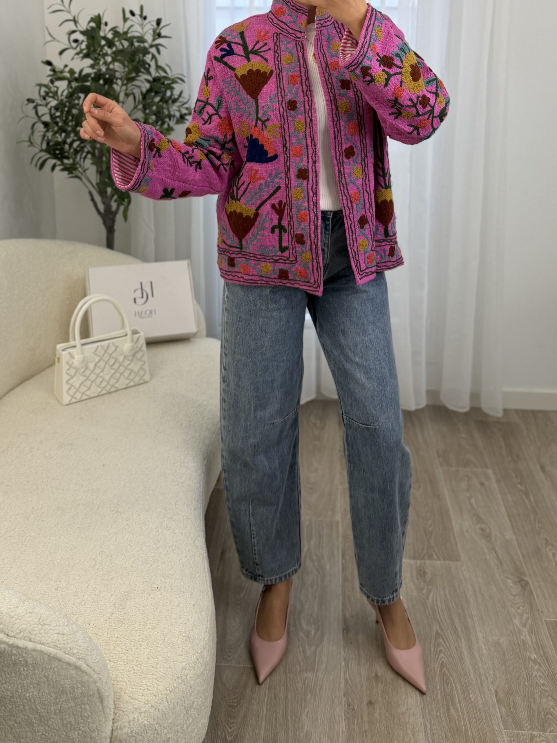 Veste artisanale au style bohème, entièrement brodée à la main avec de magnifiques motifs floraux colorés. Son rose vibrant et ses détails travaillés apportent une touche originale et lumineuse à la silhouette.