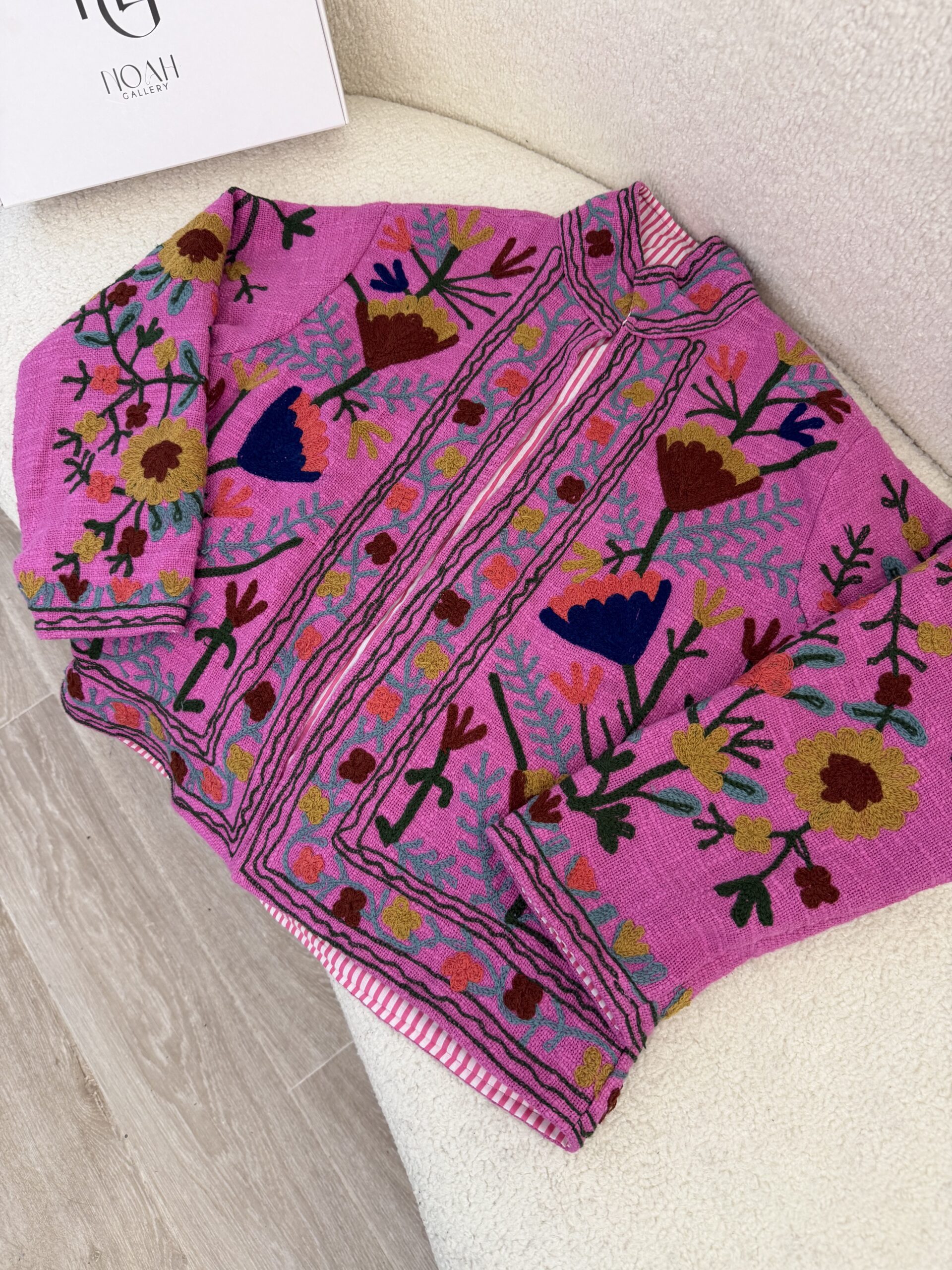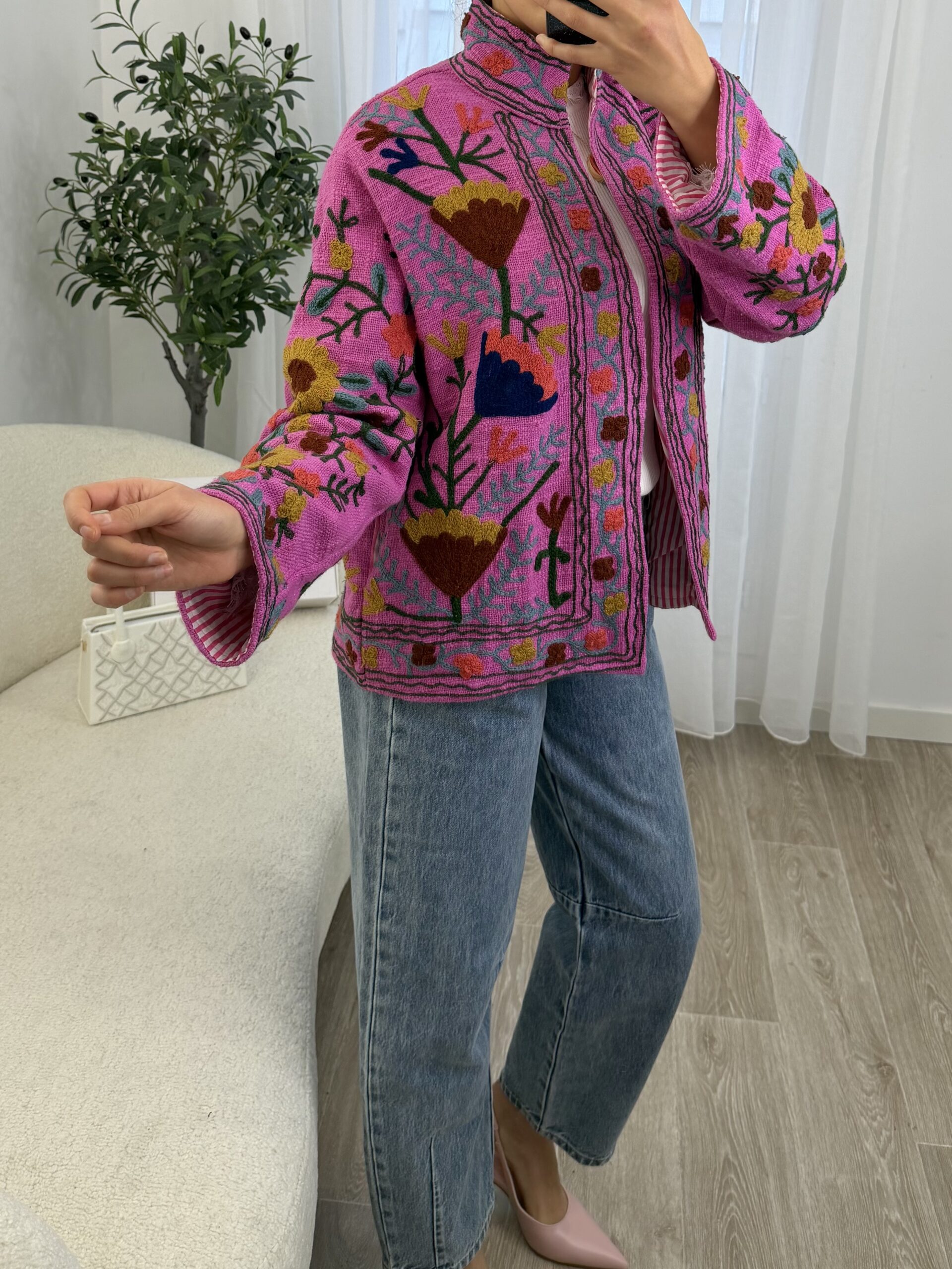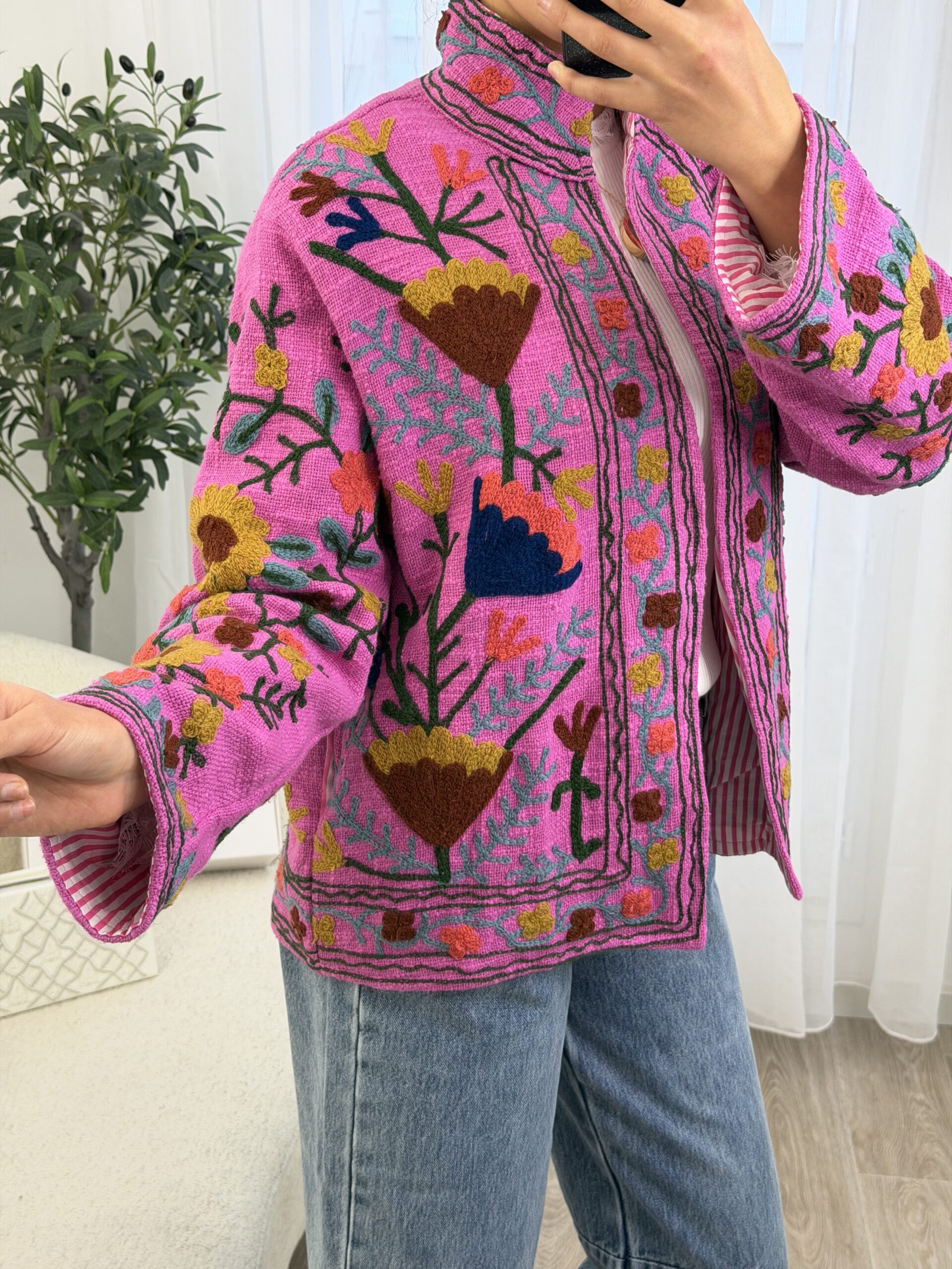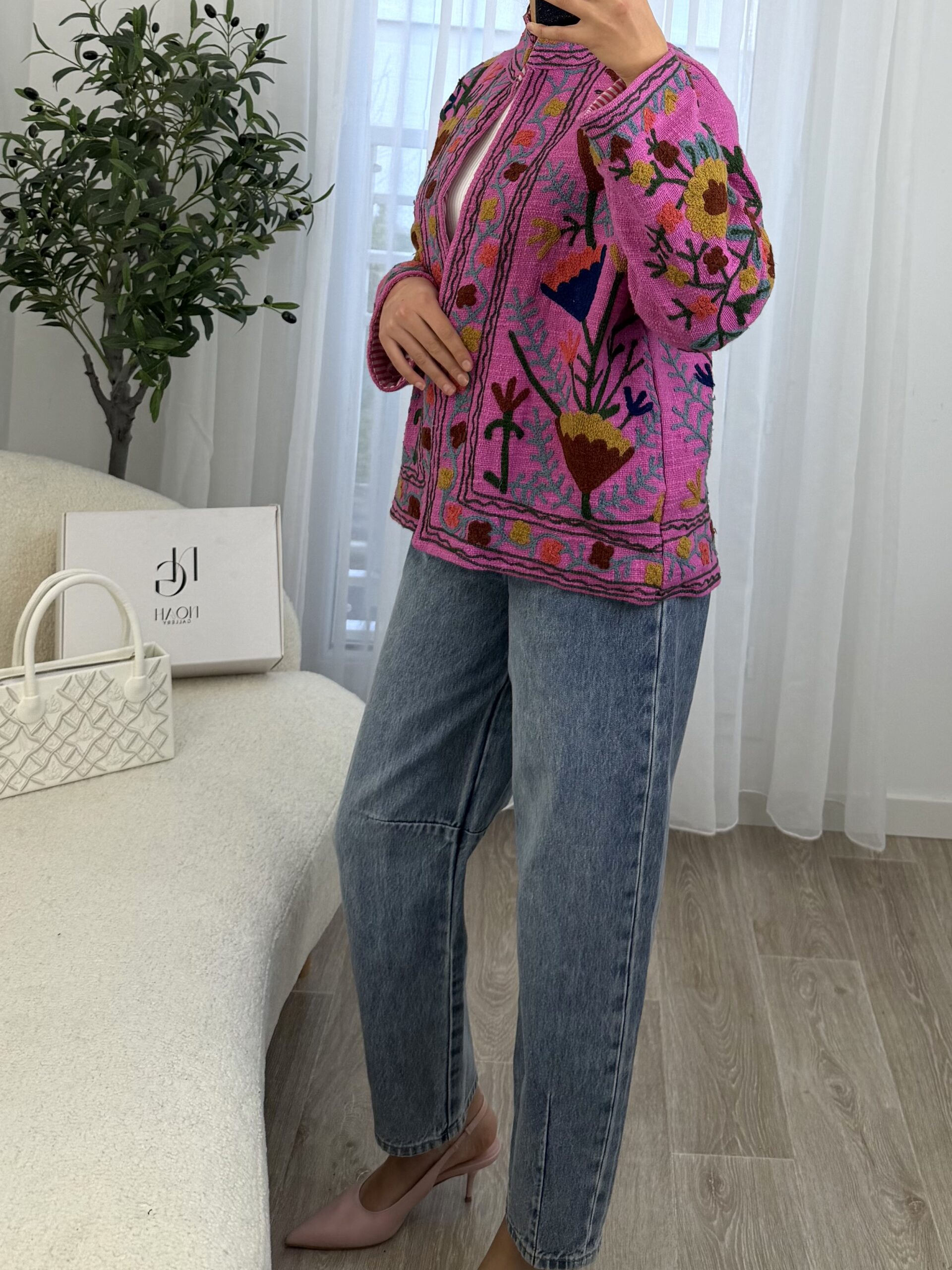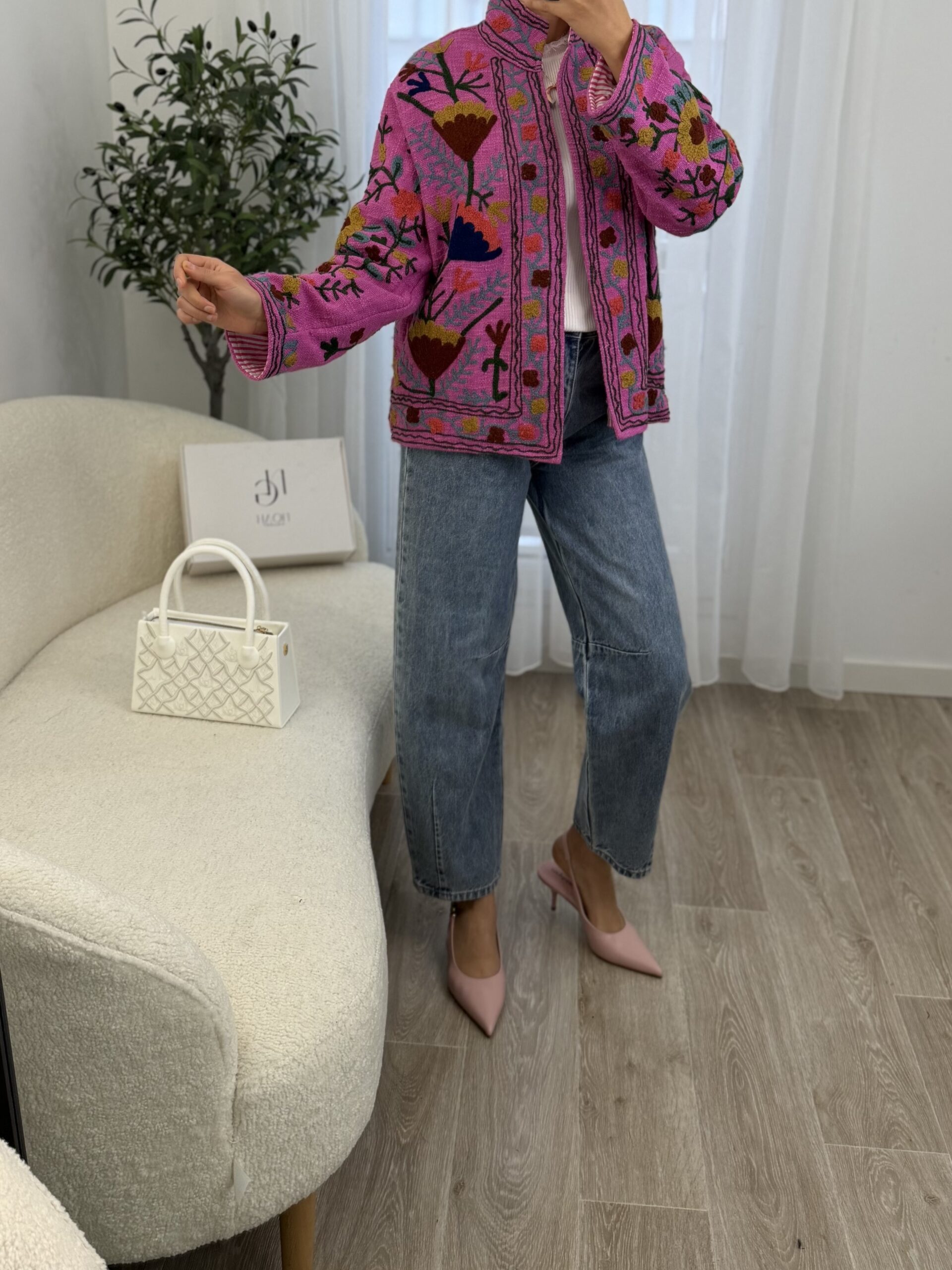 Veste artisanale au style bohème, entièrement brodée à la main avec de magnifiques motifs floraux colorés. Son rose vibrant et ses détails travaillés apportent une touche originale et lumineuse à la silhouette.