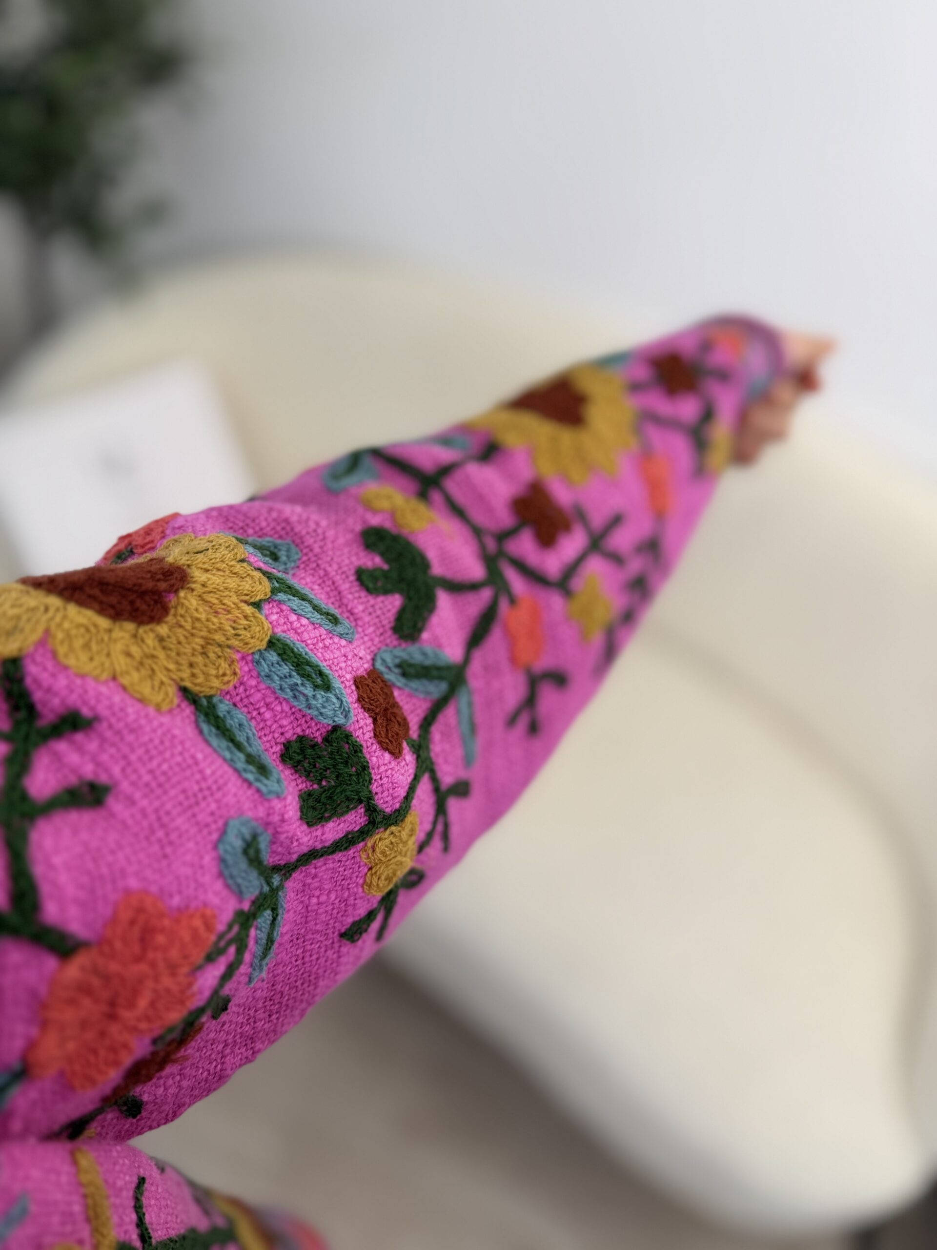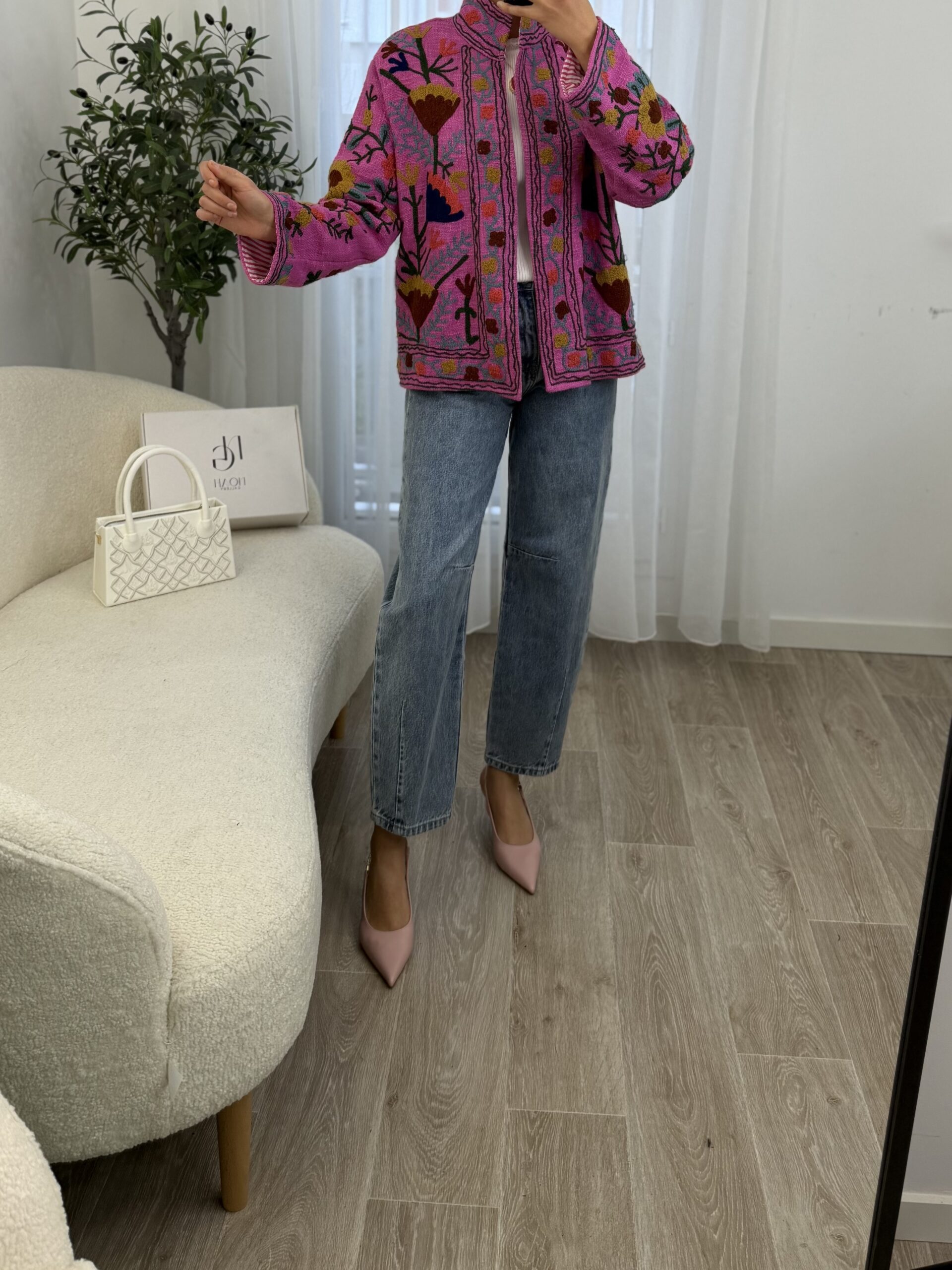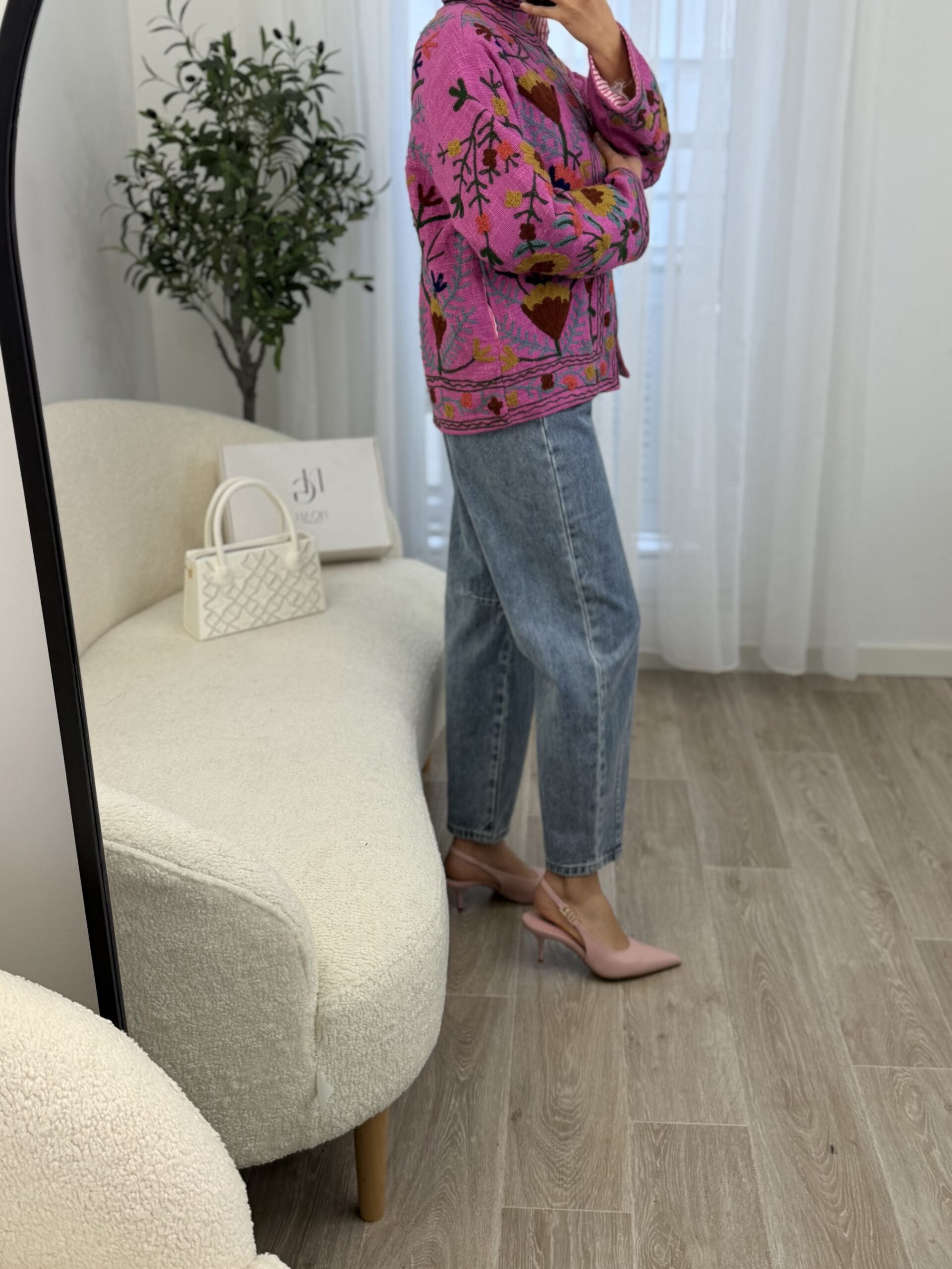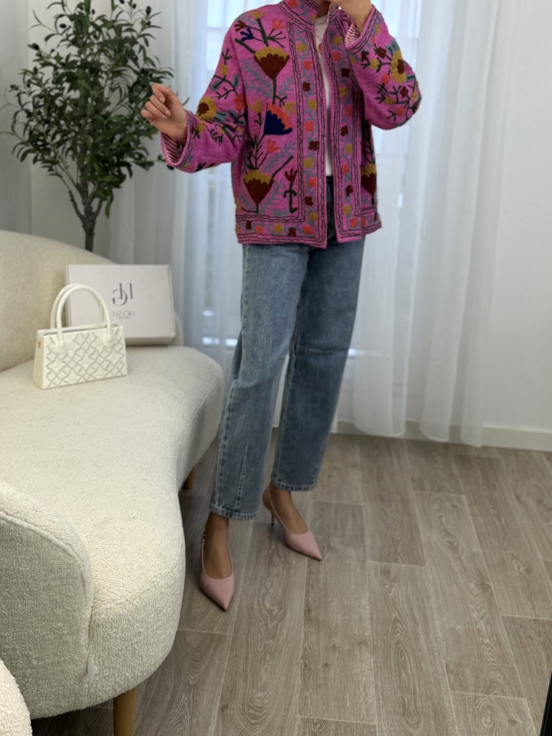 Veste artisanale au style bohème, entièrement brodée à la main avec de magnifiques motifs floraux colorés. Son rose vibrant et ses détails travaillés apportent une touche originale et lumineuse à la silhouette.