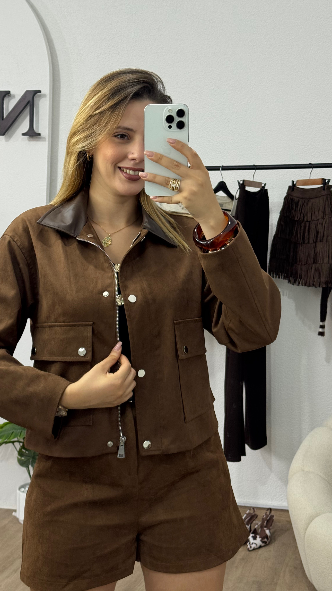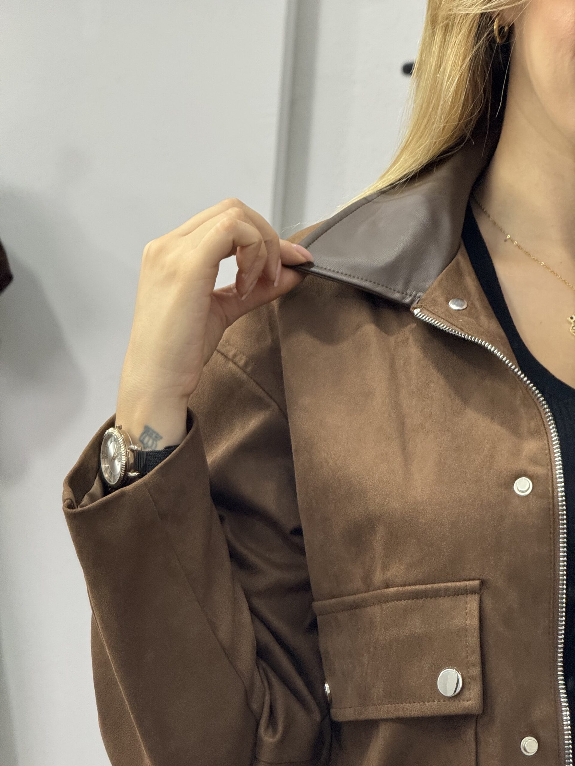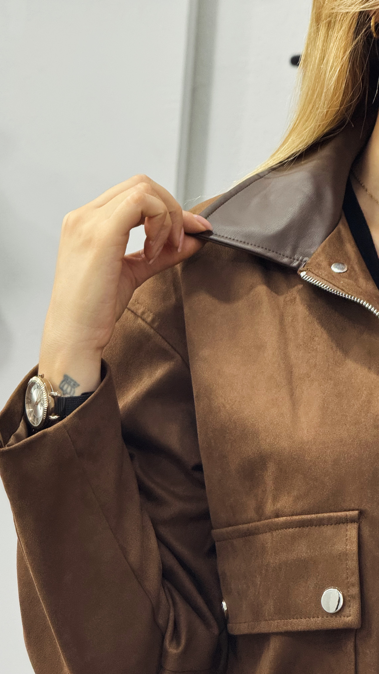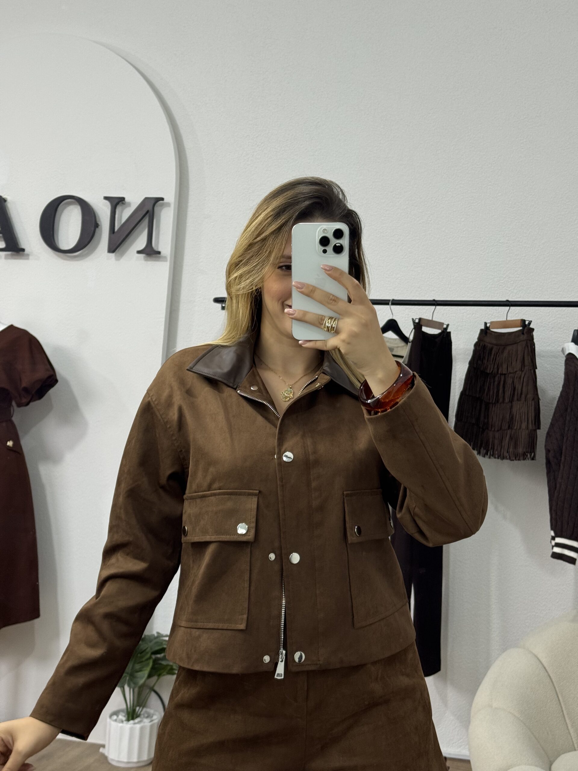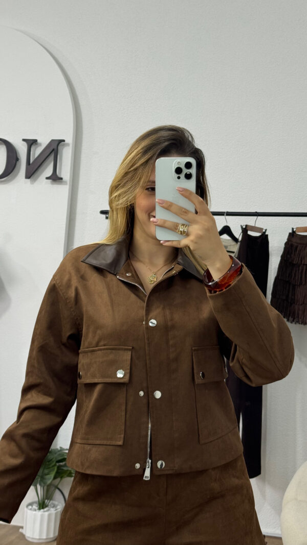 Cette veste en suédine couleur chocolat apporte une touche chic et moderne à n’importe quelle tenue. Elle présente une fermeture zippée, des boutons pression métalliques, un col contrasté effet cuir et deux poches à rabat pour un style à la fois élégant et pratique. Sa coupe droite et sa texture douce lui donnent une allure raffinée, parfaite pour un look automnal ou casual sophistiqué.